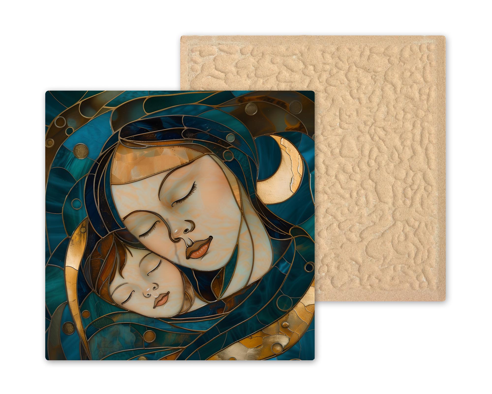 This peaceful Mother and Child wall art ceramic tile is part of a curated collection of stained glass–style home decor focused on calm, connection, and emotional warmth. The flowing composition, crescent moon accents, and layered color palette give the artwork a soft, dreamlike quality that blends easily with many interior styles.