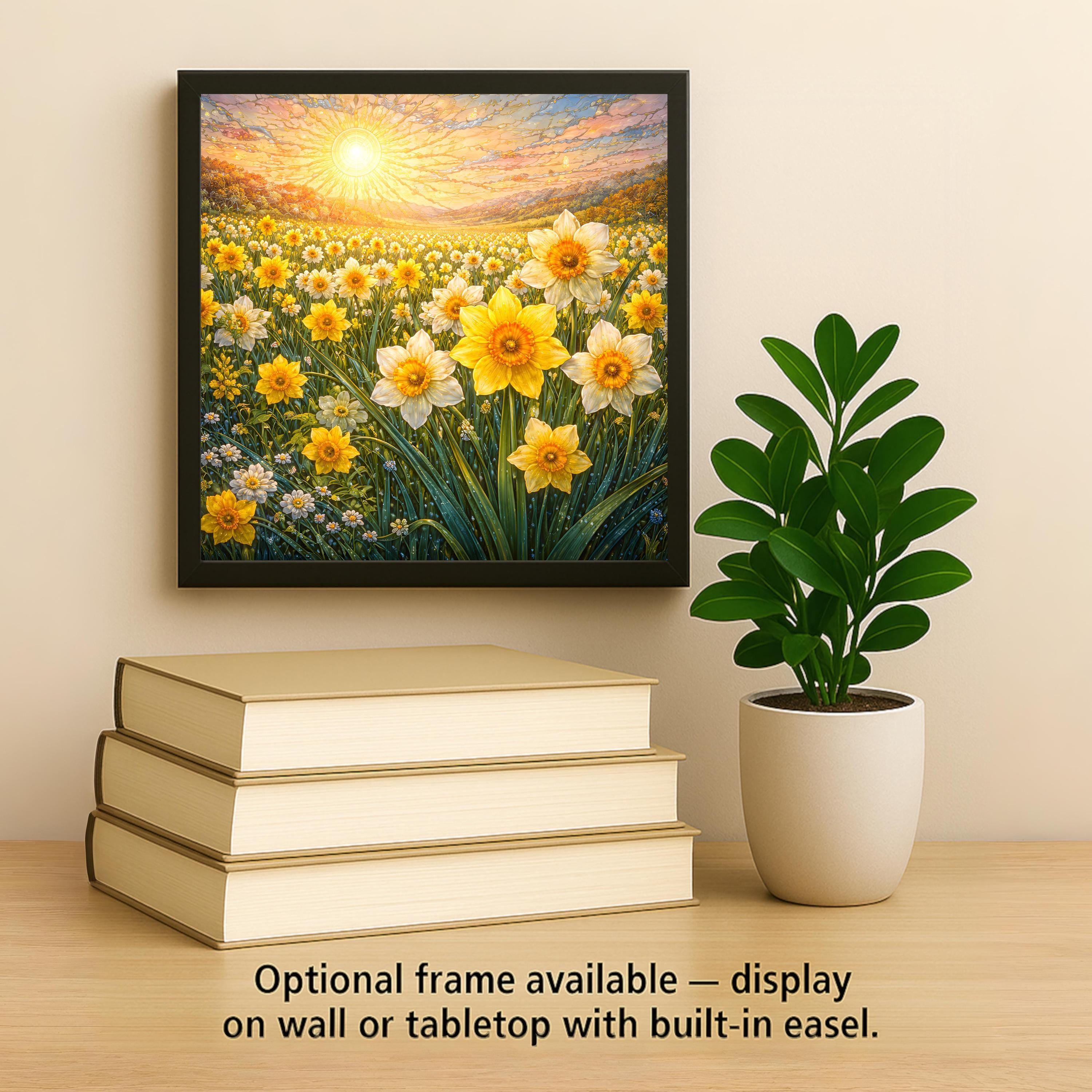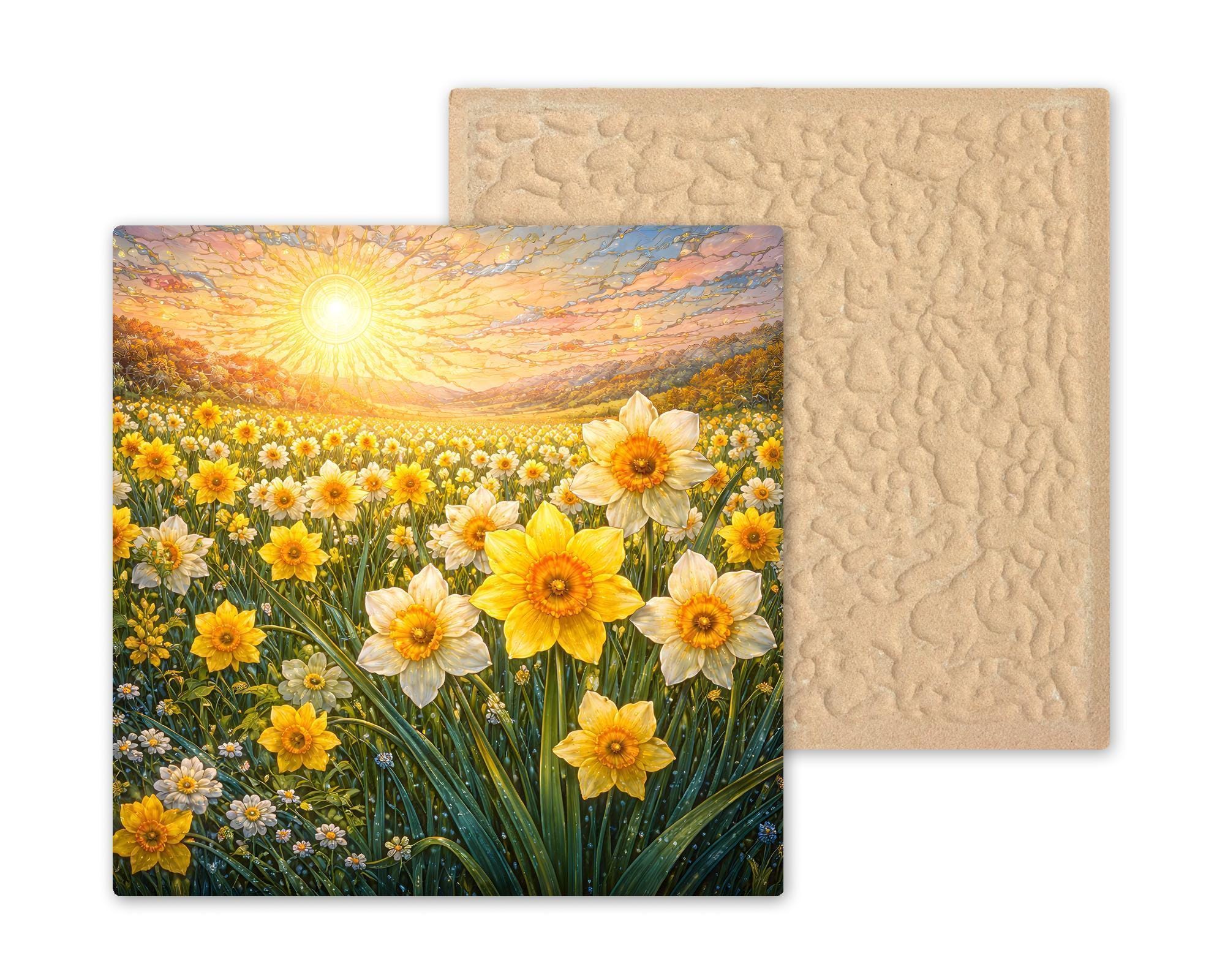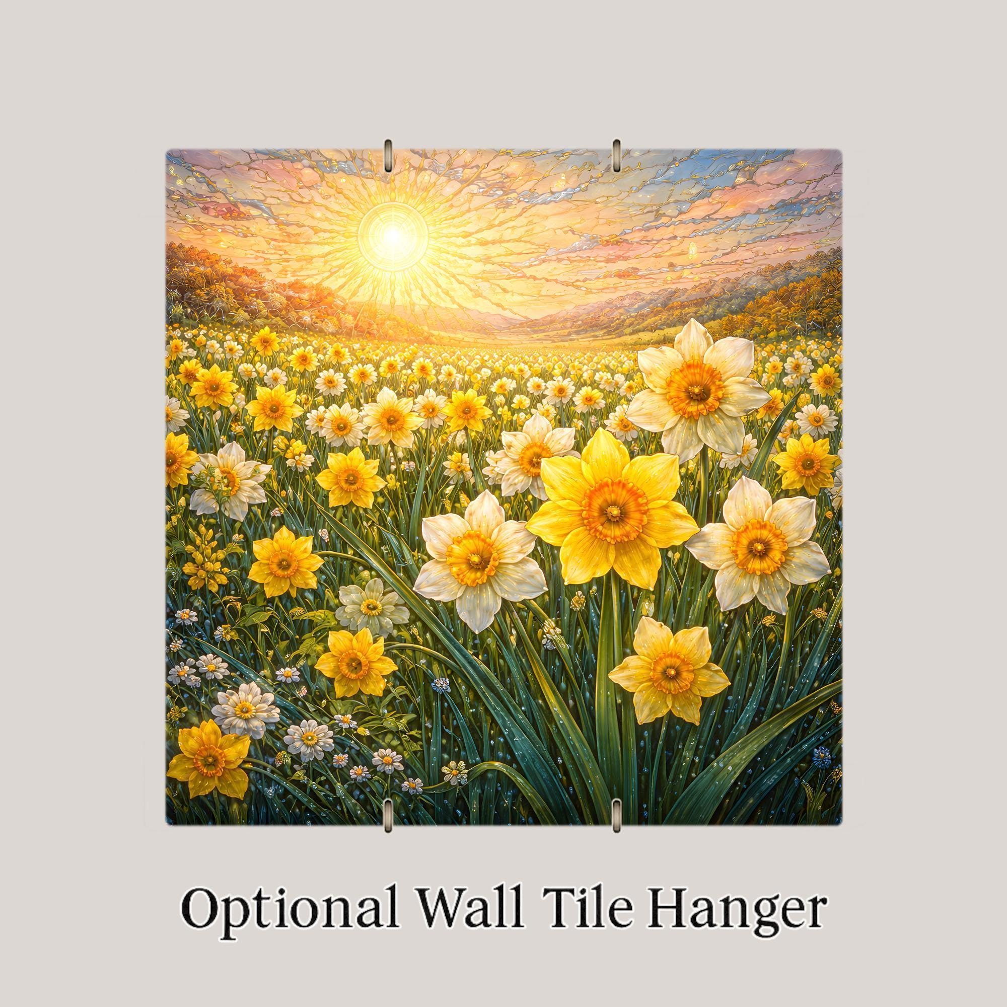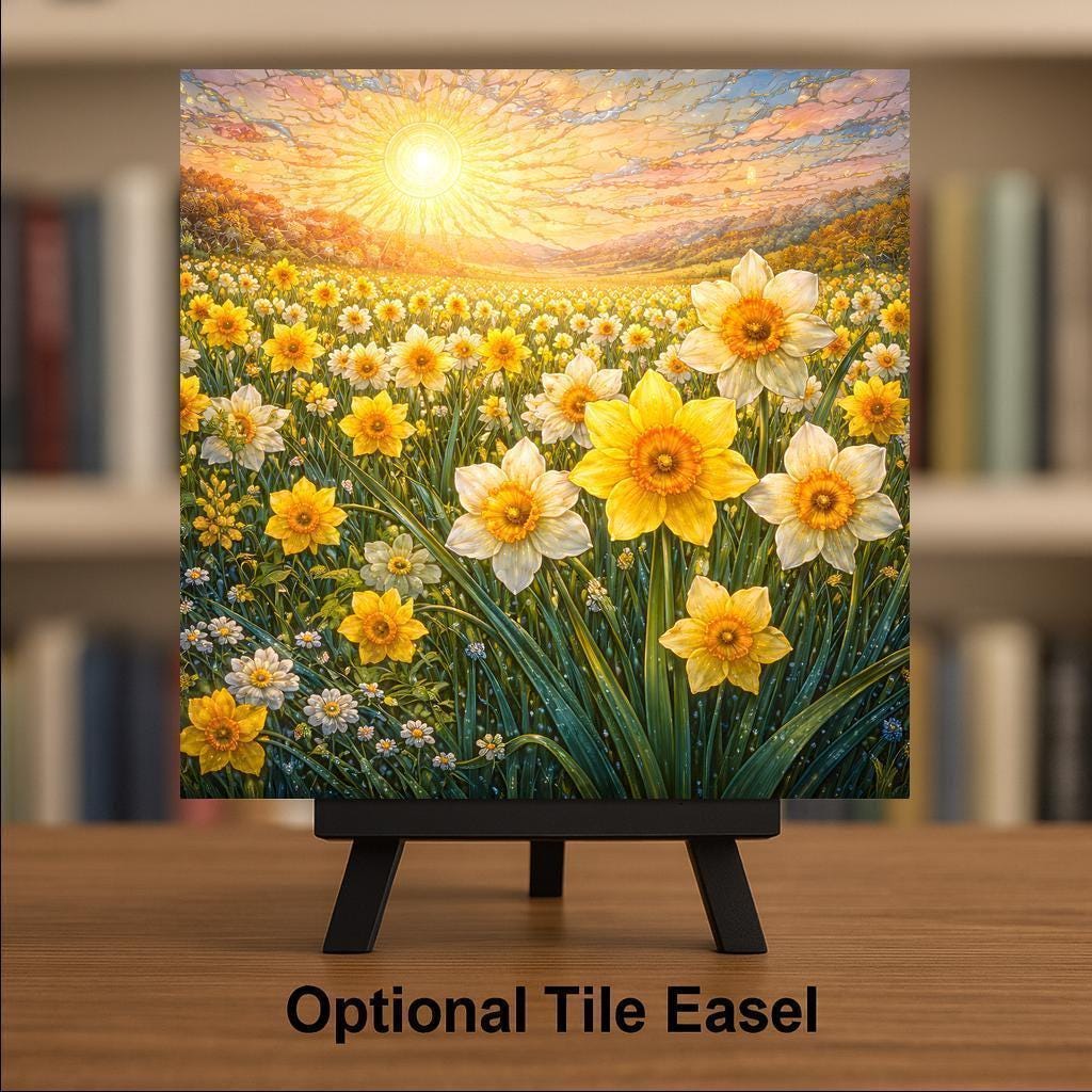 Inspired by the simple beauty of spring mornings, this daffodil field ceramic tile artwork celebrates light, growth, and the quiet joy found in nature. Rows of yellow blossoms sway beneath a radiant sun, creating a scene that feels peaceful, hopeful, and alive. The composition draws the eye gently through the landscape, making it a calming focal point for any room.