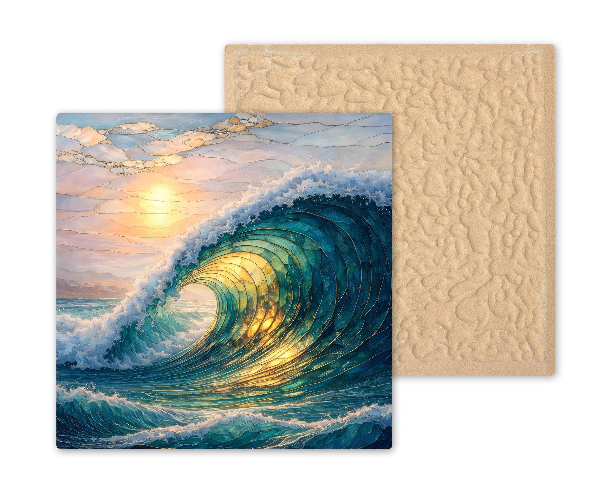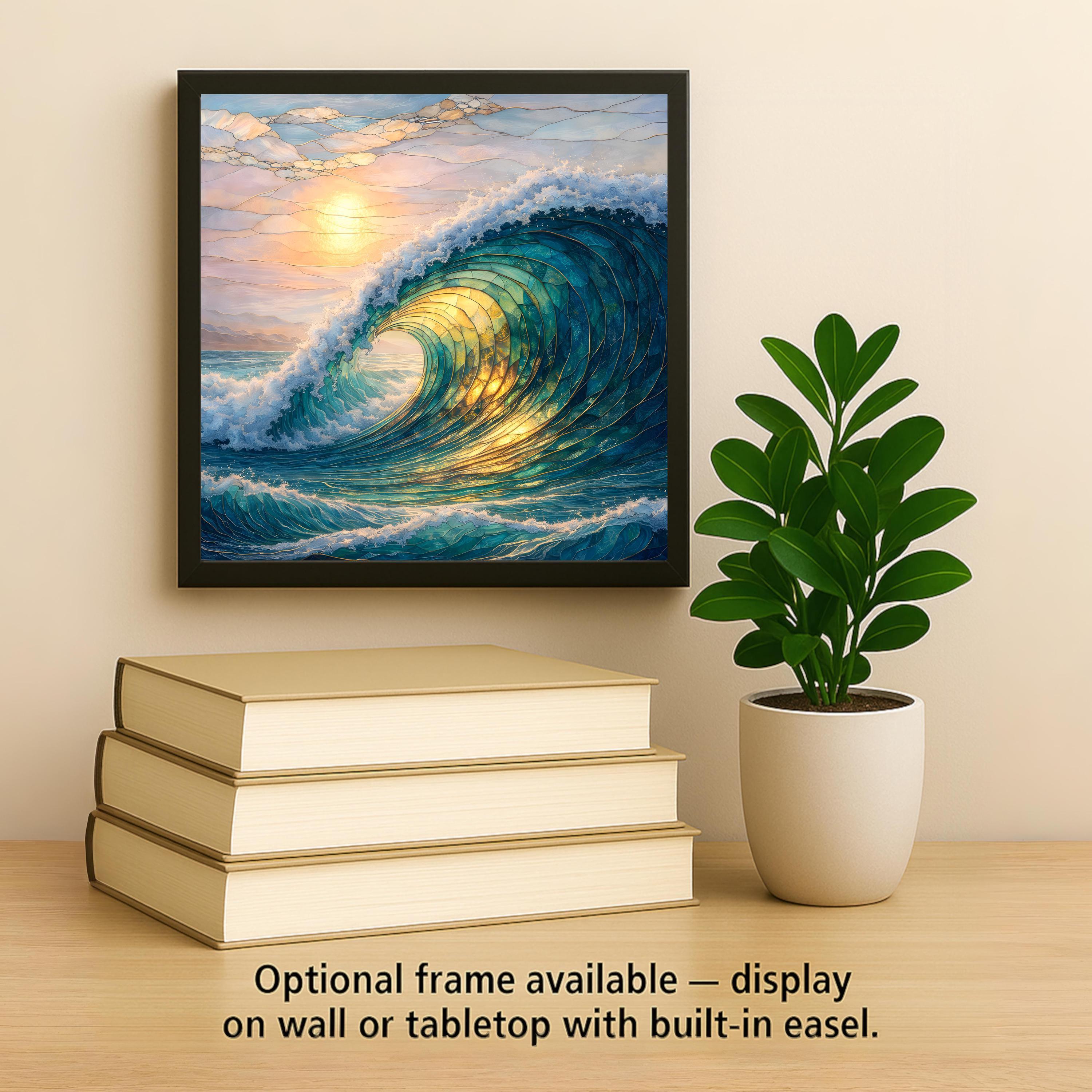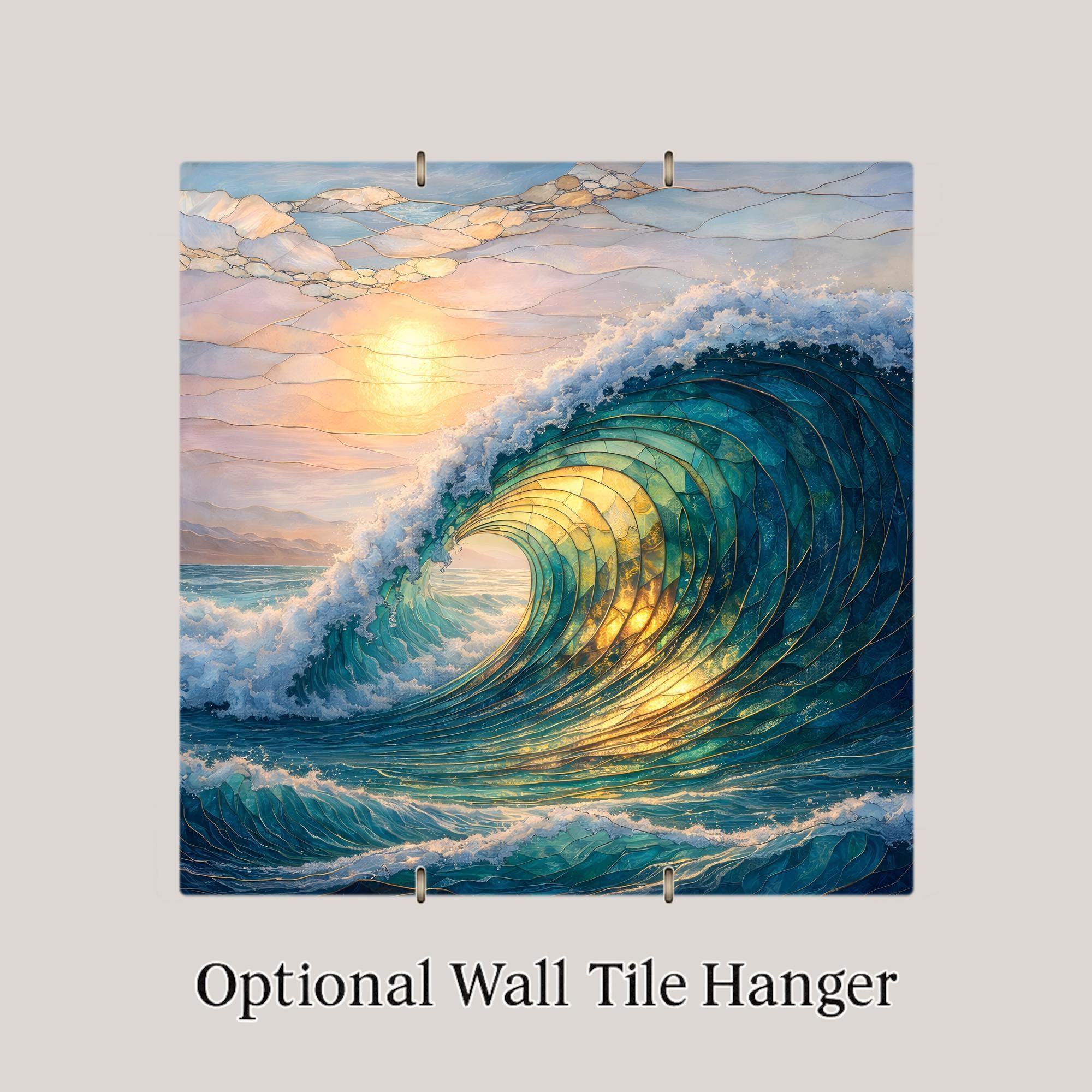 Inspired by the motion and light of the open ocean, this ceramic tile artwork translates the energy of a breaking wave into a refined stained-glass aesthetic. Layered curves and luminous highlights draw the eye inward, creating a sense of depth and flow that changes subtly with the light in the room.