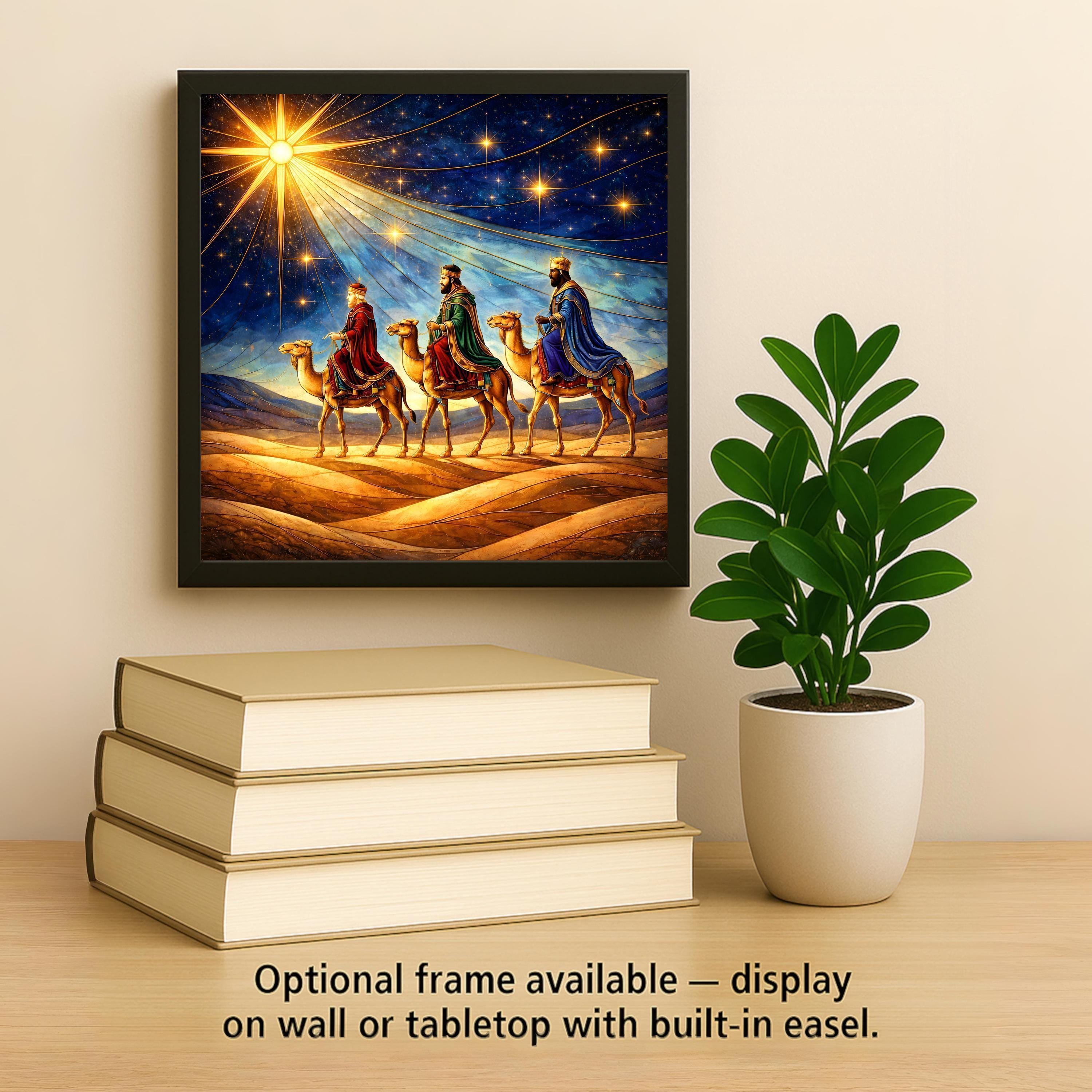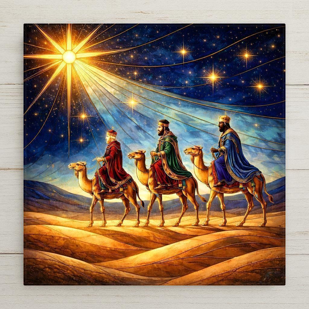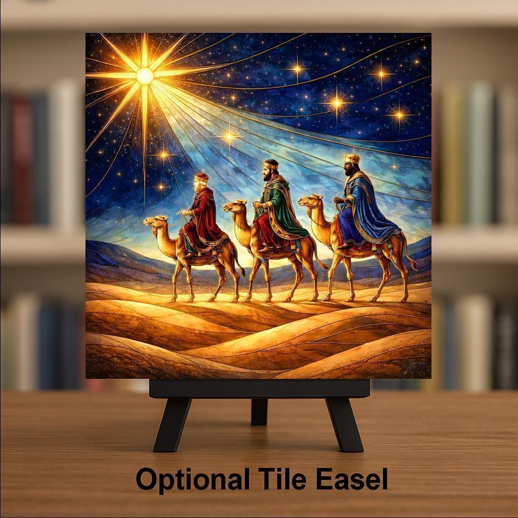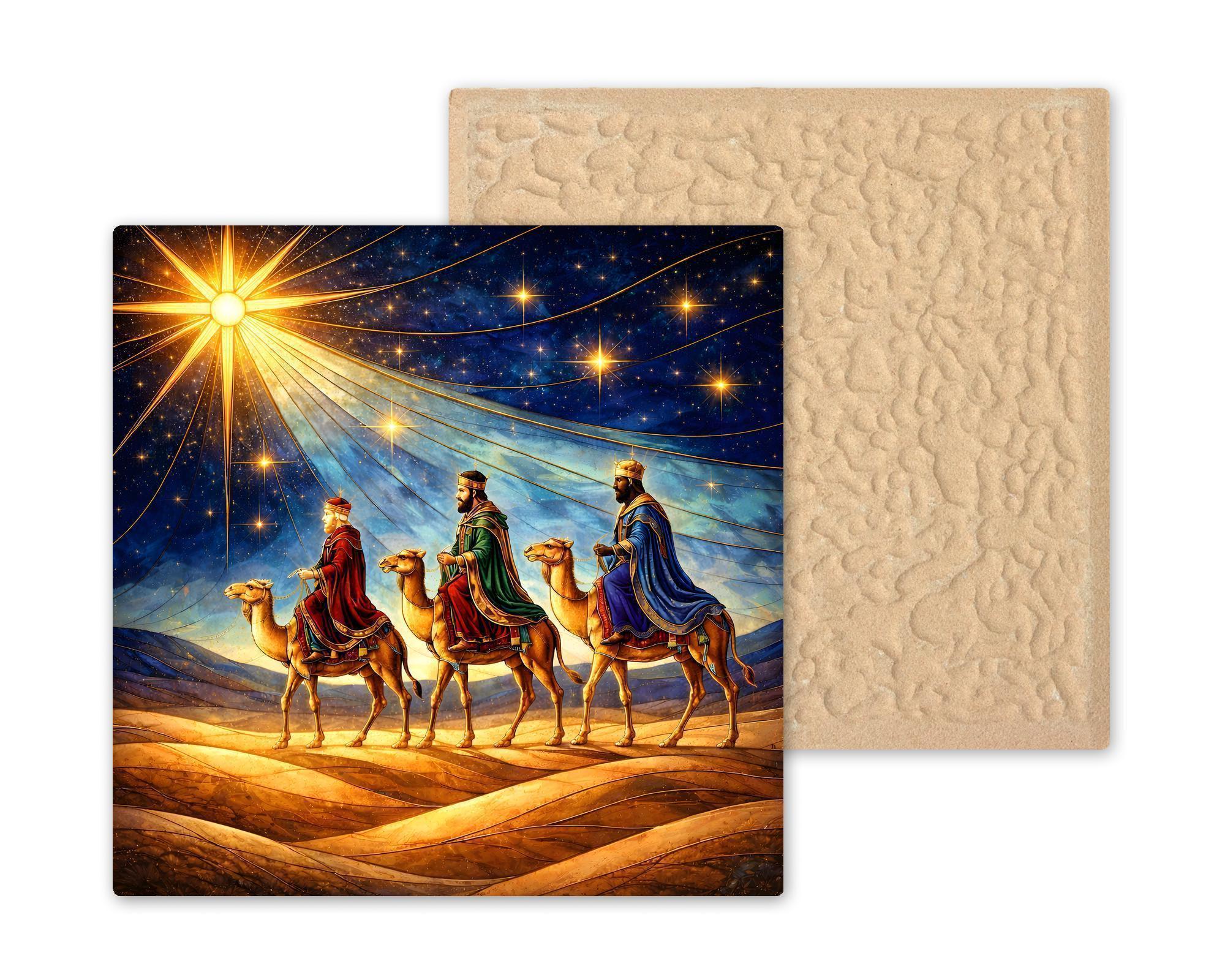 This Three Wise Men ceramic tile was created to feel majestic without feeling crowded. The deep navy sky creates a cathedral-like presence. The Star of Bethlehem radiates outward in controlled brilliance. Gold accents highlight the journey across the desert landscape.