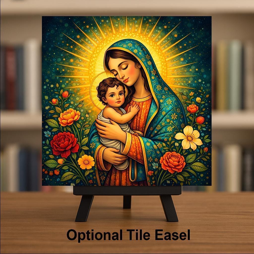 This Marian ceramic tile was created to highlight motherhood and faith. The gentle embrace forms a strong visual focal point. The layered gold halo adds dimension without overwhelming the scene.