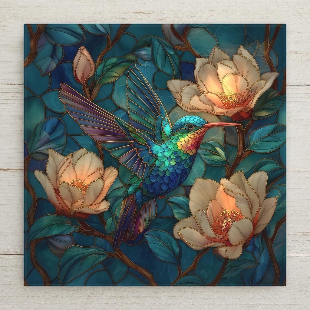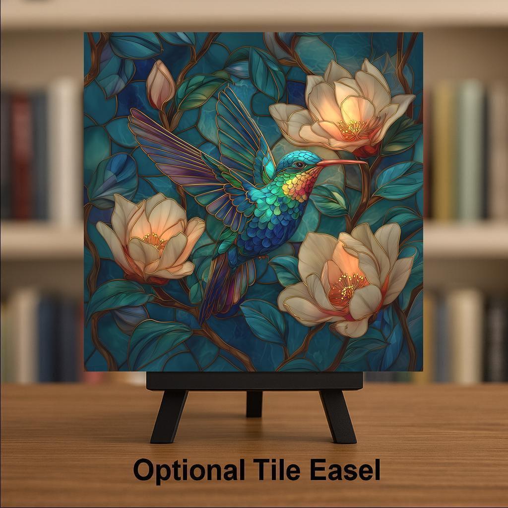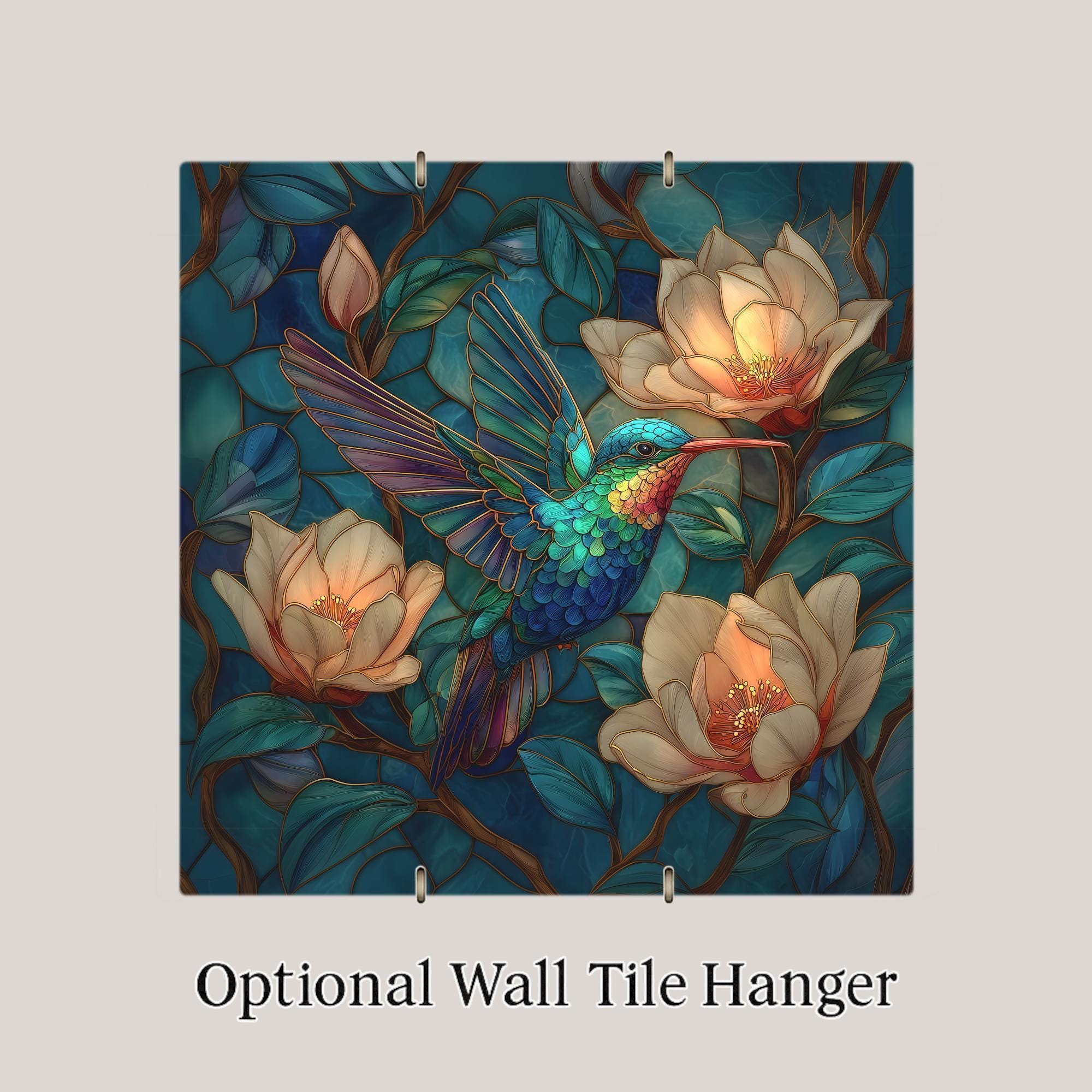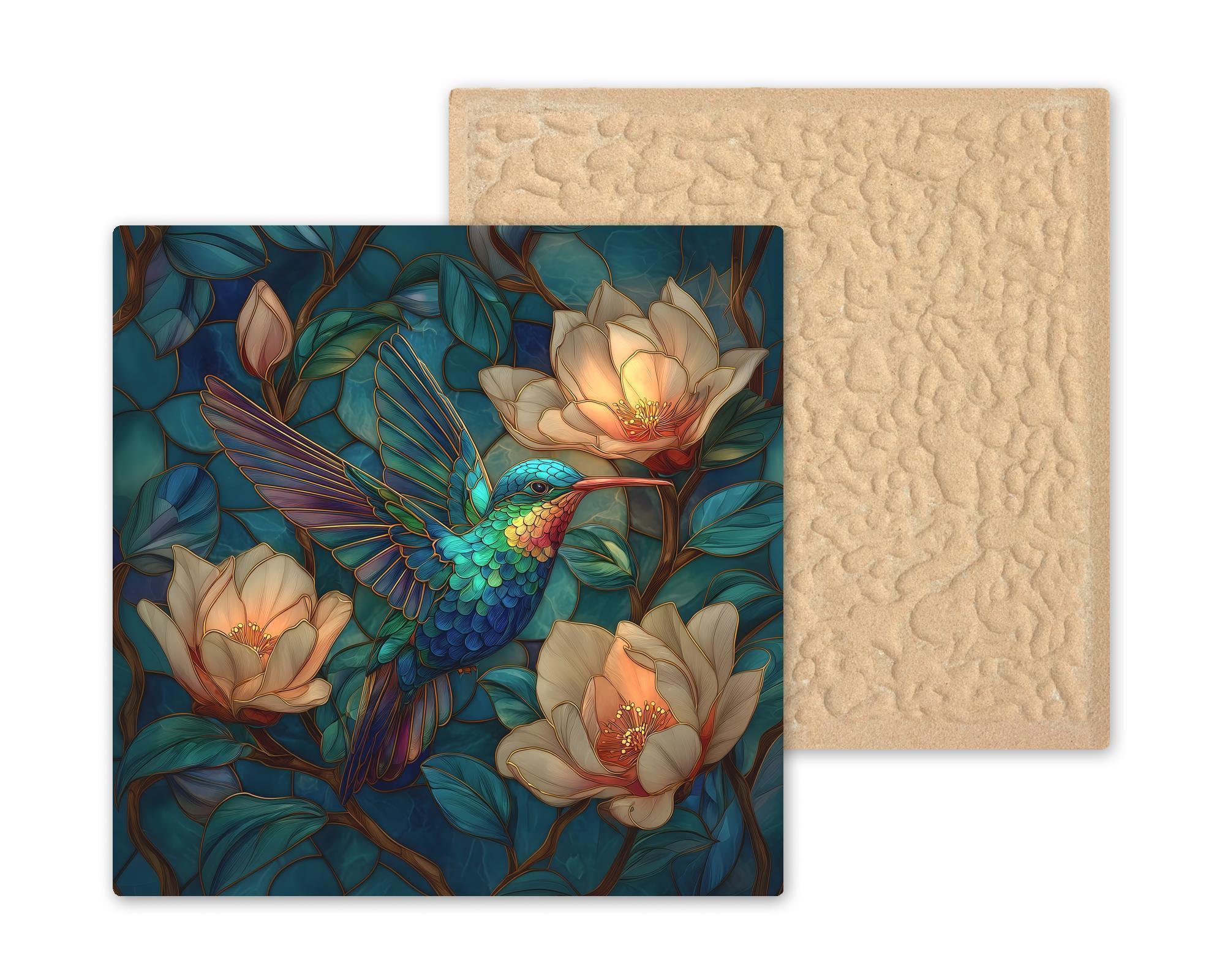 This magnolia hummingbird ceramic tile was created to feel rich and luminous. The deep jewel-tone background enhances the iridescent feather detail. Magnolia blooms frame the bird without overwhelming the composition.