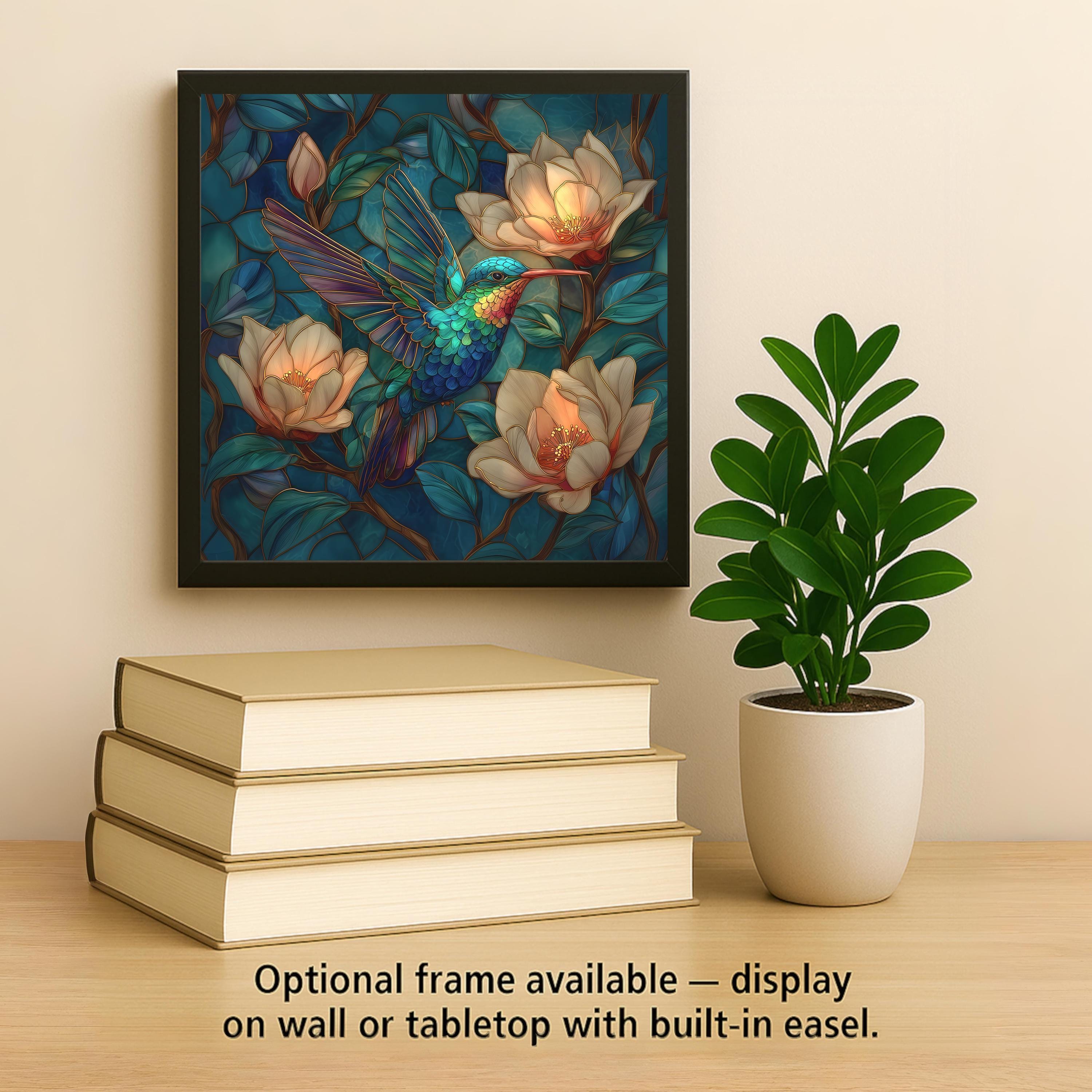 The artwork is permanently printed on ceramic tile. It is not actual stained glass, but it captures that glowing handcrafted aesthetic in a durable display format.