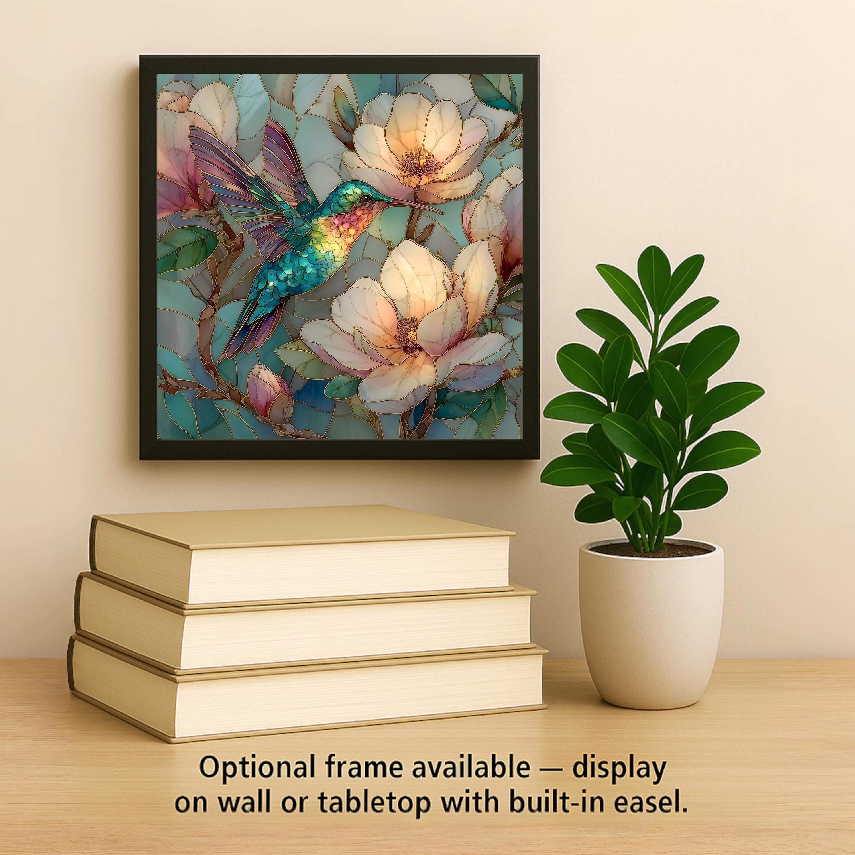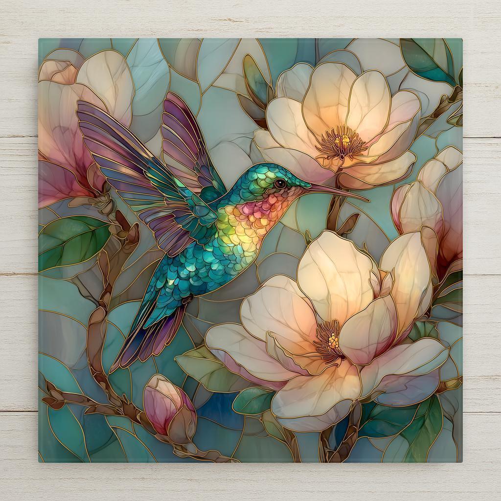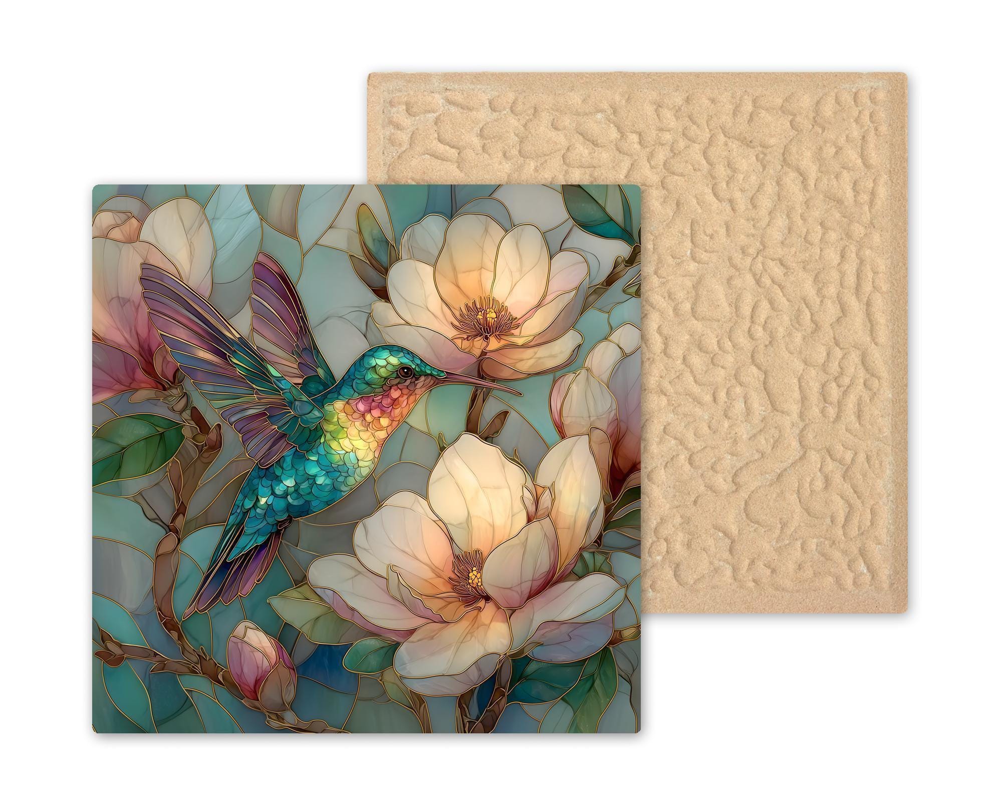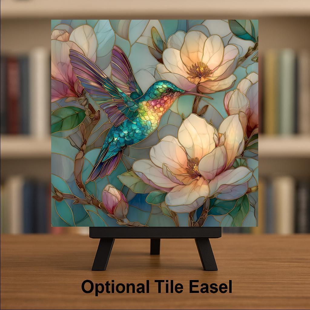 This magnolia hummingbird ceramic tile was designed to feel soft, luminous, and uplifting. The pastel palette enhances the cottagecore aesthetic without overpowering the subject. The layered feather detail creates depth and clarity at all sizes.