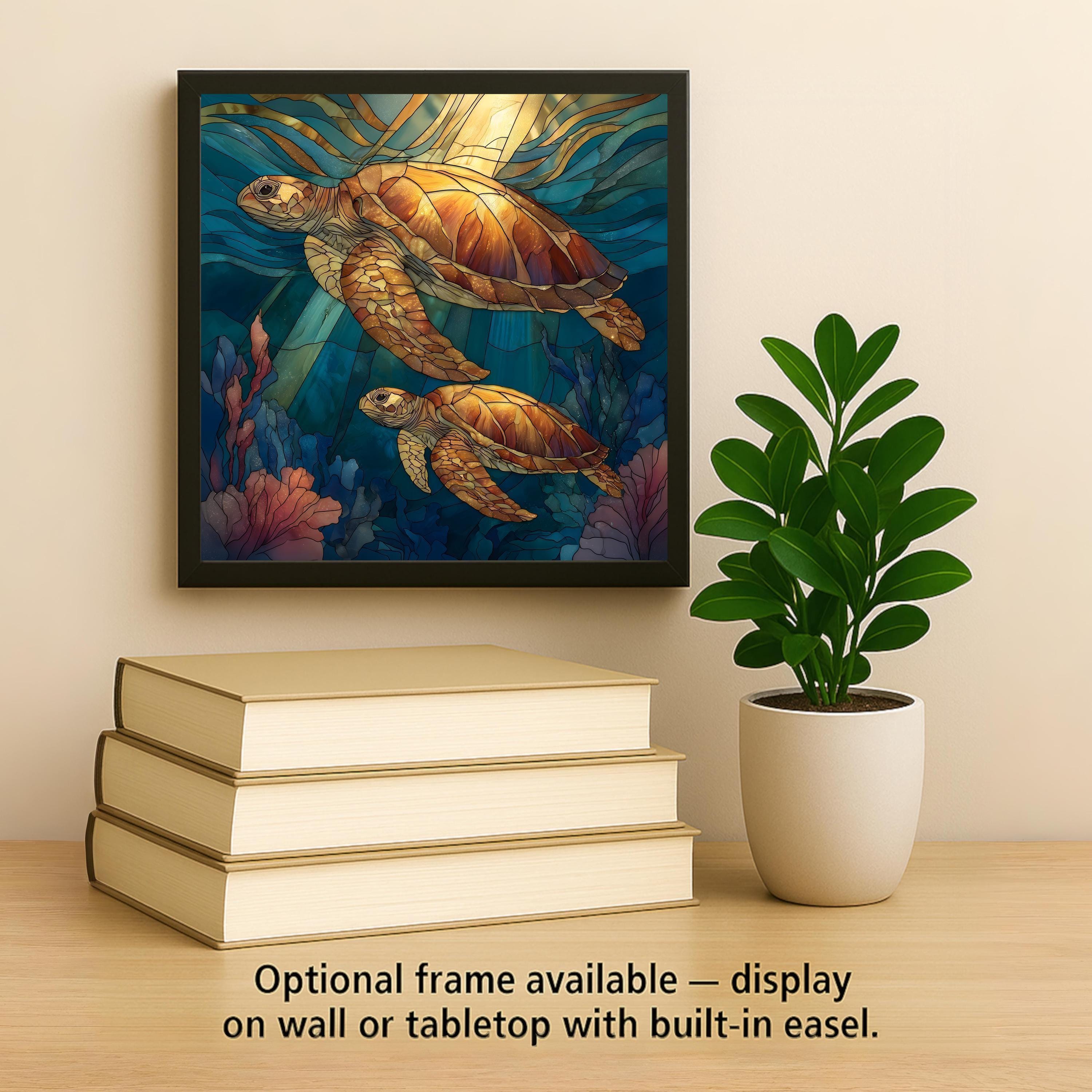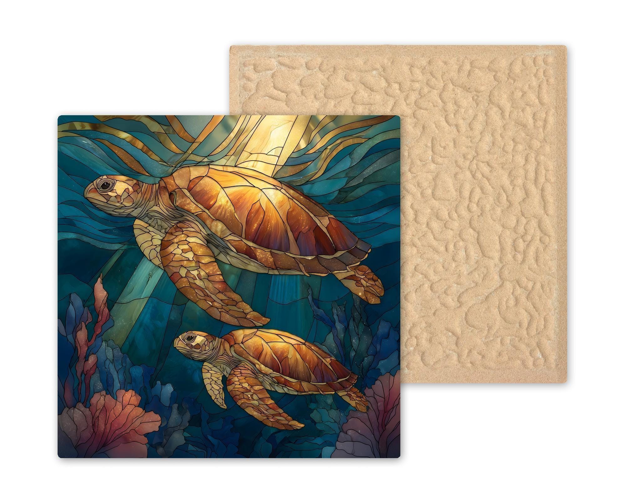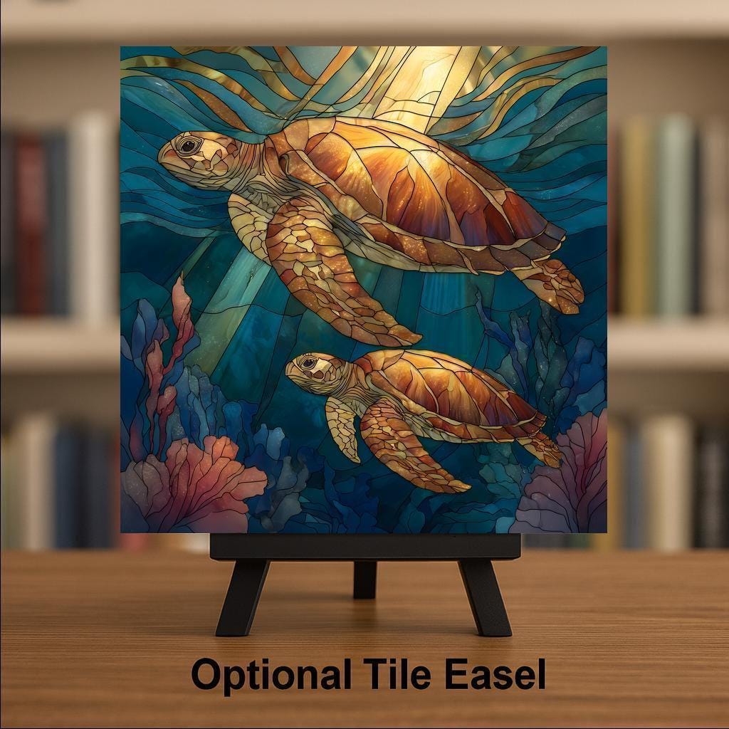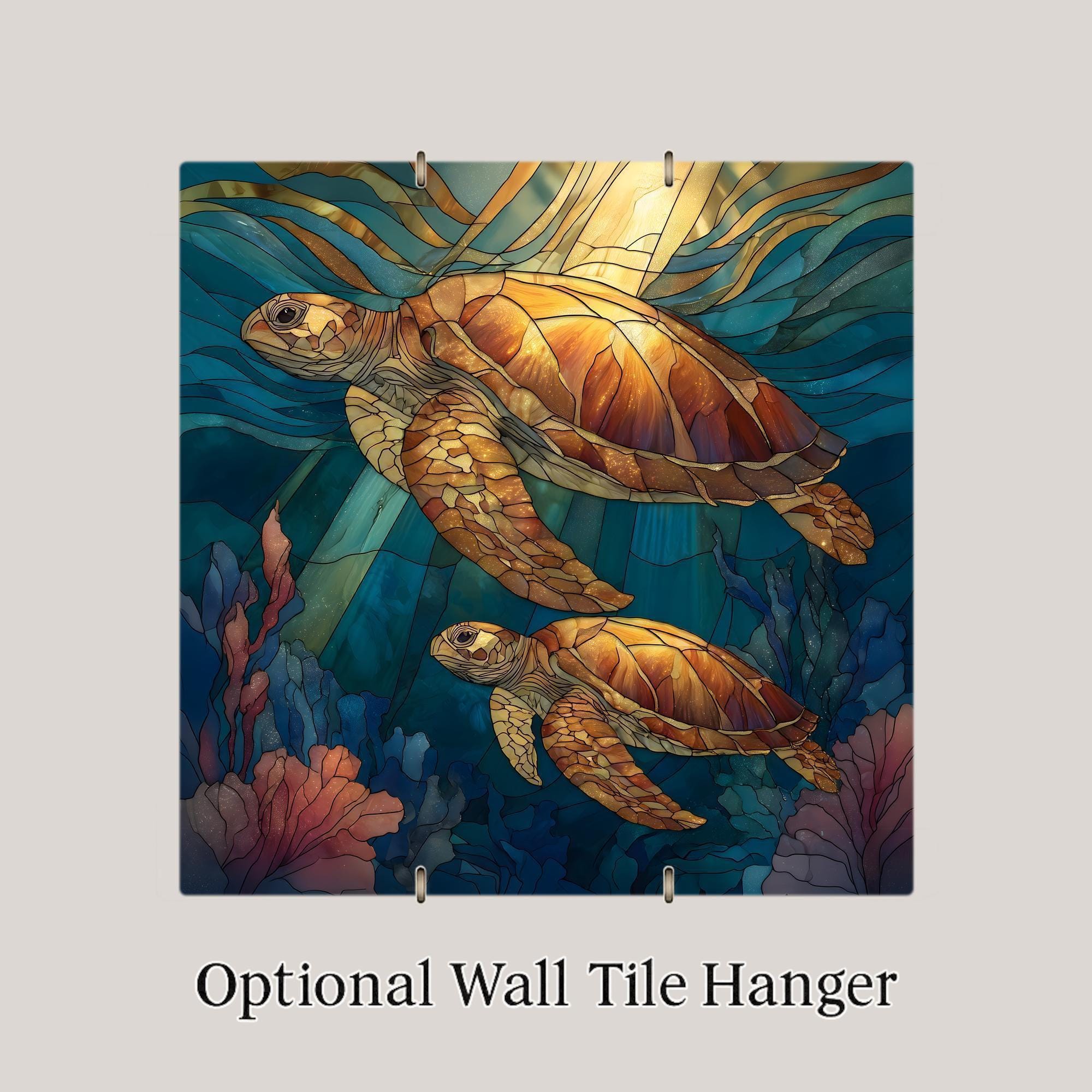 This stained glass style sea turtle ceramic tile was designed with motion and elegance in mind. The flowing wave forms create visual rhythm while the warm shell tones contrast against cool ocean blues.