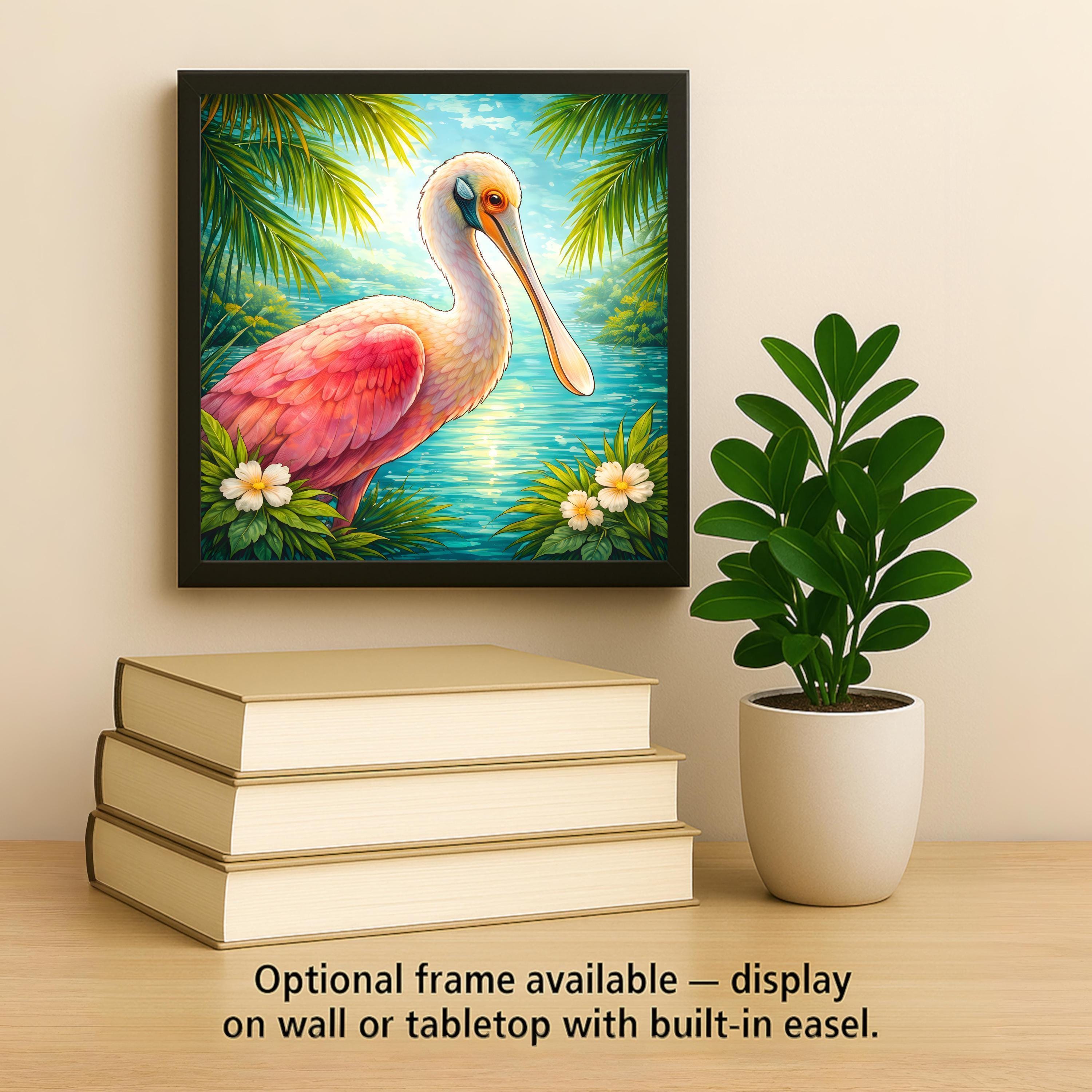 The close-up composition gives the bird presence and personality. Coral and blush feathers contrast with luminous aqua waters and palm accents, creating a strong focal point that works beautifully in beach decor, Florida wall decor, or vacation-inspired interiors.