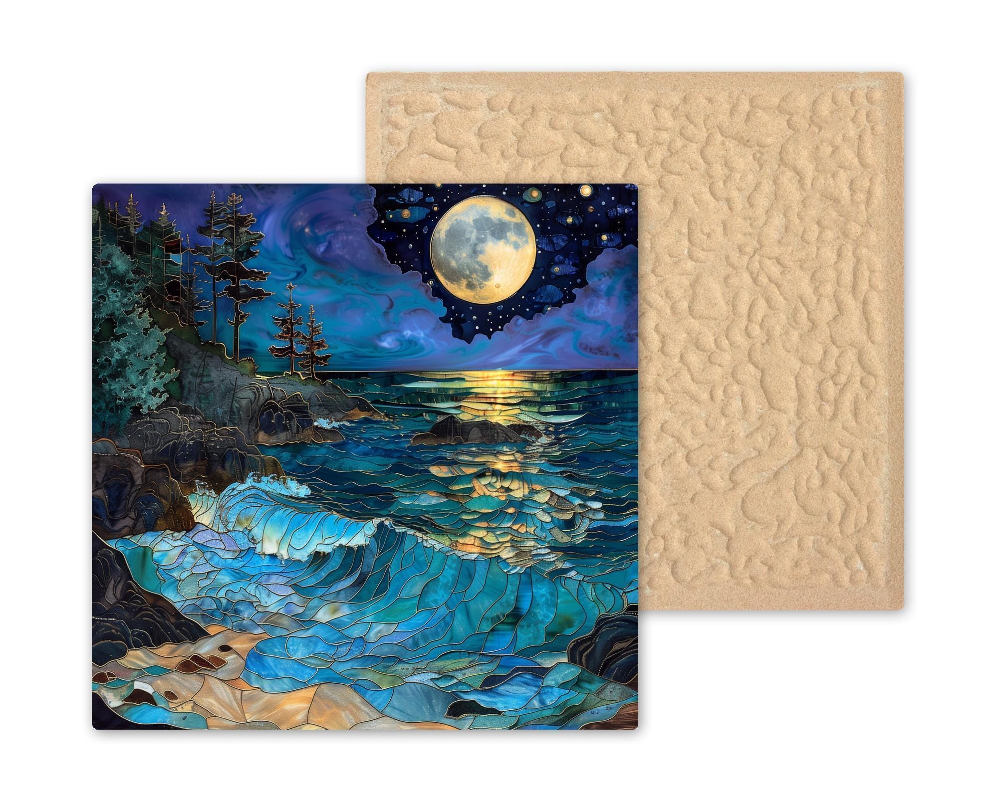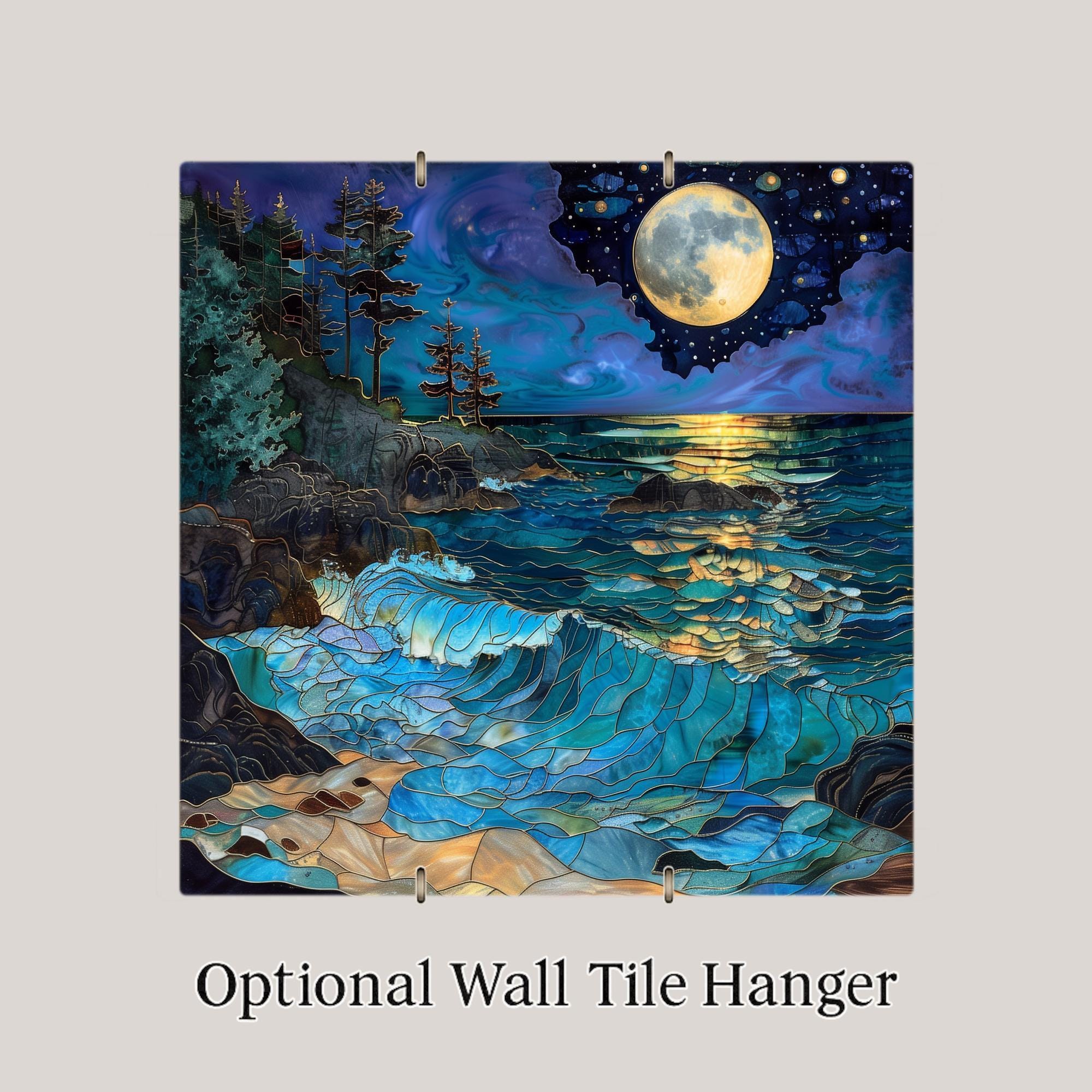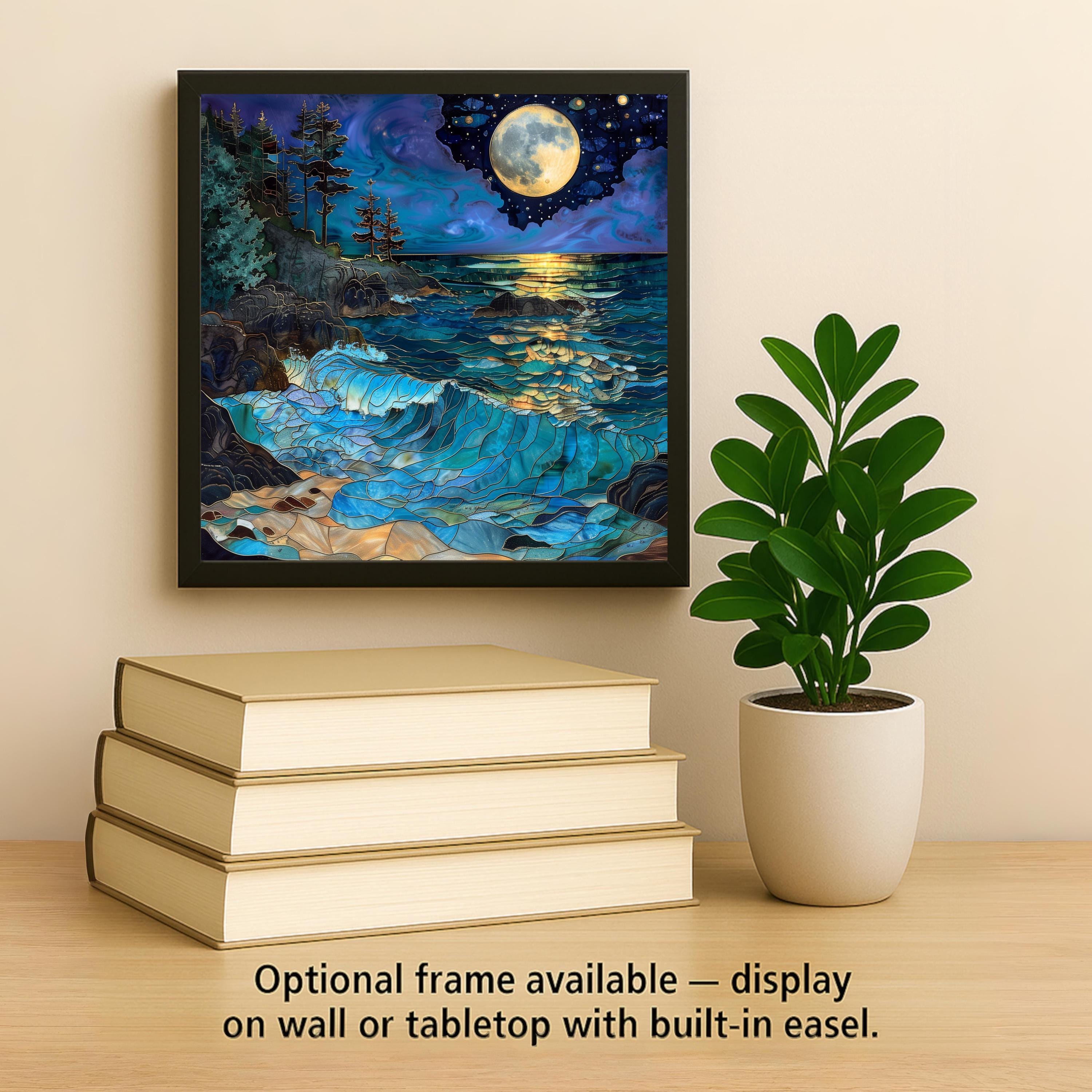 This piece centers around the glowing gold moon and its reflection across layered waves. It carries both energy and elegance — dramatic without feeling chaotic.