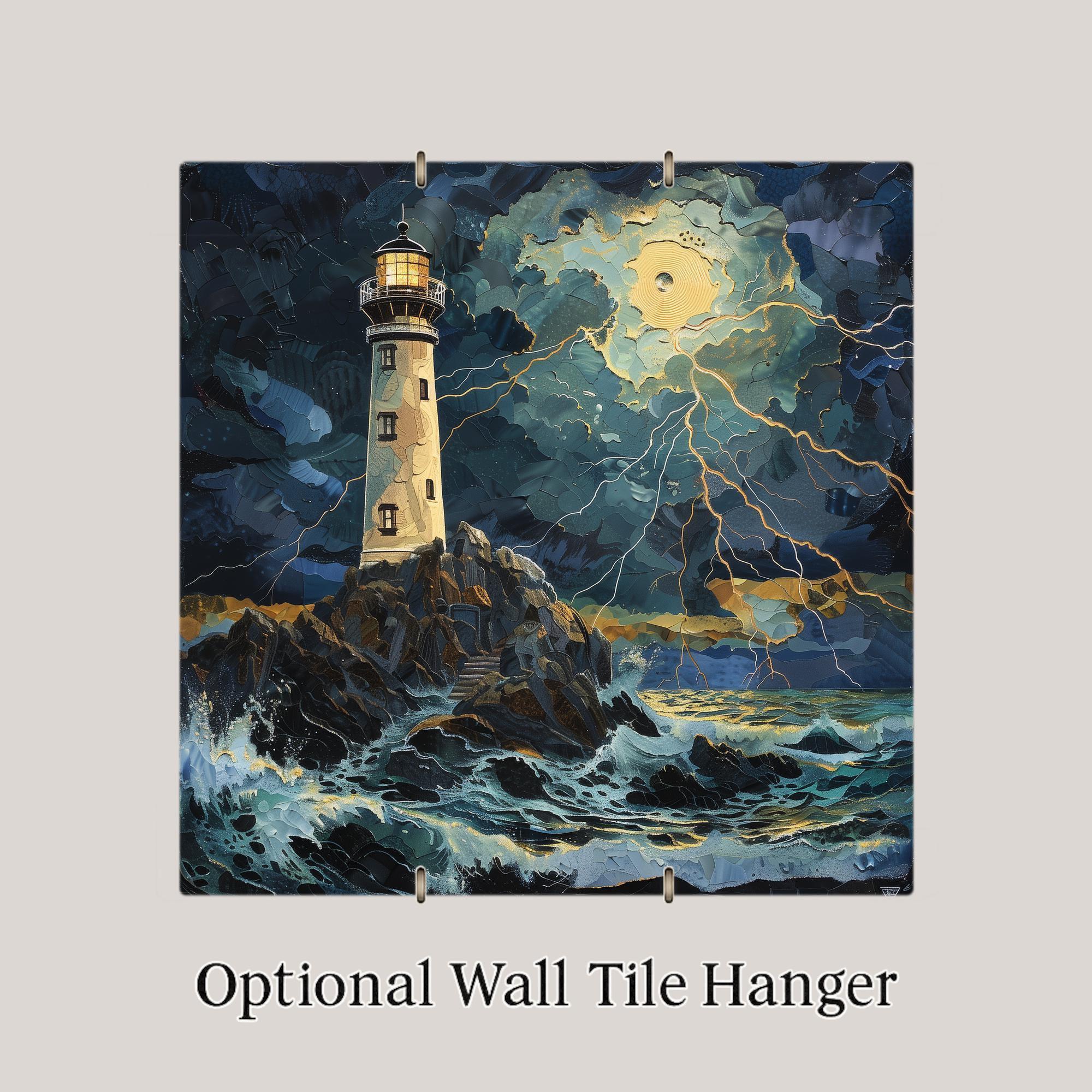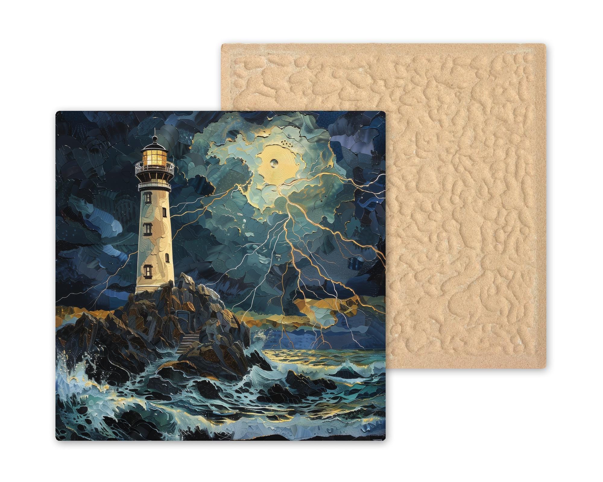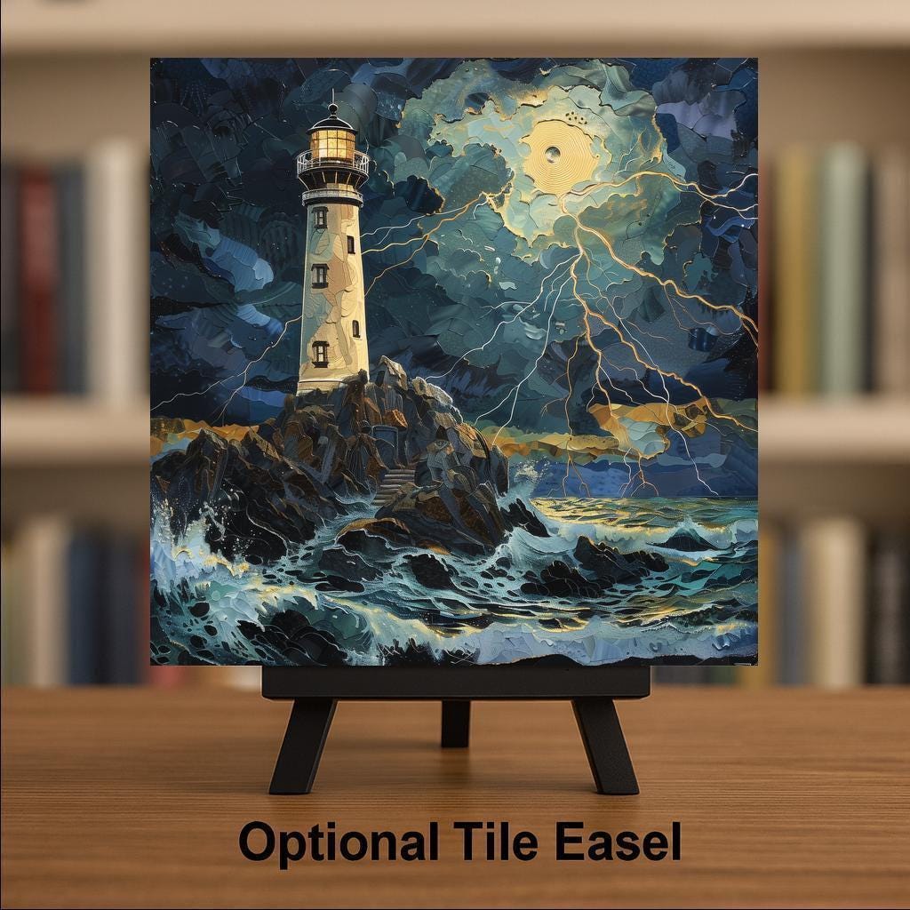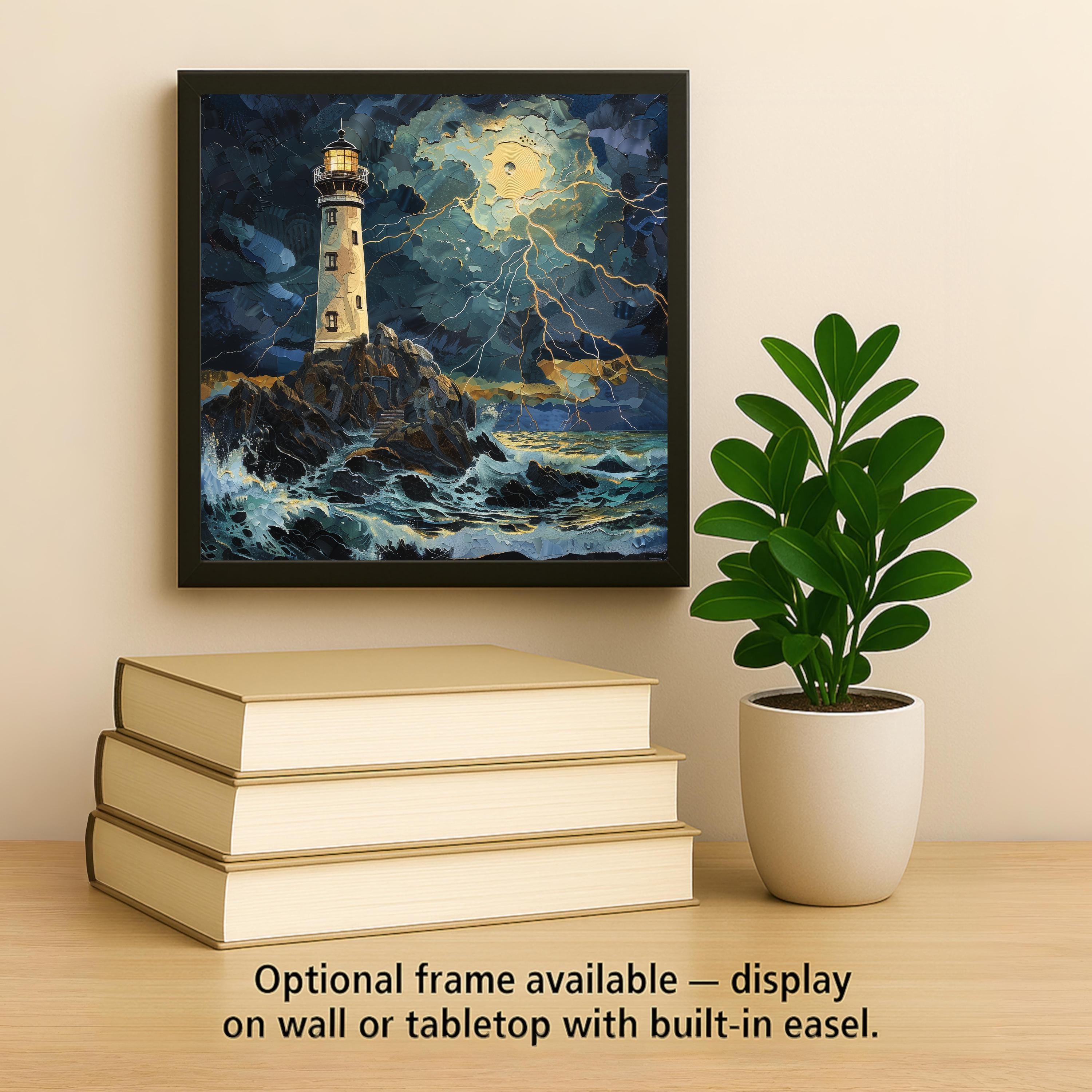 The lighthouse stands firm while the sky breaks open with light. Waves surge, clouds swirl, and the ocean reflects gold against deep indigo tones. It feels alive, cinematic, and powerful.