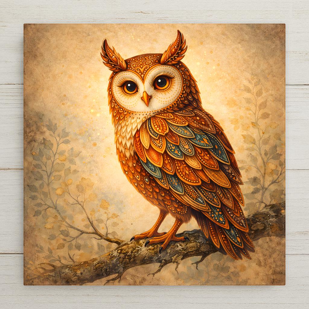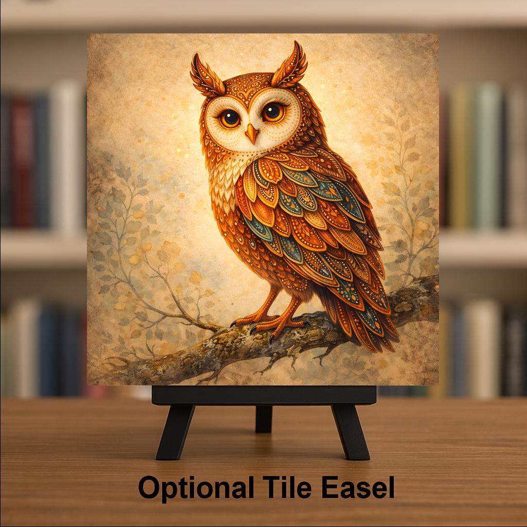 This woodland owl ceramic tile combines warmth, detail, and personality. The layered feather patterns create depth and movement. Earthy copper and amber tones are balanced with subtle teal accents, giving the piece richness without overwhelming a space.