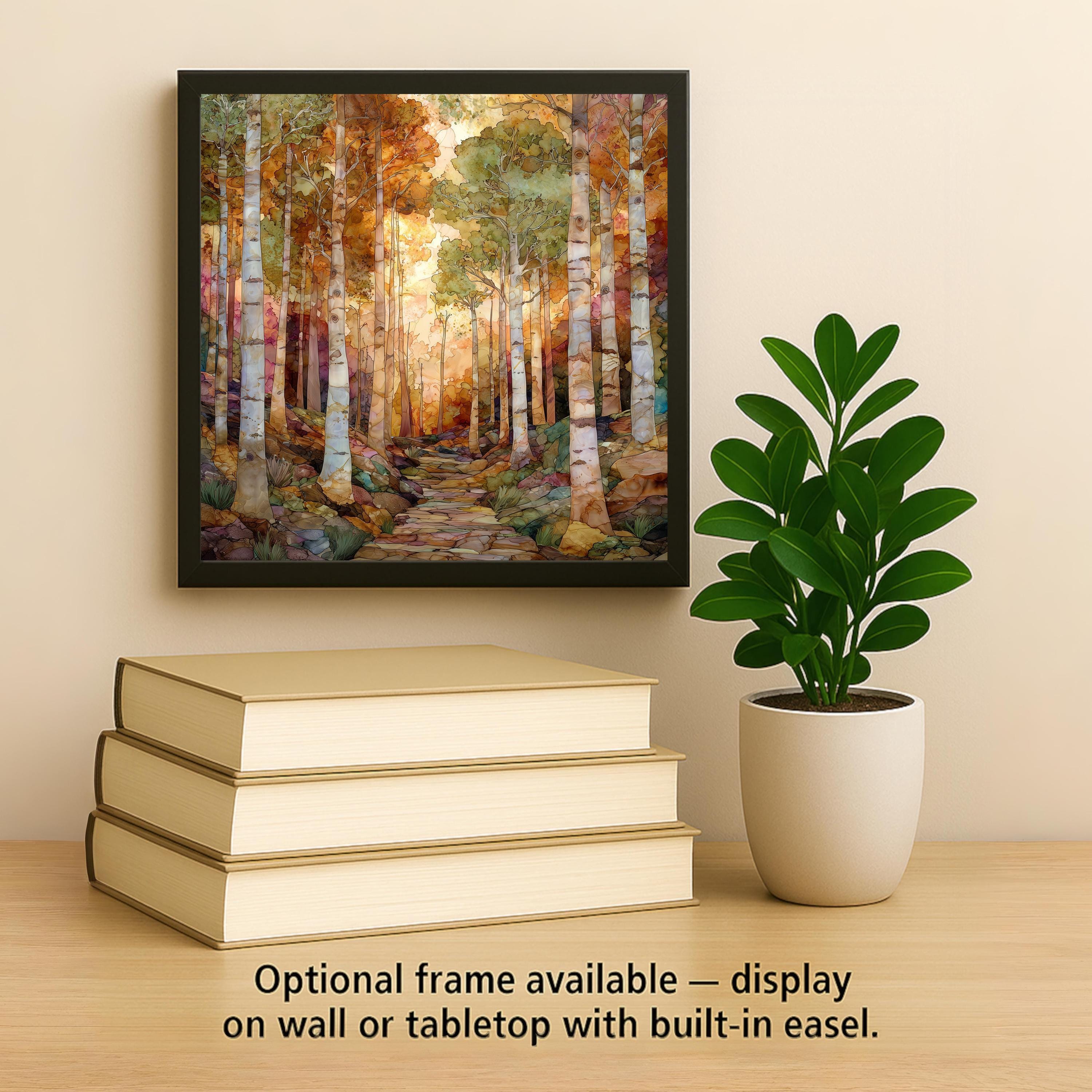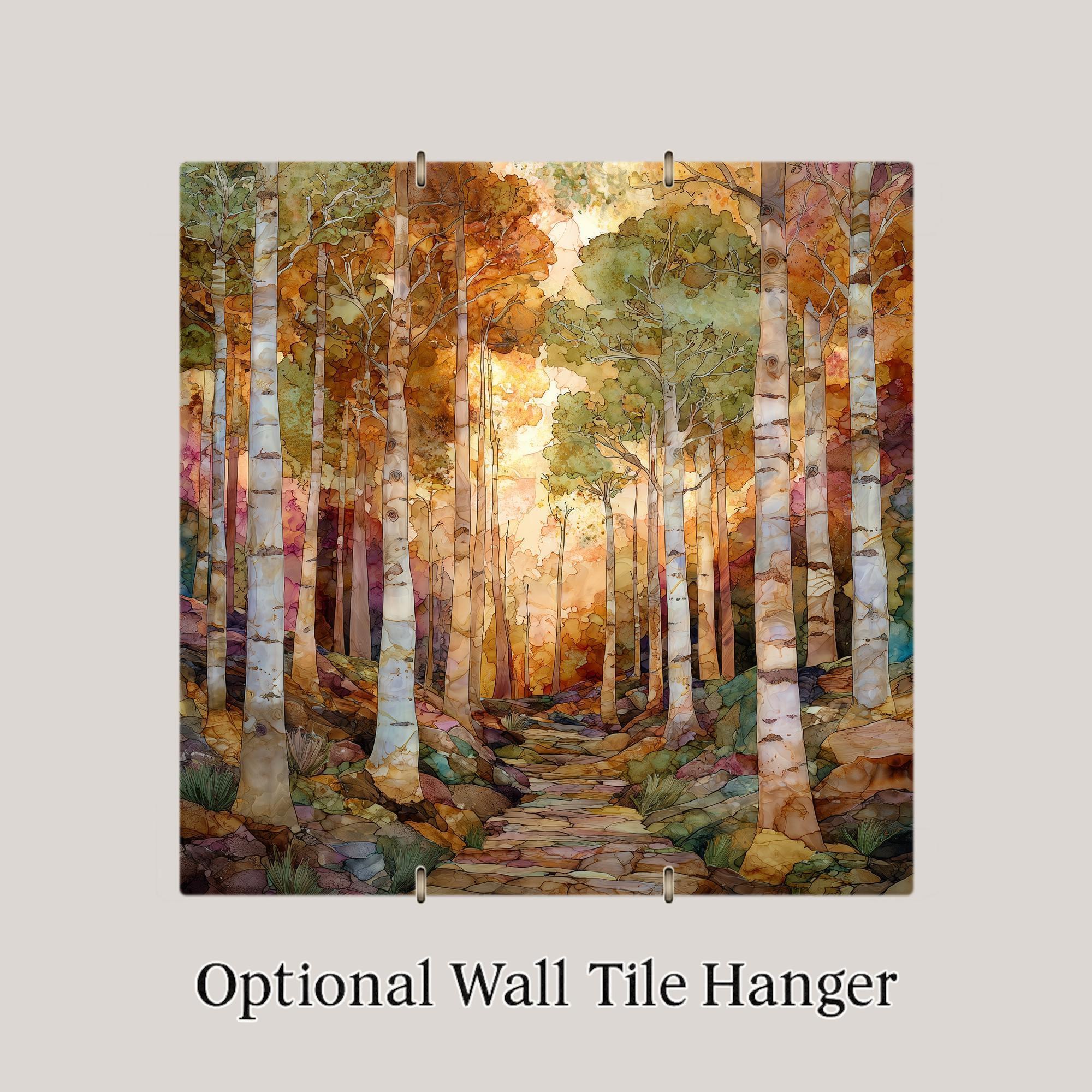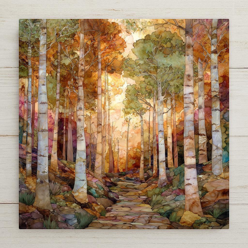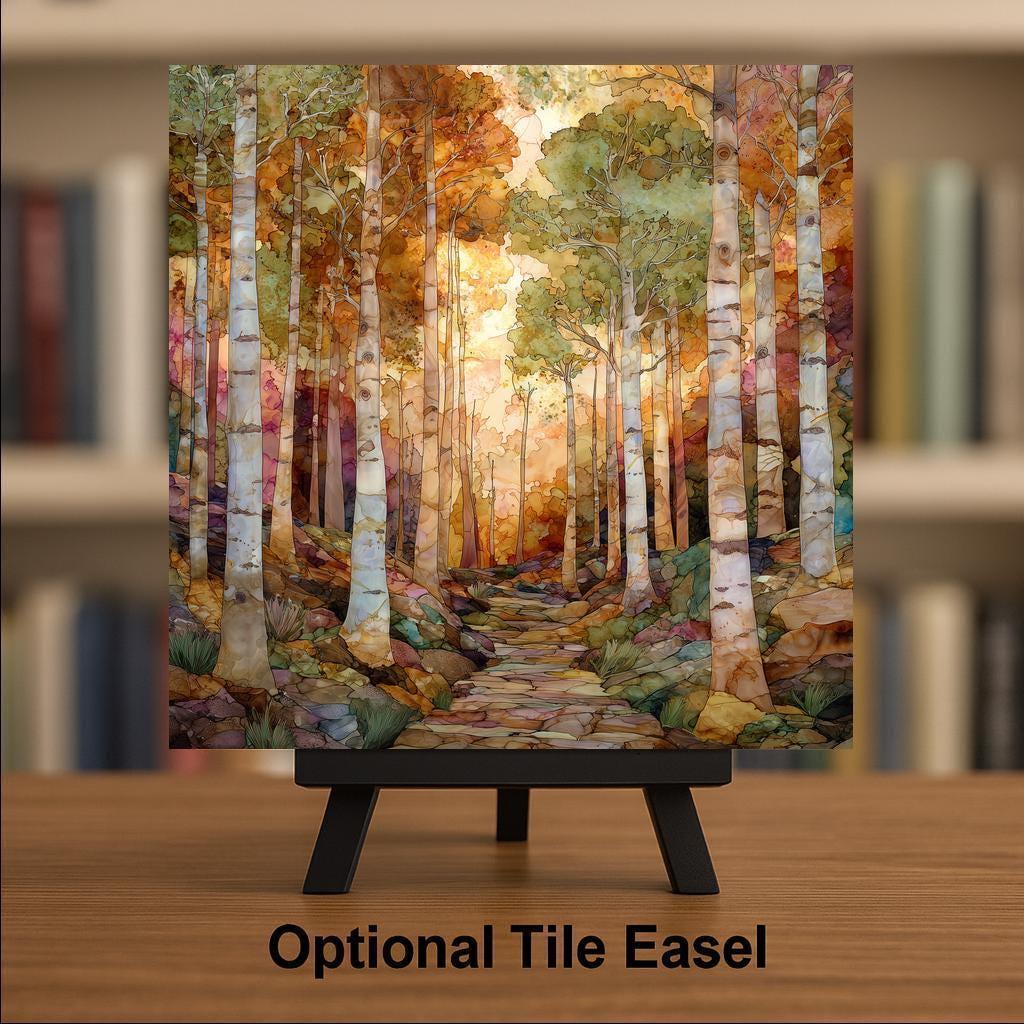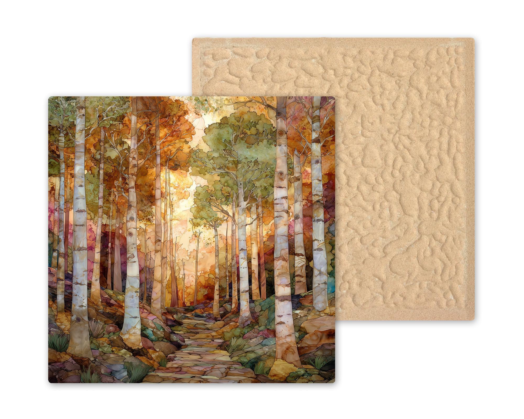 Step into a glowing autumn birch forest. This ceramic tile artwork captures the calm rhythm of tall white trunks rising through golden light. The winding stone path invites the viewer deeper into the scene, creating natural perspective and movement.