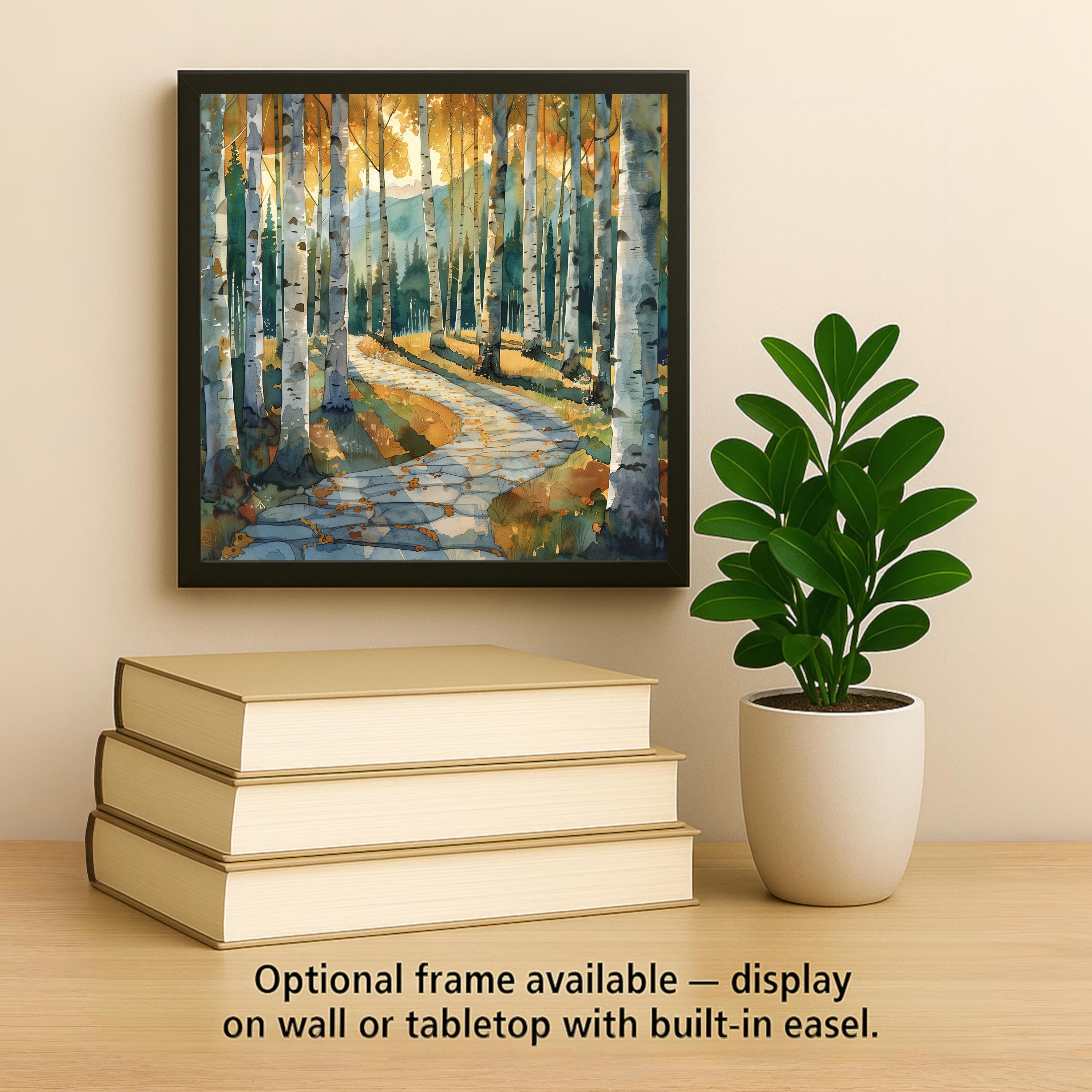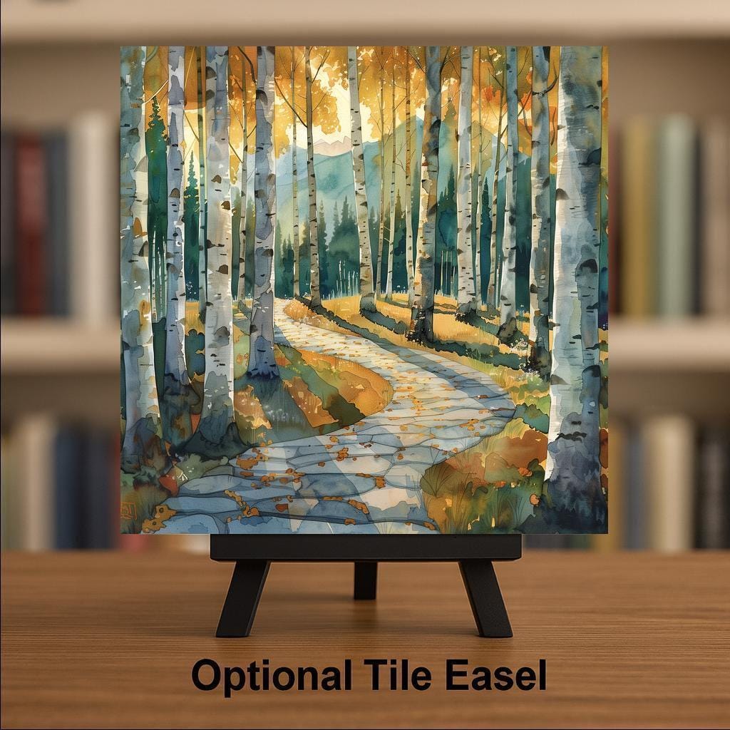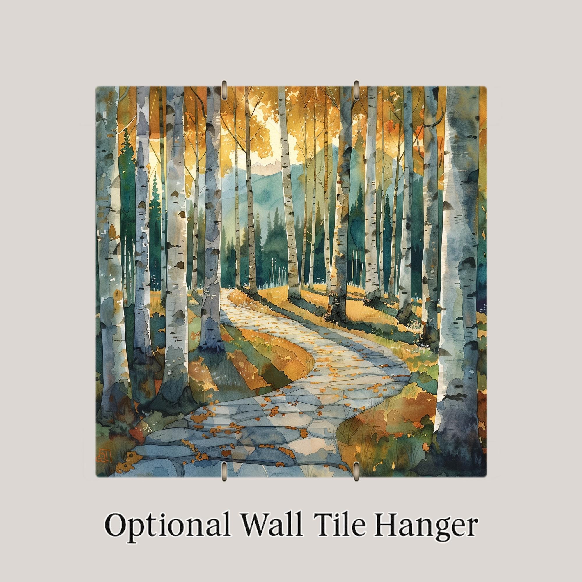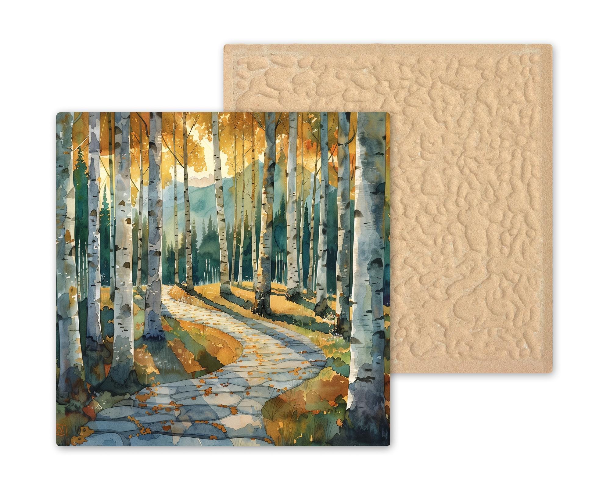 Step into a golden birch forest at the edge of the mountains. This ceramic tile artwork blends vertical rhythm with gentle movement. The tall white trunks frame the scene, while the winding stone path invites the eye deeper into the landscape.