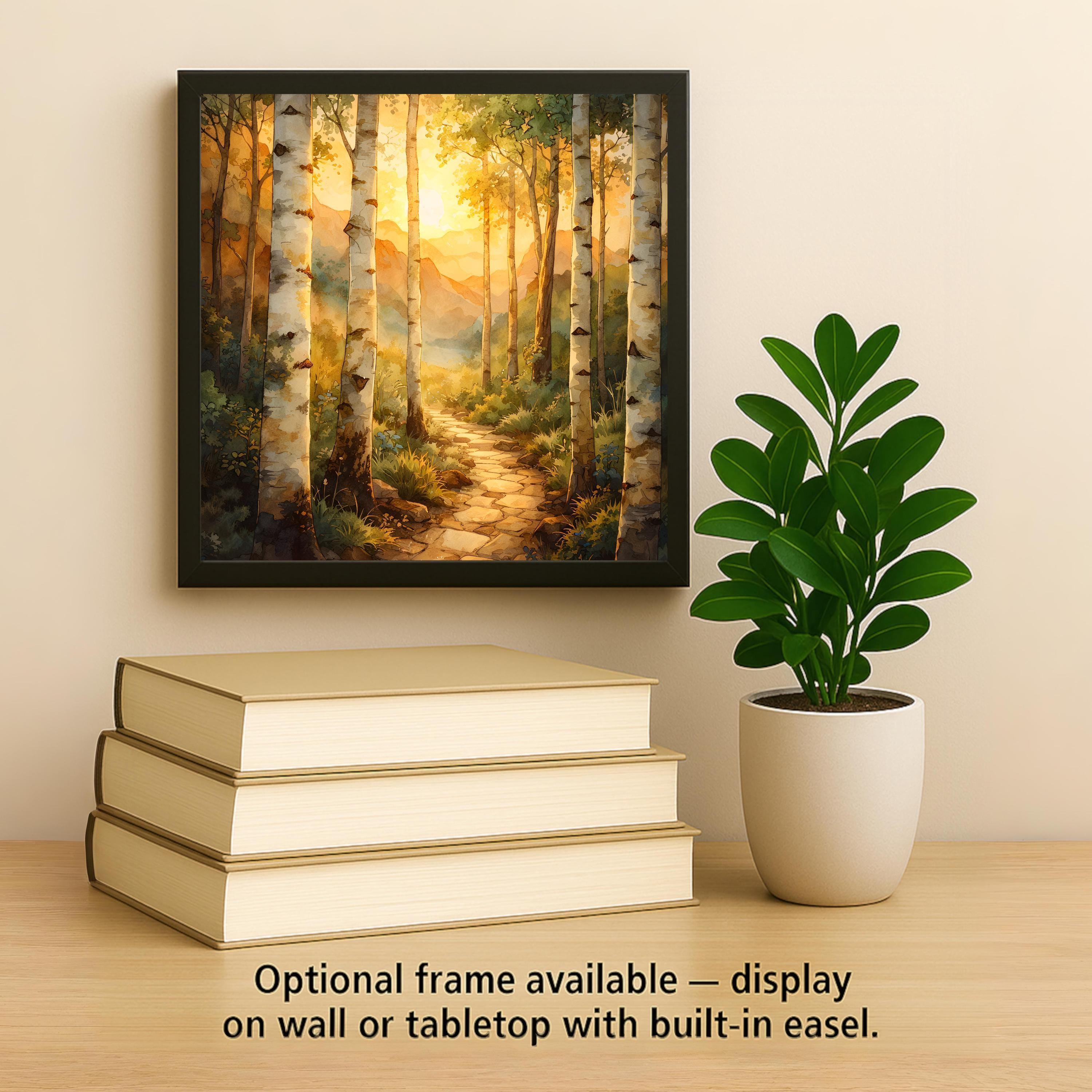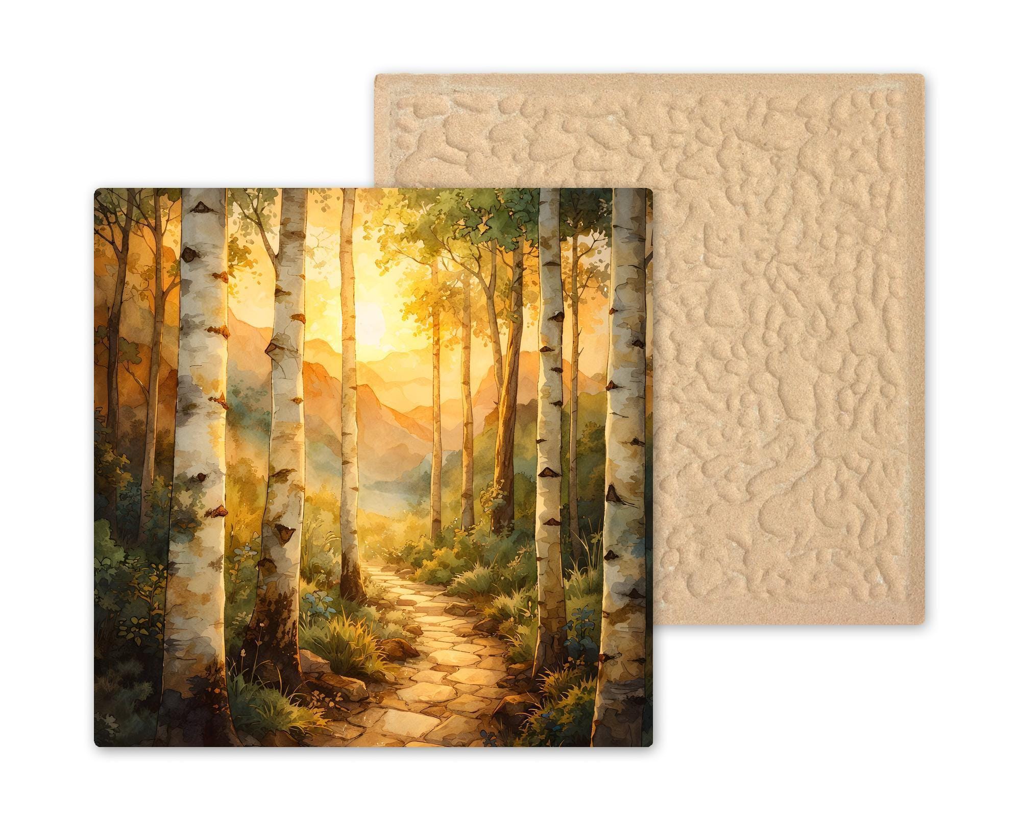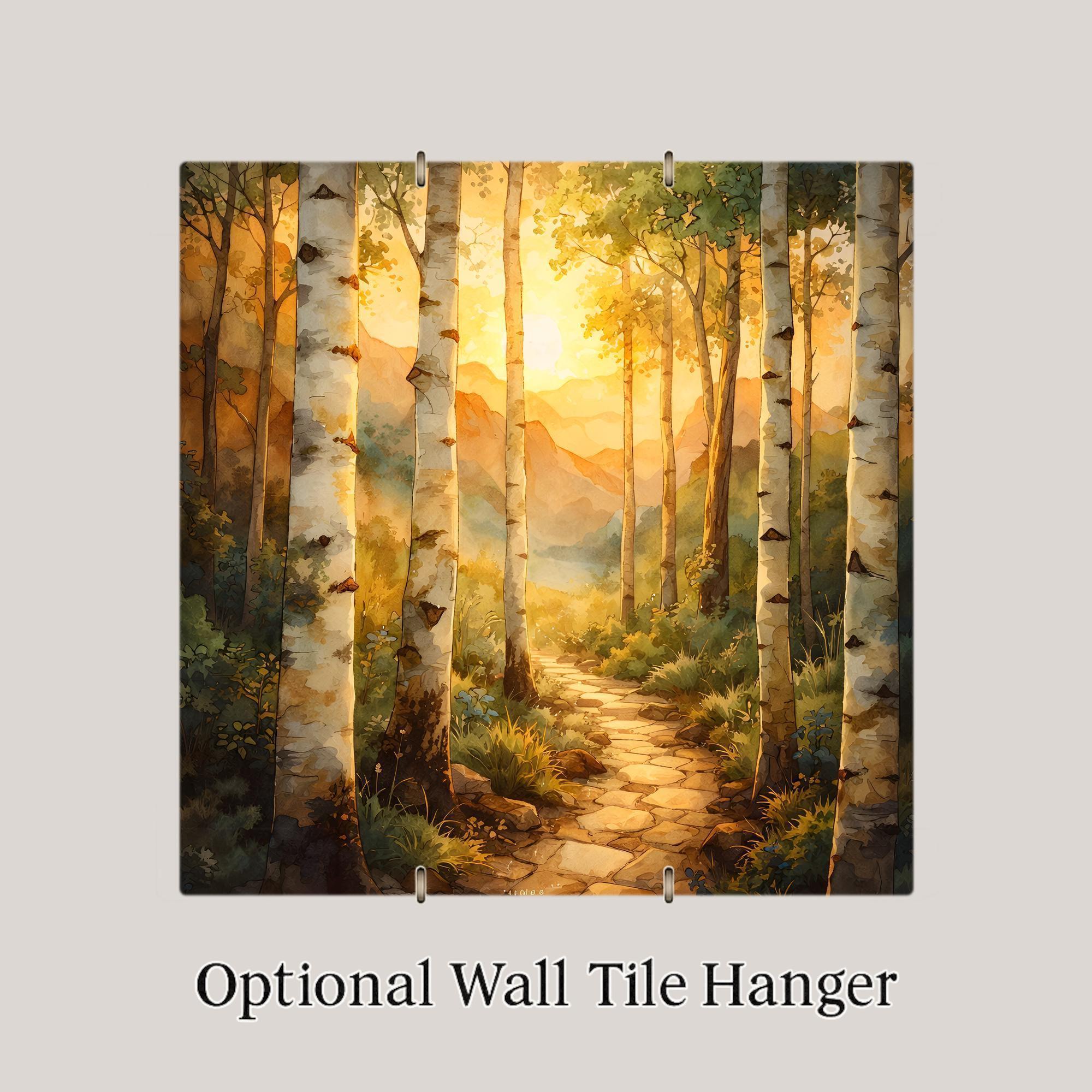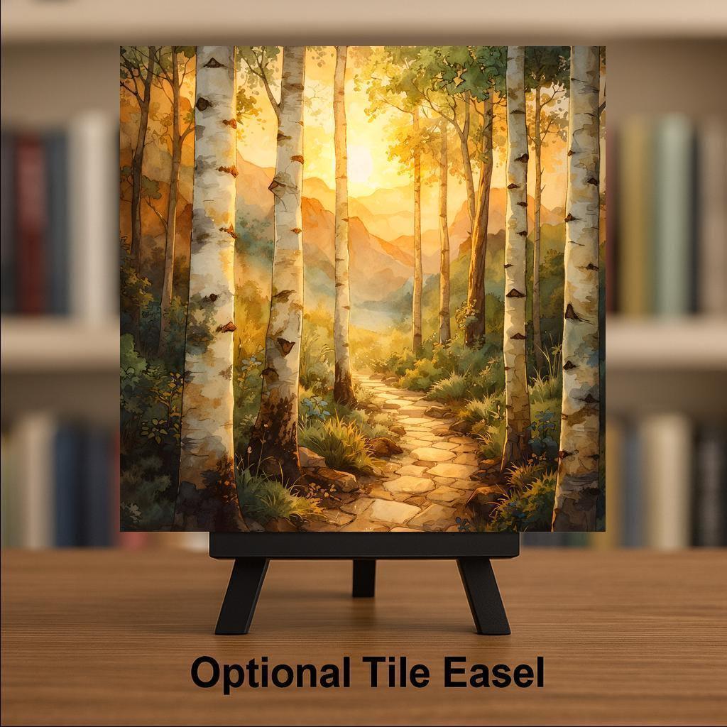 This birch forest ceramic tile captures the quiet glow of sunset filtering through tall aspen trees. The winding path leads toward layered mountains bathed in warm golden light. The composition creates a natural sense of depth and calm. It feels like stepping into a peaceful forest at the end of the day.