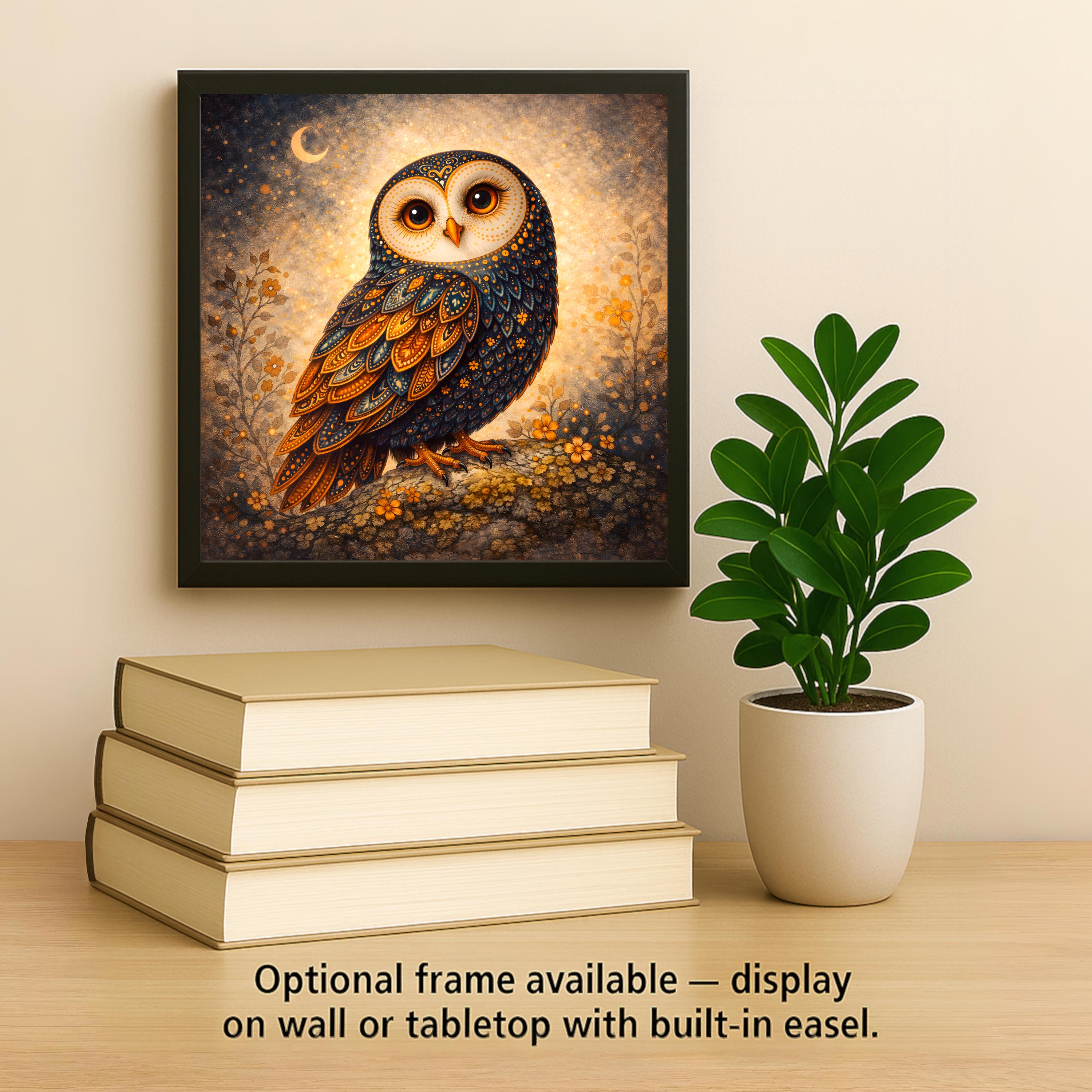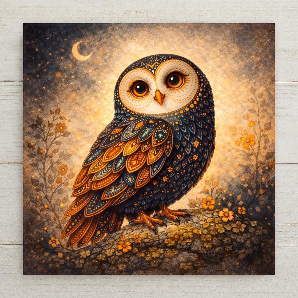 This night owl ceramic tile captures the quiet beauty of a moonlit forest. The owl’s detailed feathers shimmer in deep navy, amber, and teal tones. A soft golden glow radiates from the background, creating a peaceful and magical atmosphere.