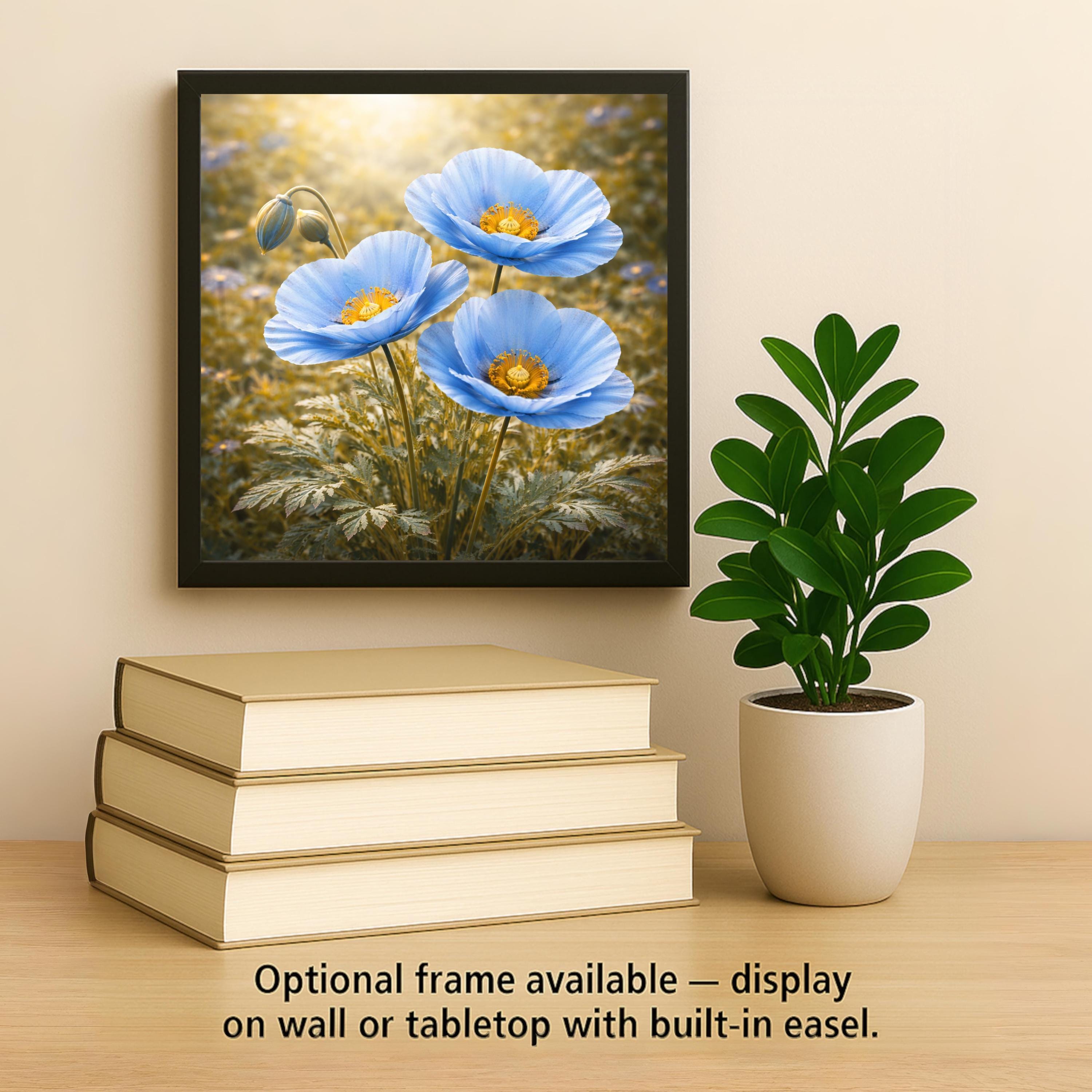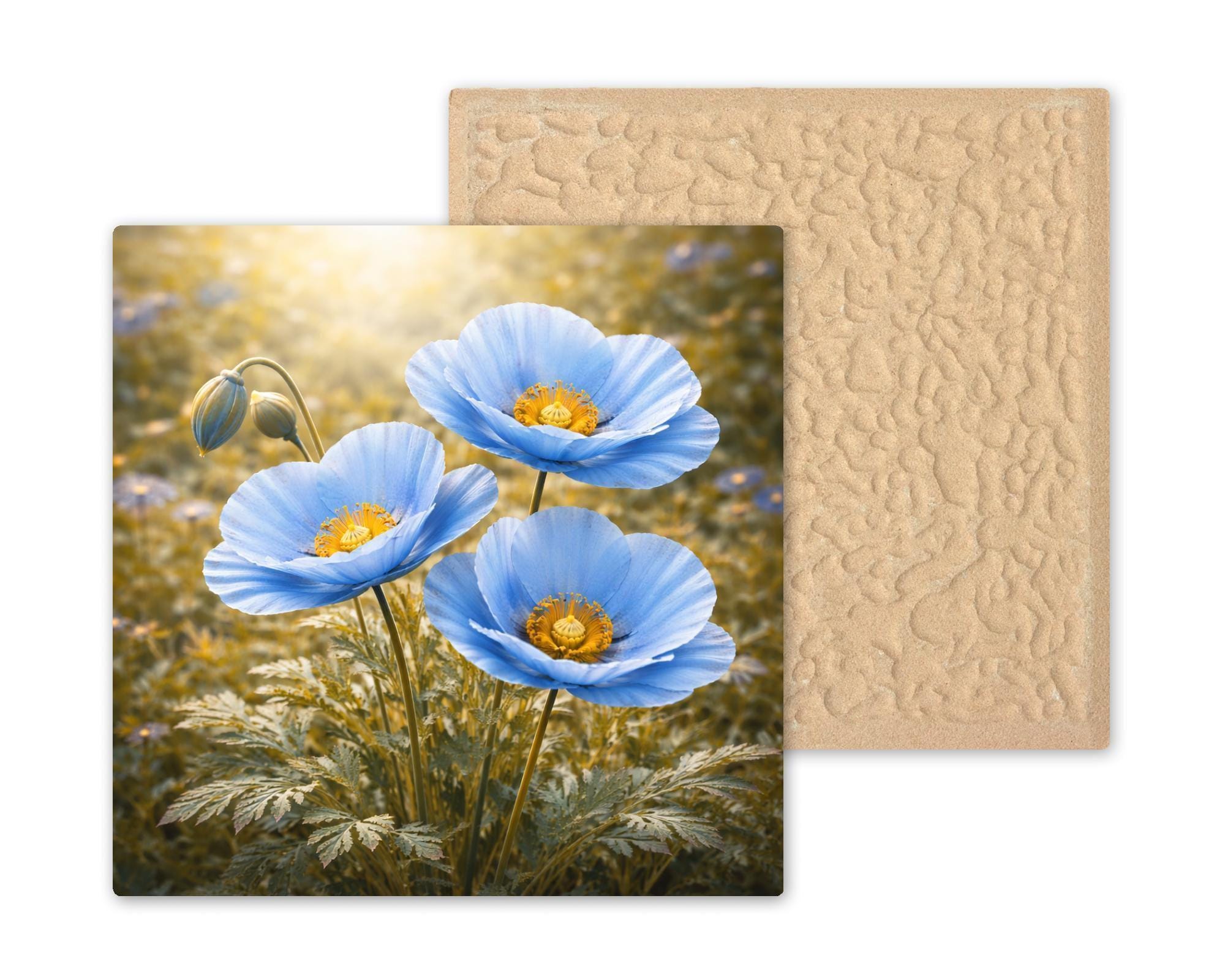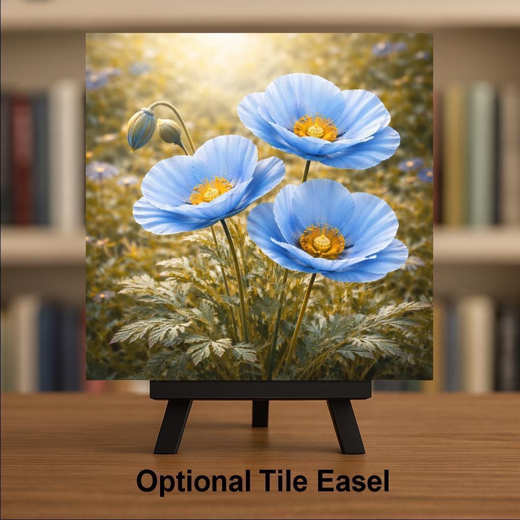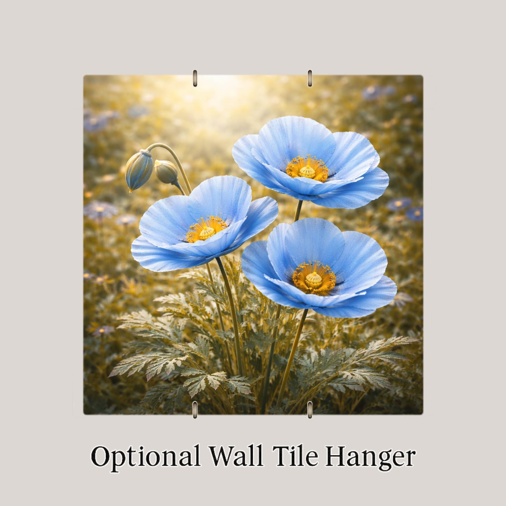 The Himalayan blue poppy is one of the most admired and sought-after garden flowers. Its distinctive blue petals and luminous golden center create a rare and calming presence. This ceramic tile wall art captures that signature beauty in a soft, sunlit meadow scene.