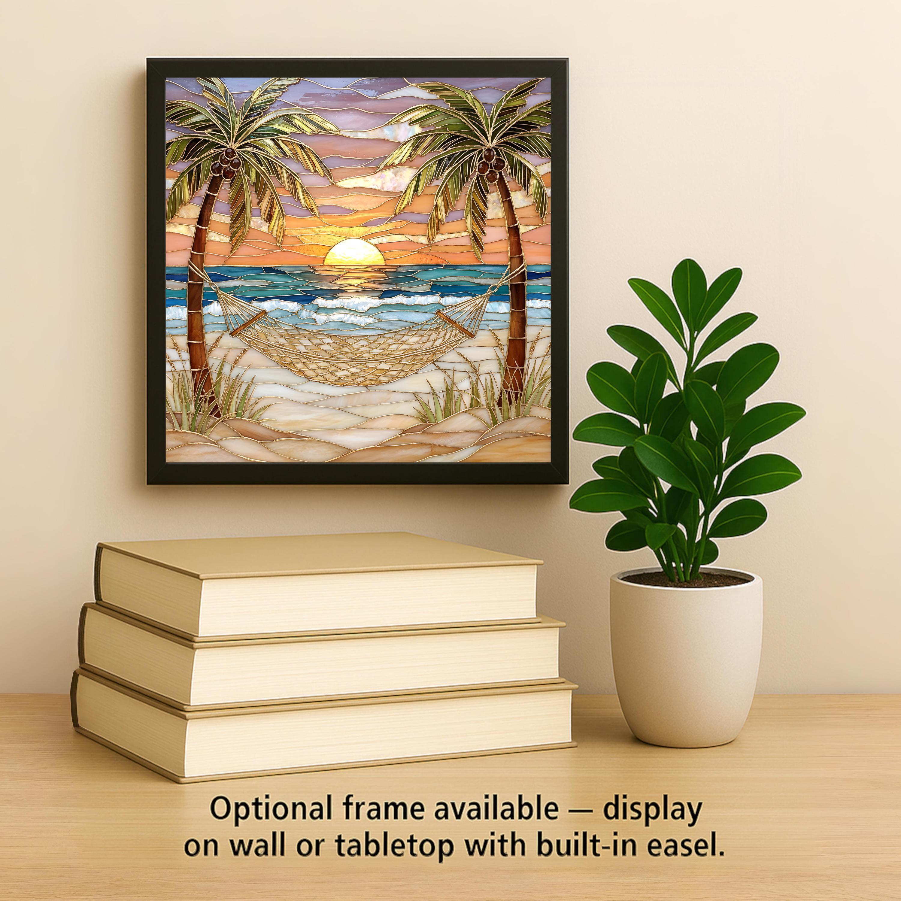 The layered sky and ocean are inspired by stained glass design, with soft lead lines and glowing color transitions that feel both classic and contemporary. The composition is balanced and calming, making it ideal for coastal interiors, beach-themed spaces, or anyone who wants to bring a sense of escape into everyday life.
