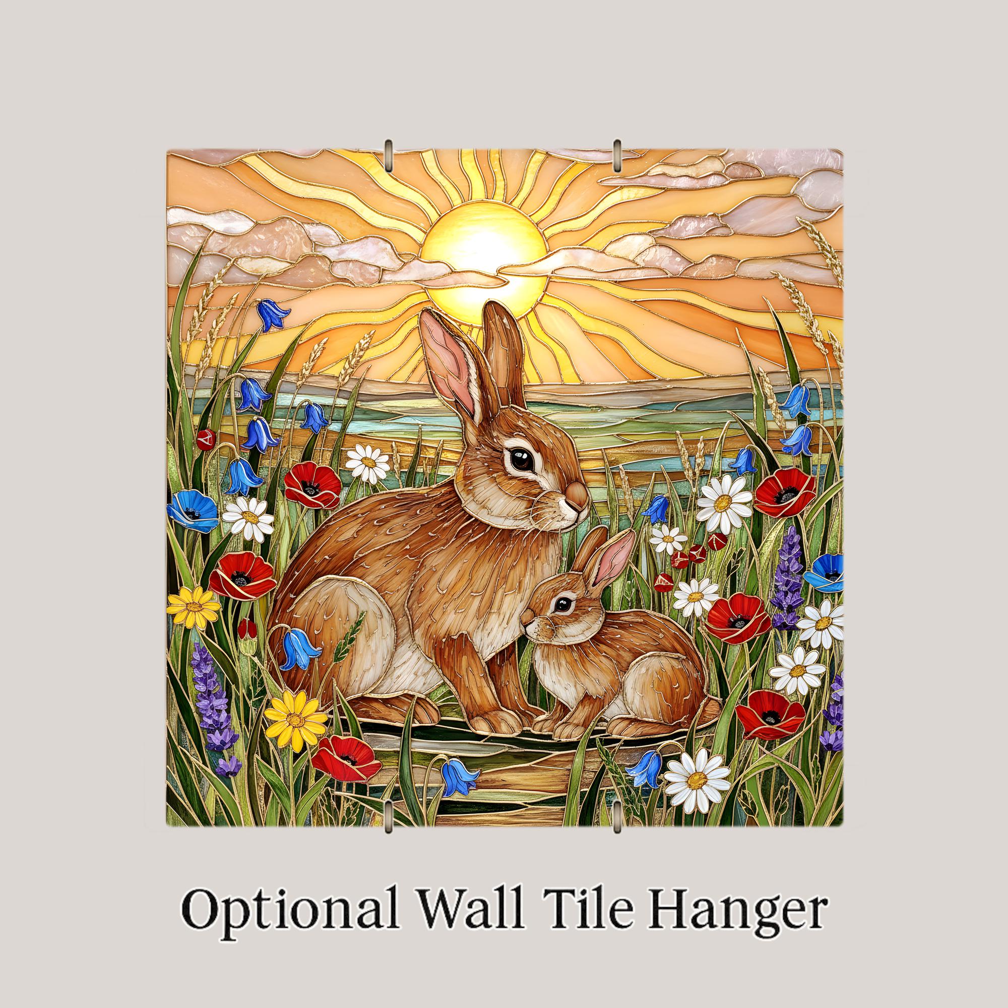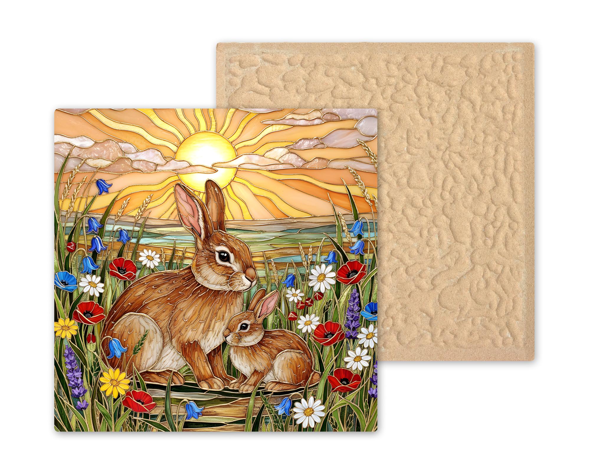 A golden sunrise rises over a quiet meadow. Wildflowers bloom in every direction. A mother rabbit sits protectively beside her baby, creating a peaceful moment of connection.
