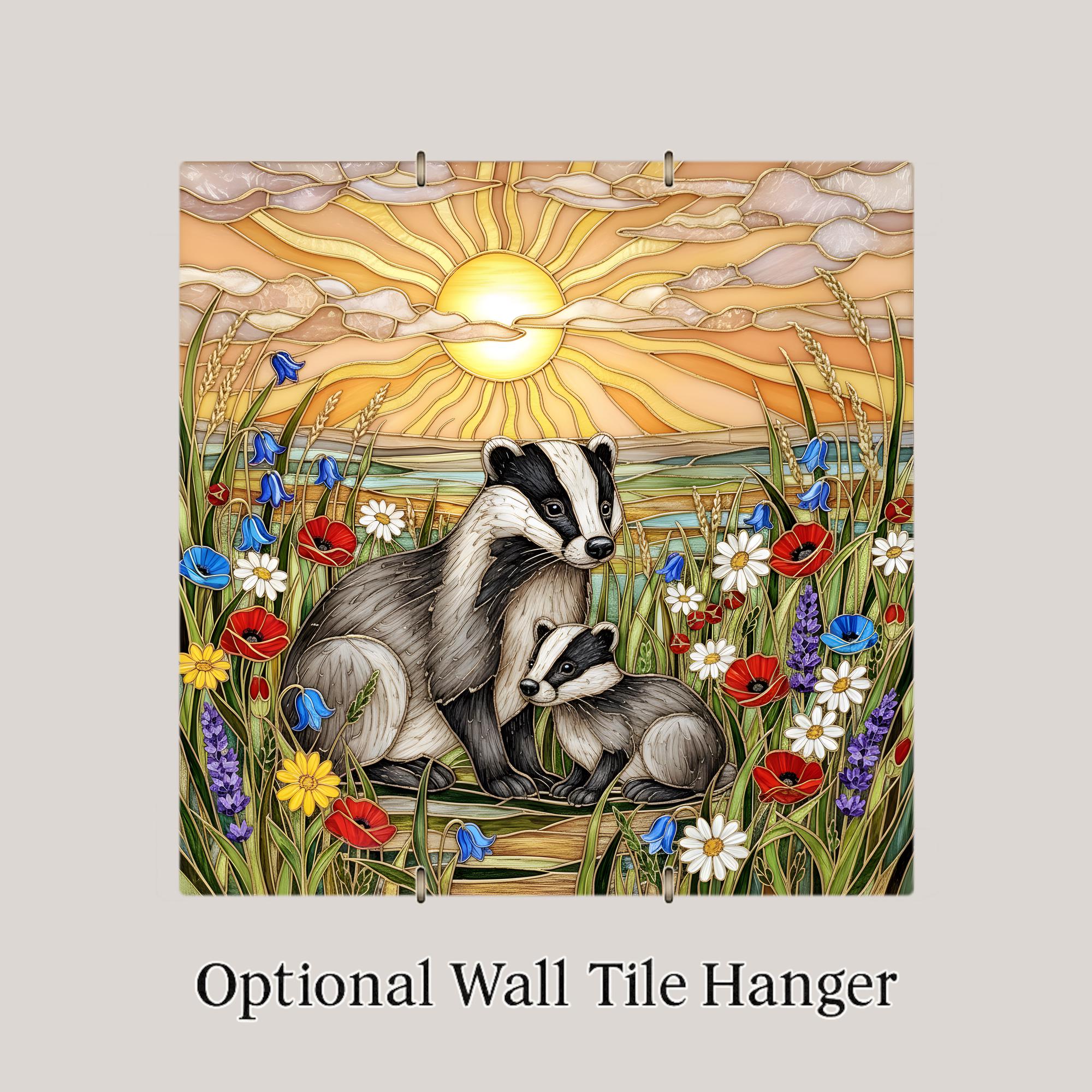 There’s something timeless about a meadow at sunset. The golden sky, the gentle field grasses, and the quiet protection of a mother and cub resting together. This badger wall art captures that peaceful woodland moment in a luminous stained glass inspired style.