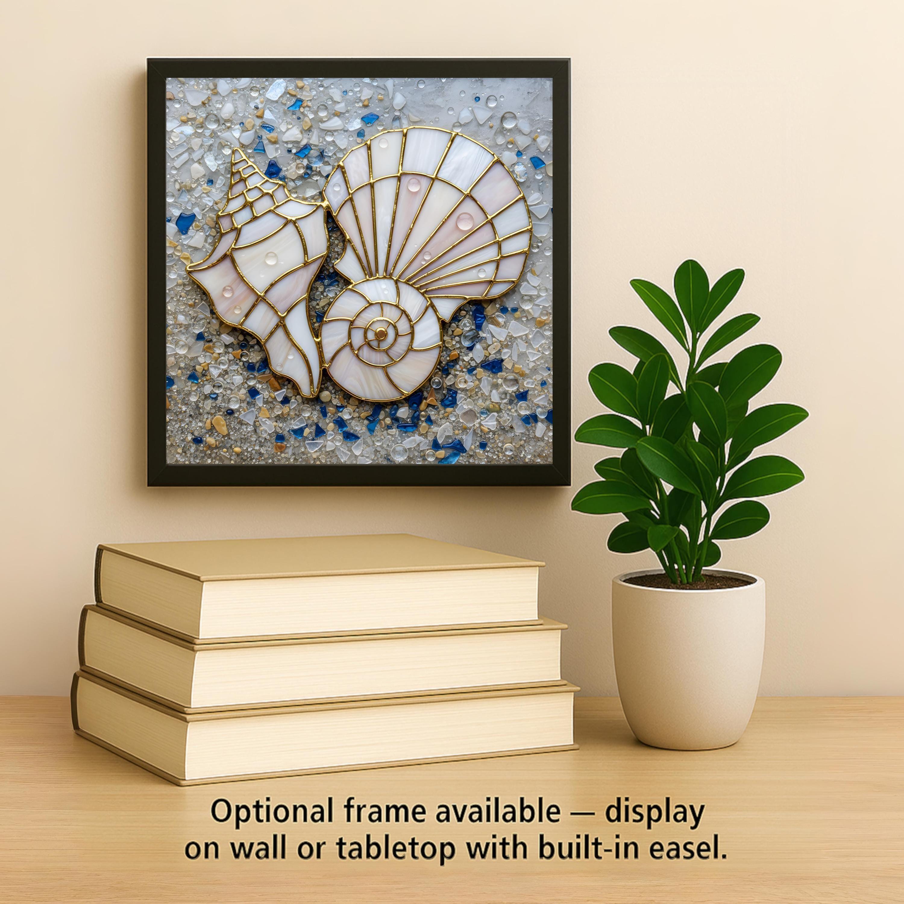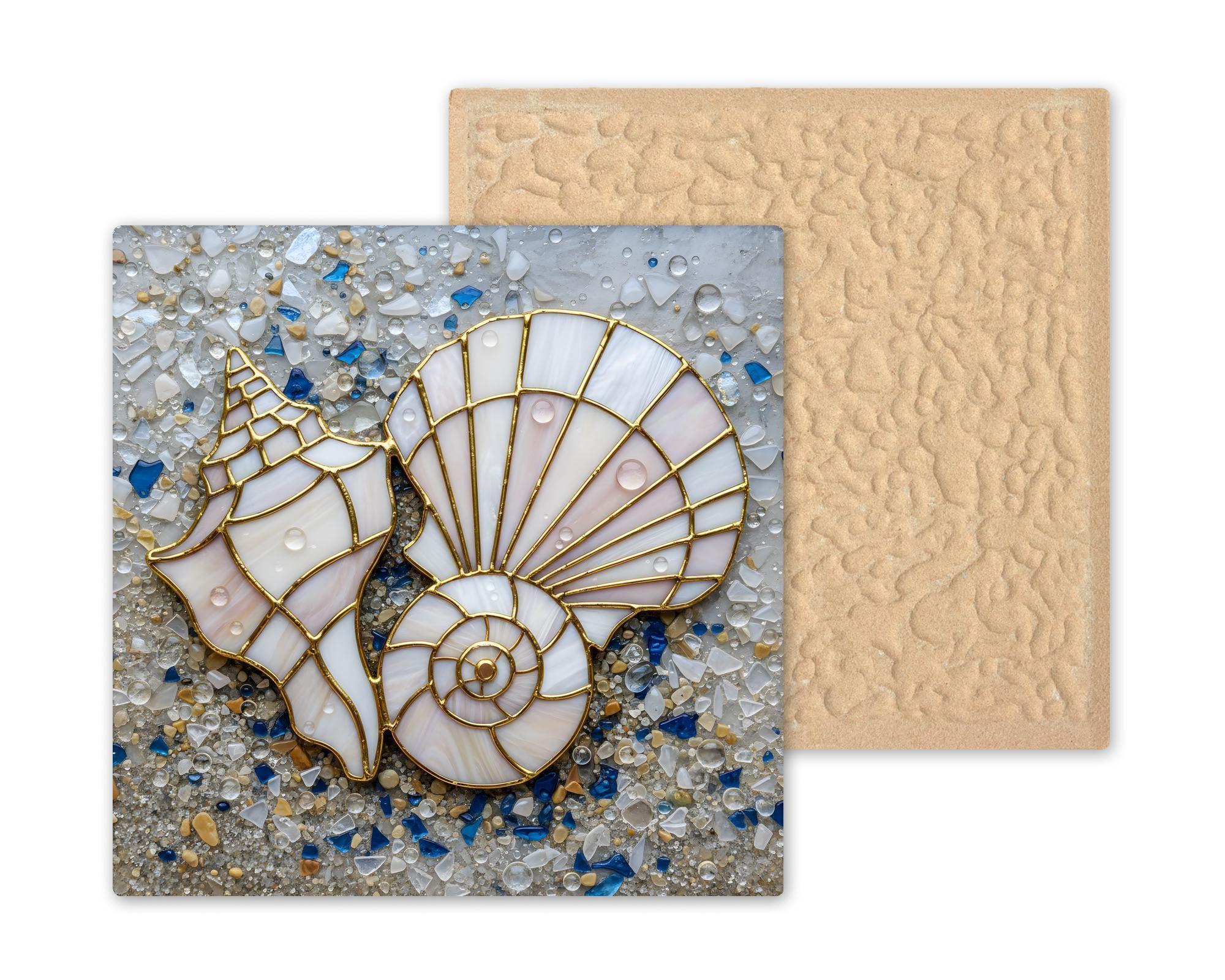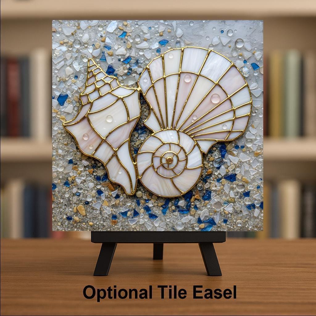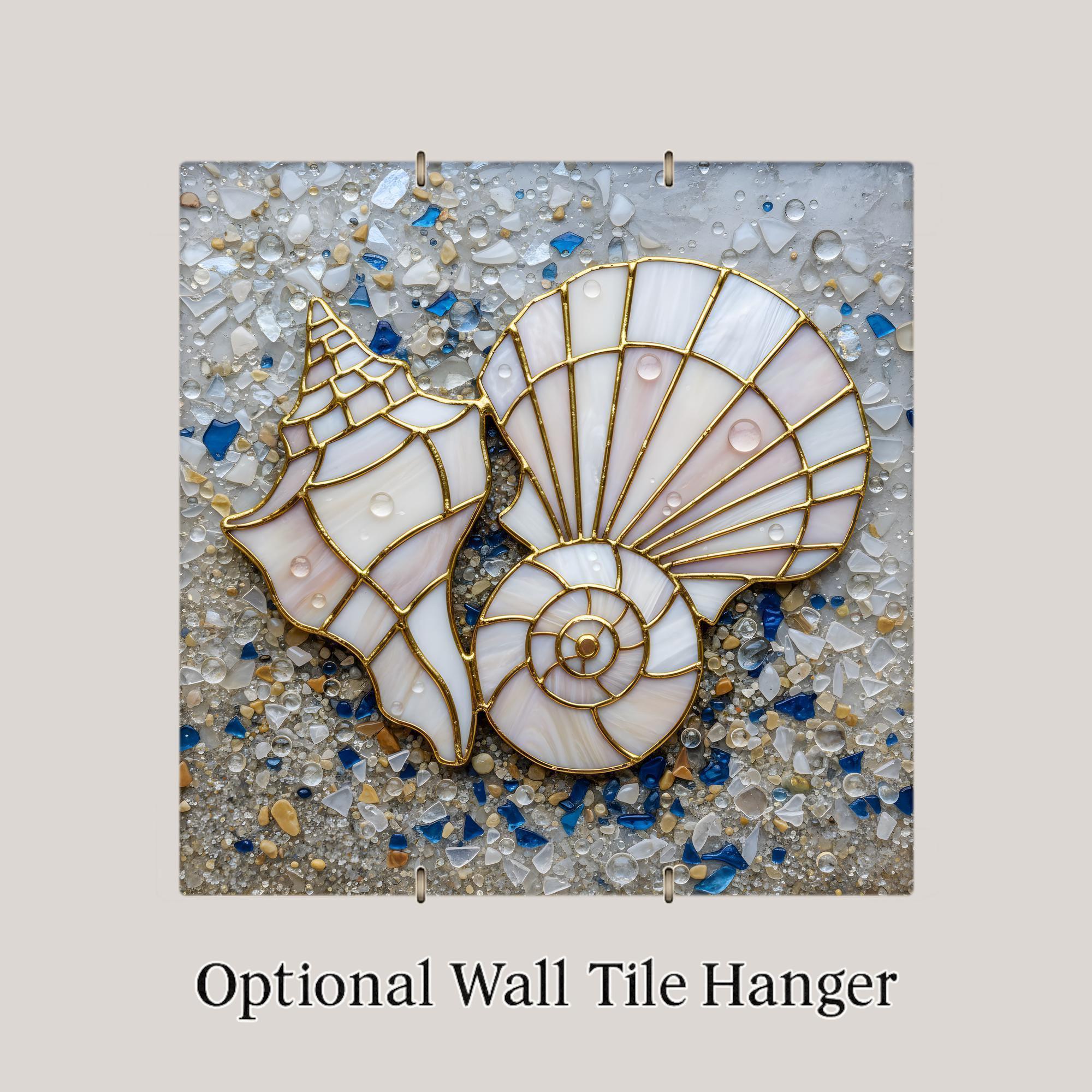 This coastal wall art ceramic tile captures that feeling in a refined stained glass inspired design. The gold-lined shells contrast beautifully against the sea glass background, blending ivory, soft blush, and ocean blue tones. The result is elegant beach decor that feels collected rather than themed.