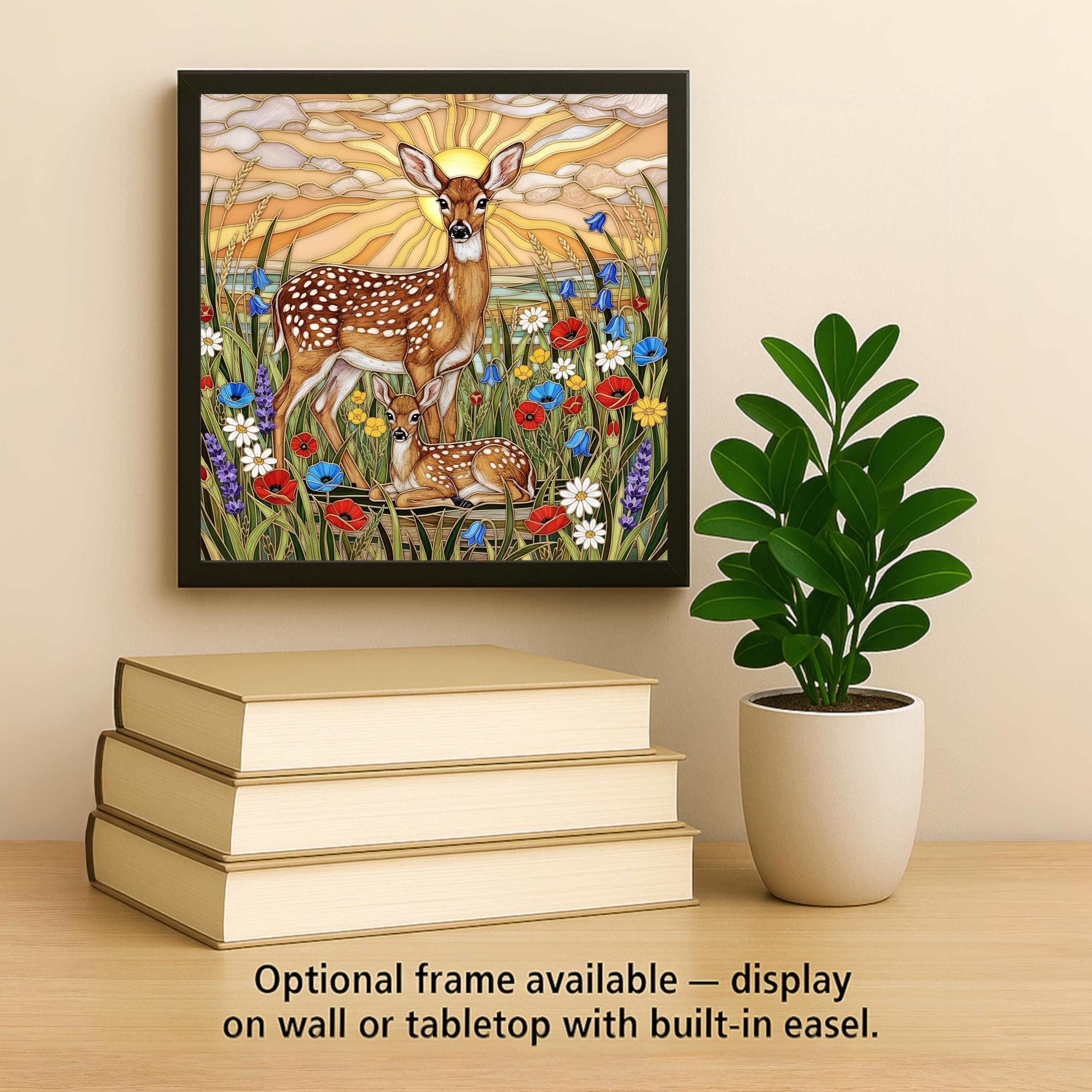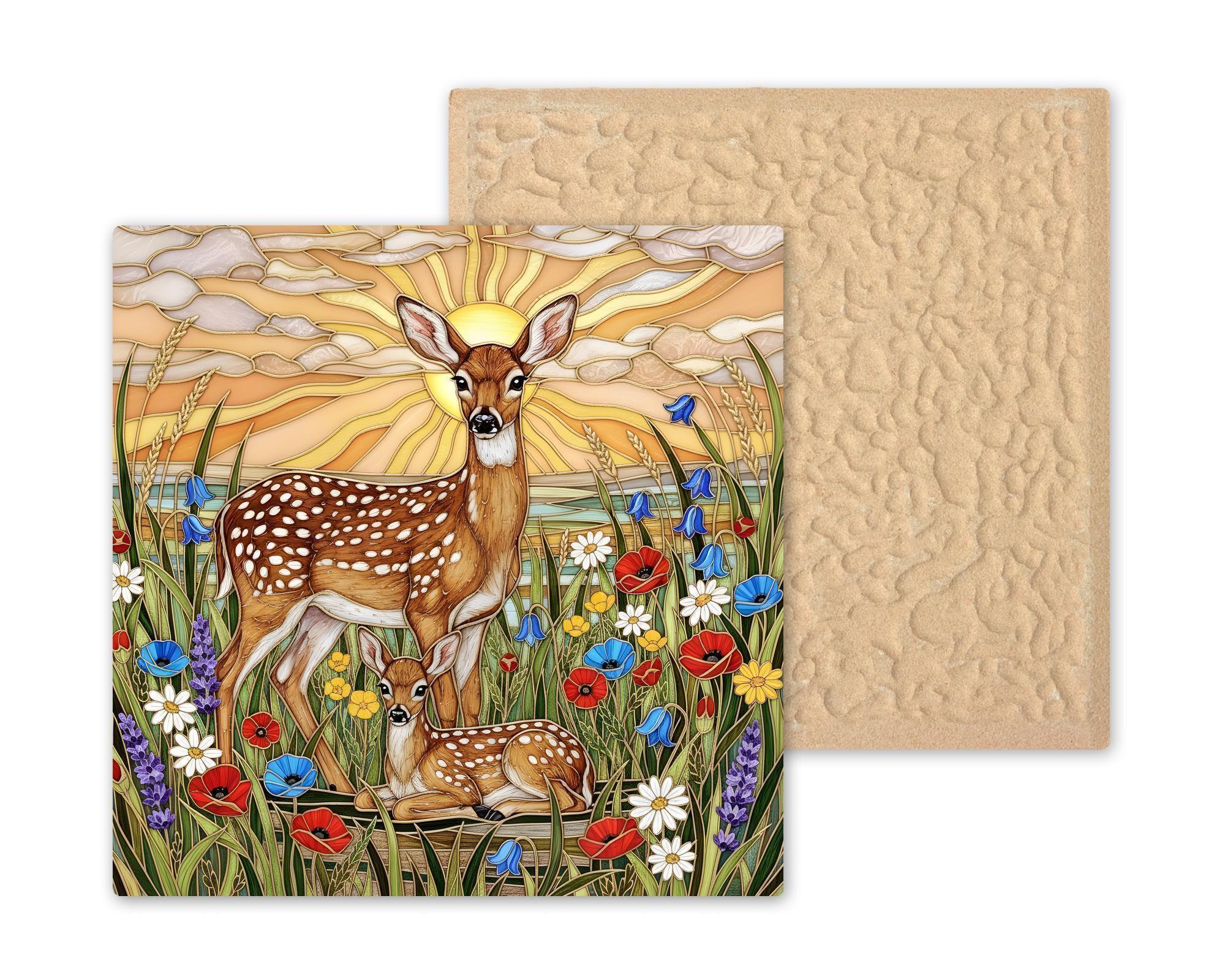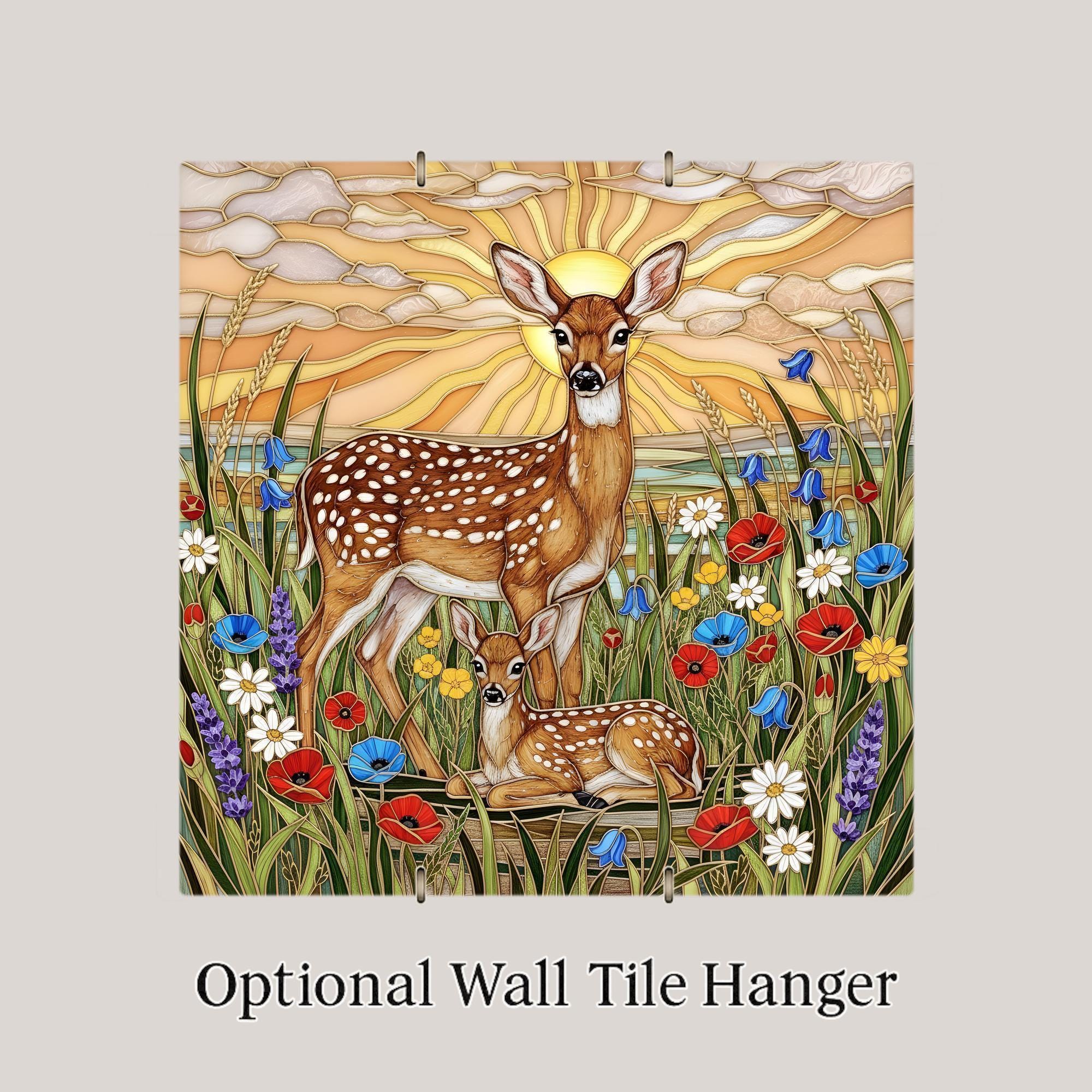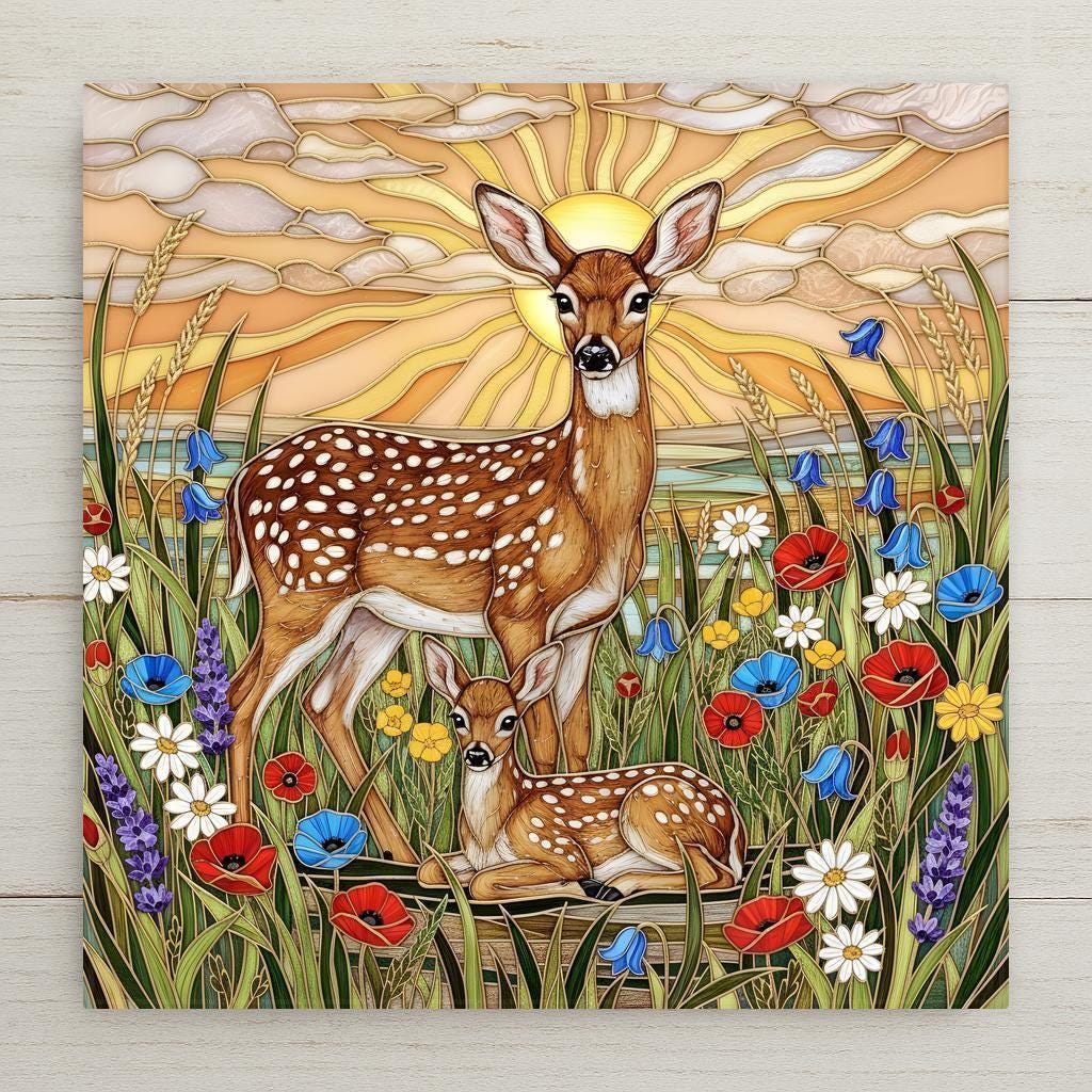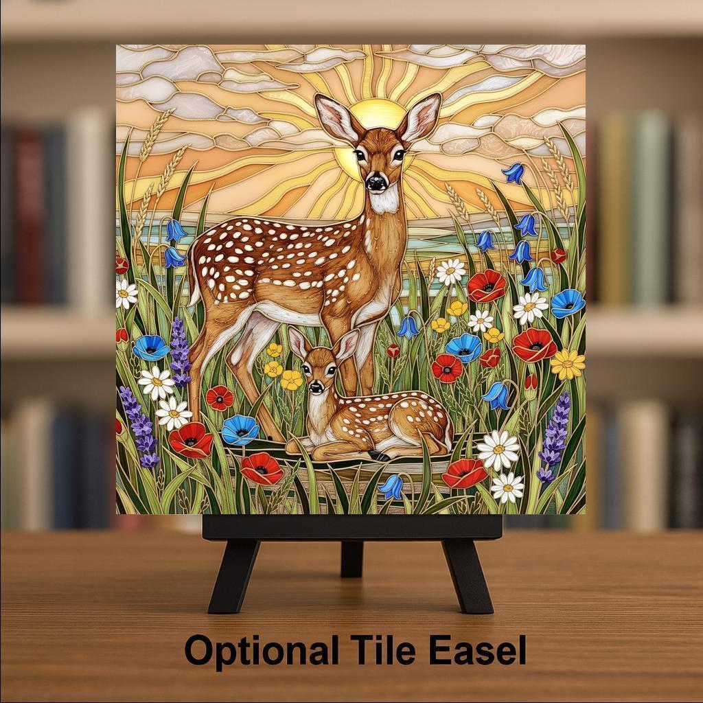 This deer wall art ceramic tile captures that feeling in a luminous stained glass inspired design. Radiant sunset light spreads across layered clouds while wild meadow flowers surround the pair in color and movement. The scene feels peaceful yet alive.