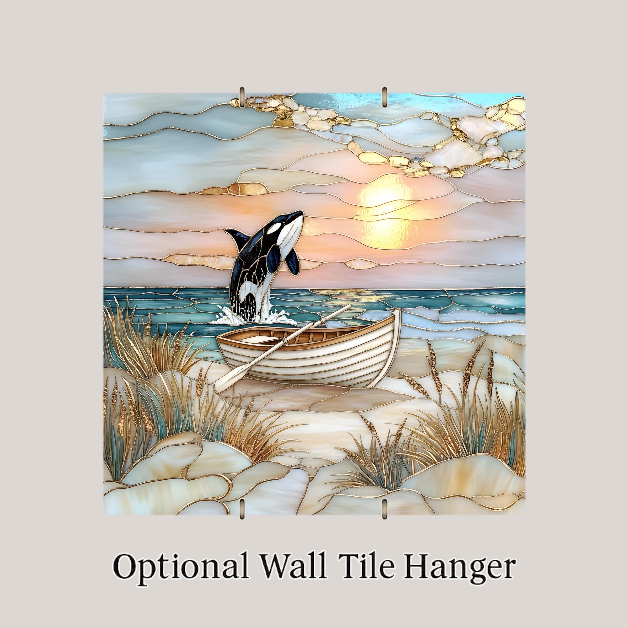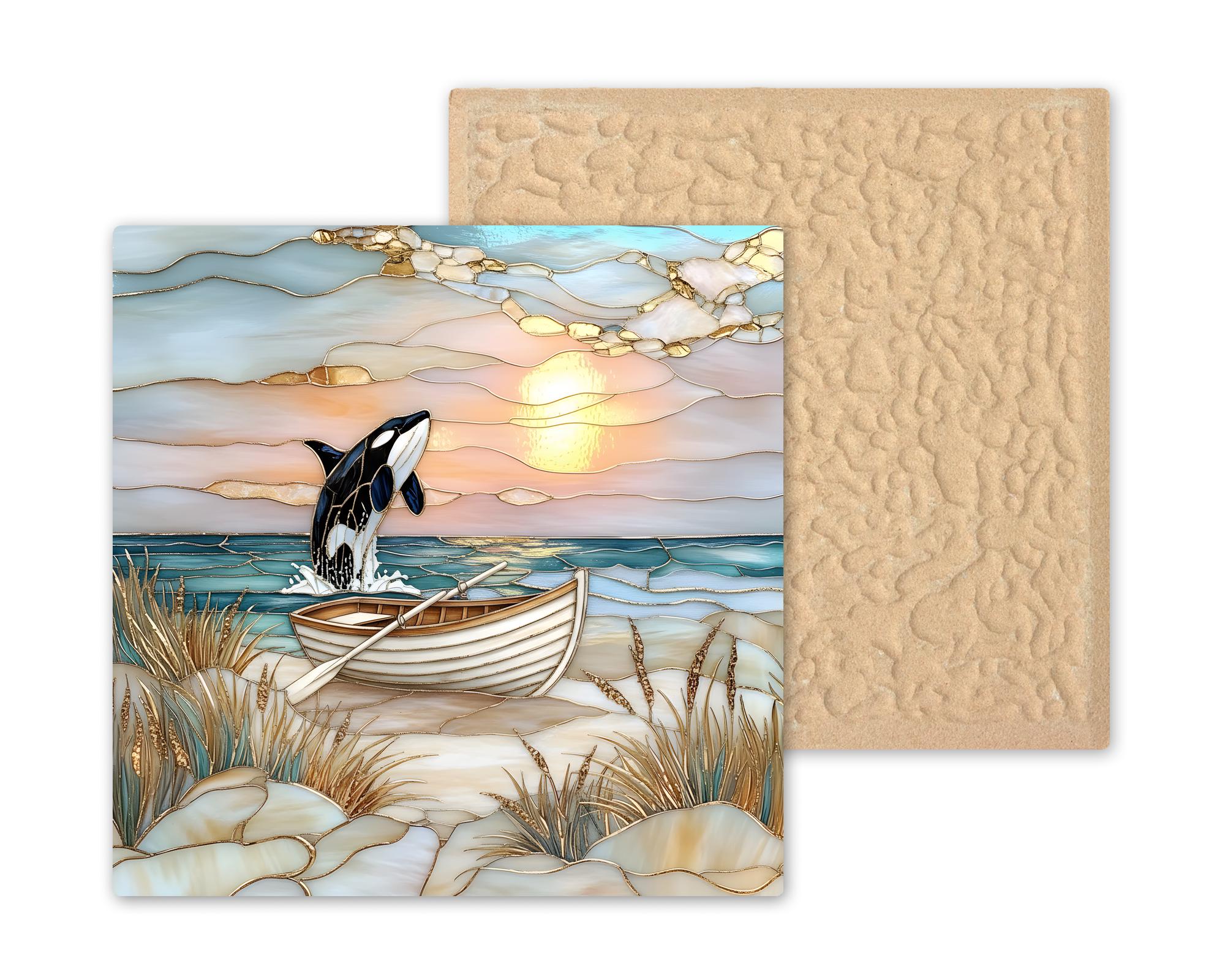 This coastal wall art ceramic tile captures that moment in a refined stained glass inspired design. Soft pastel skies blend with teal waters while the orca becomes the dramatic focal point against the glowing sun. The composition balances strength and serenity — movement and calm.
