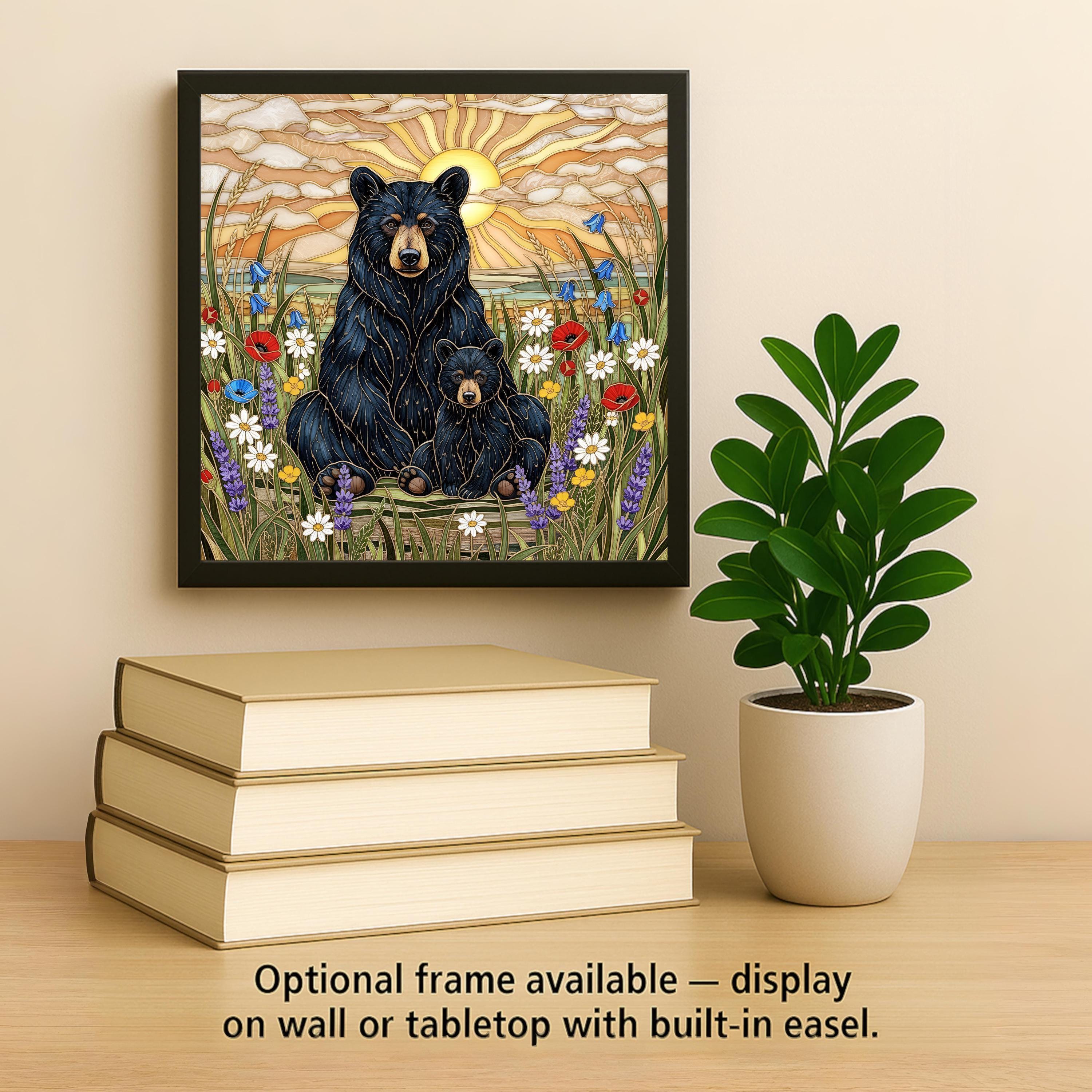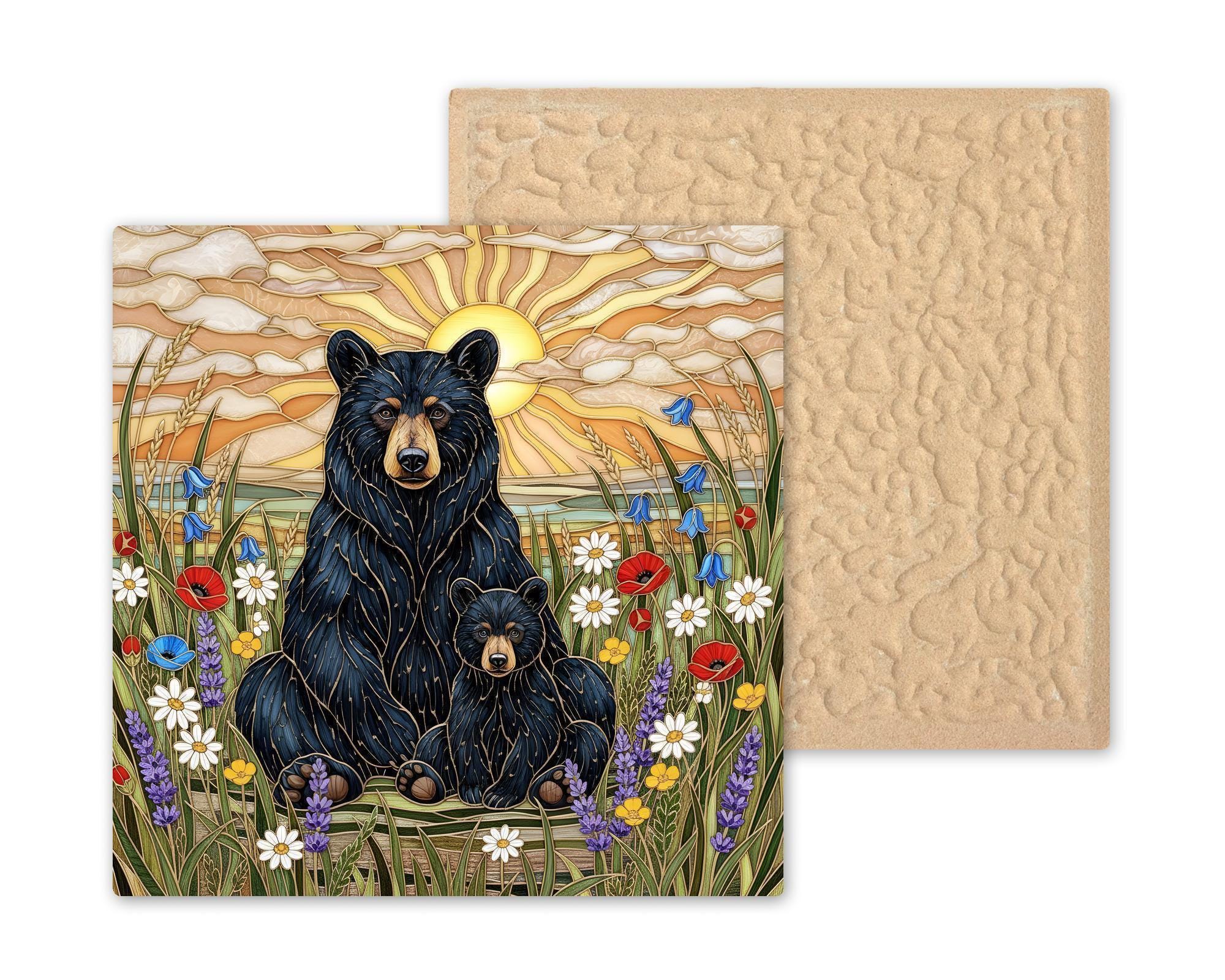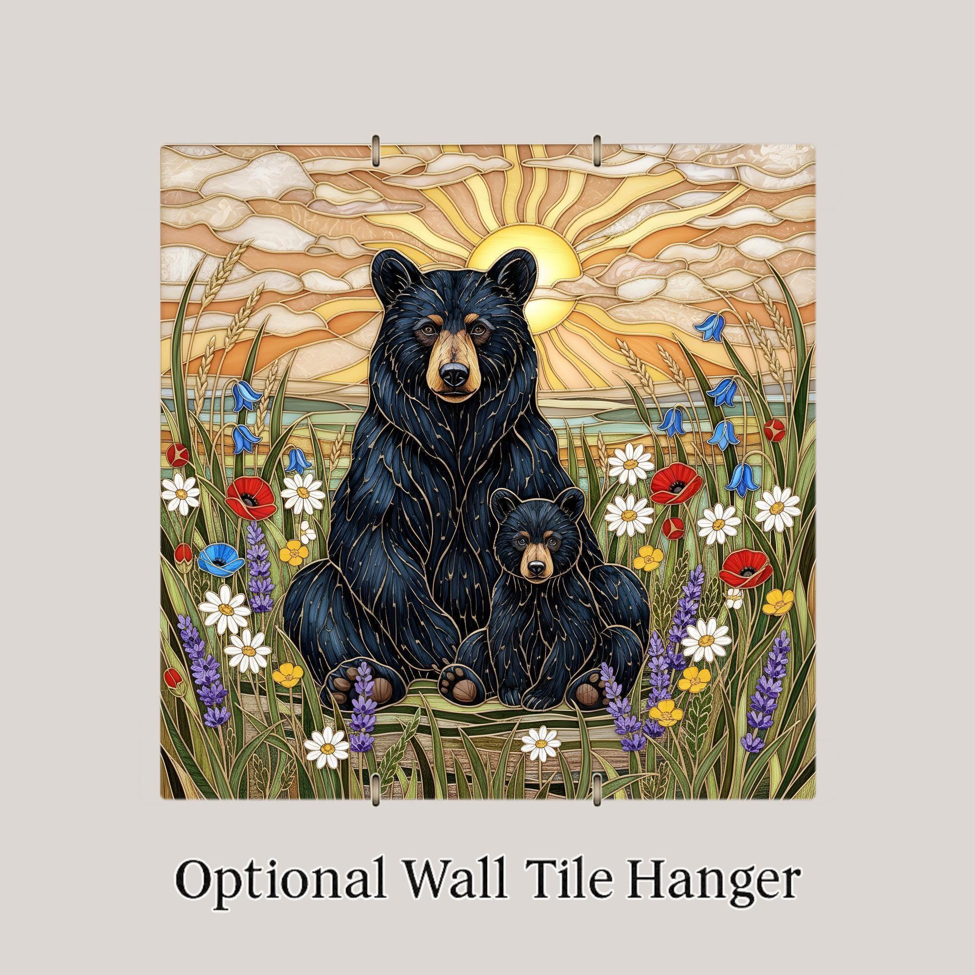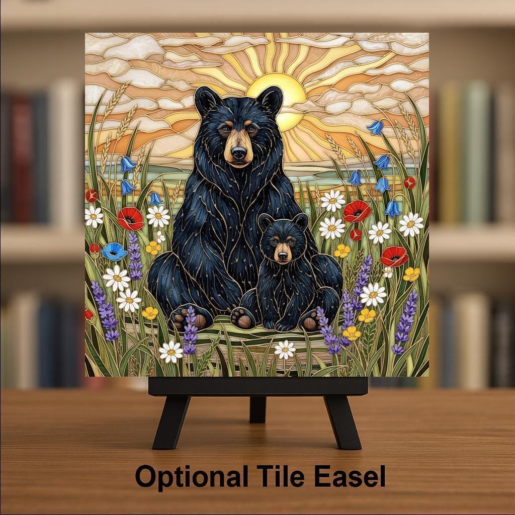 This black bear and cub wildlife wall art ceramic tile captures that feeling in a luminous stained glass inspired design. The golden sunset creates a radiant backdrop while wild meadow flowers soften the scene. The balance between strength and tenderness gives this piece emotional depth.