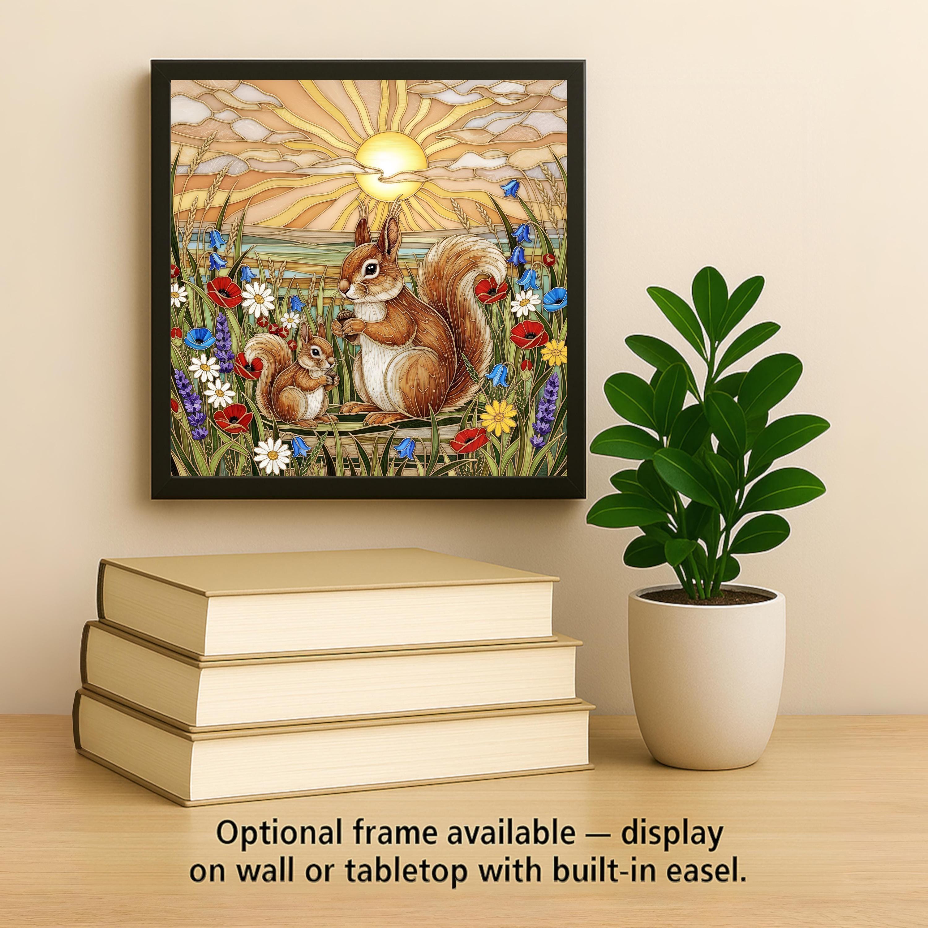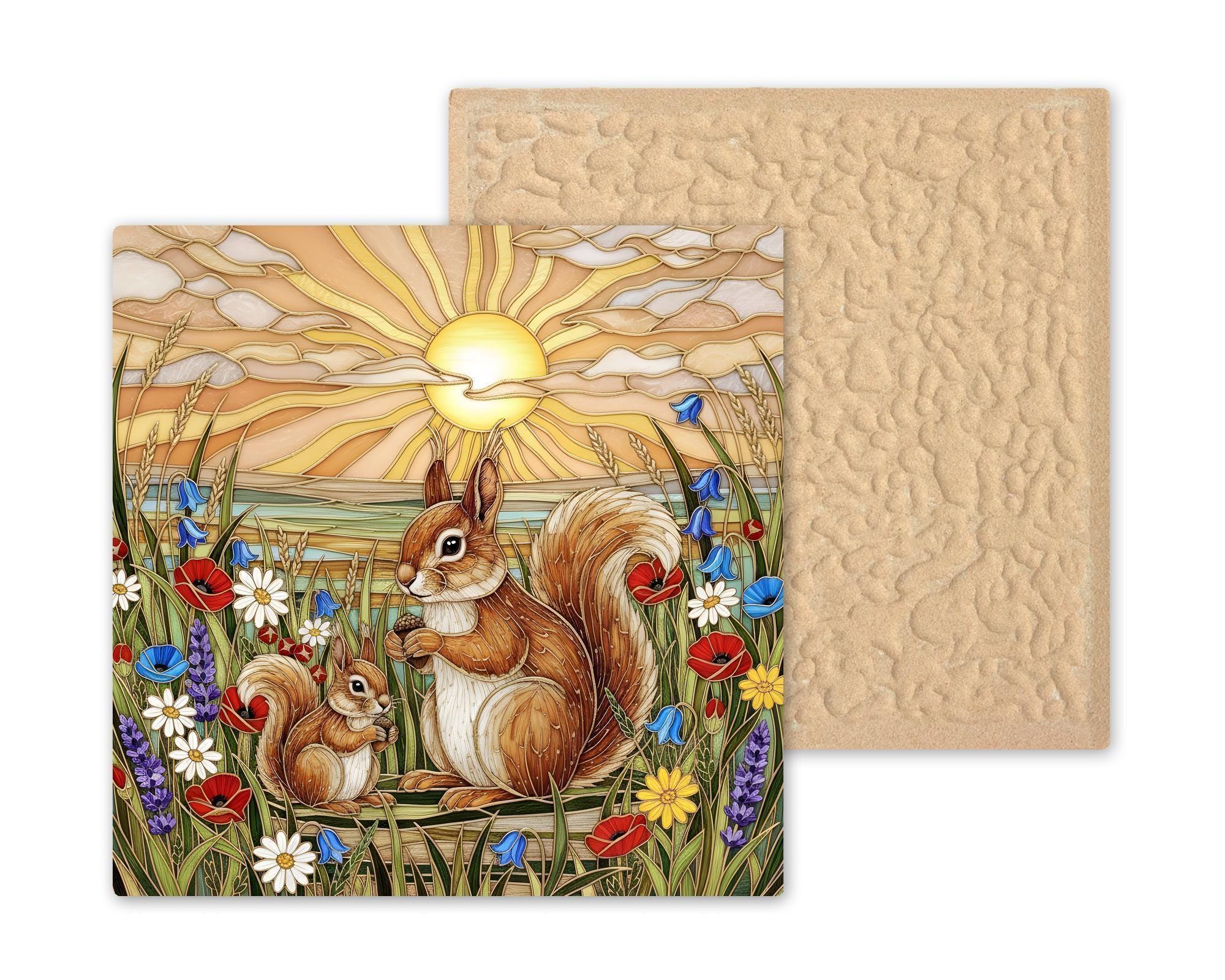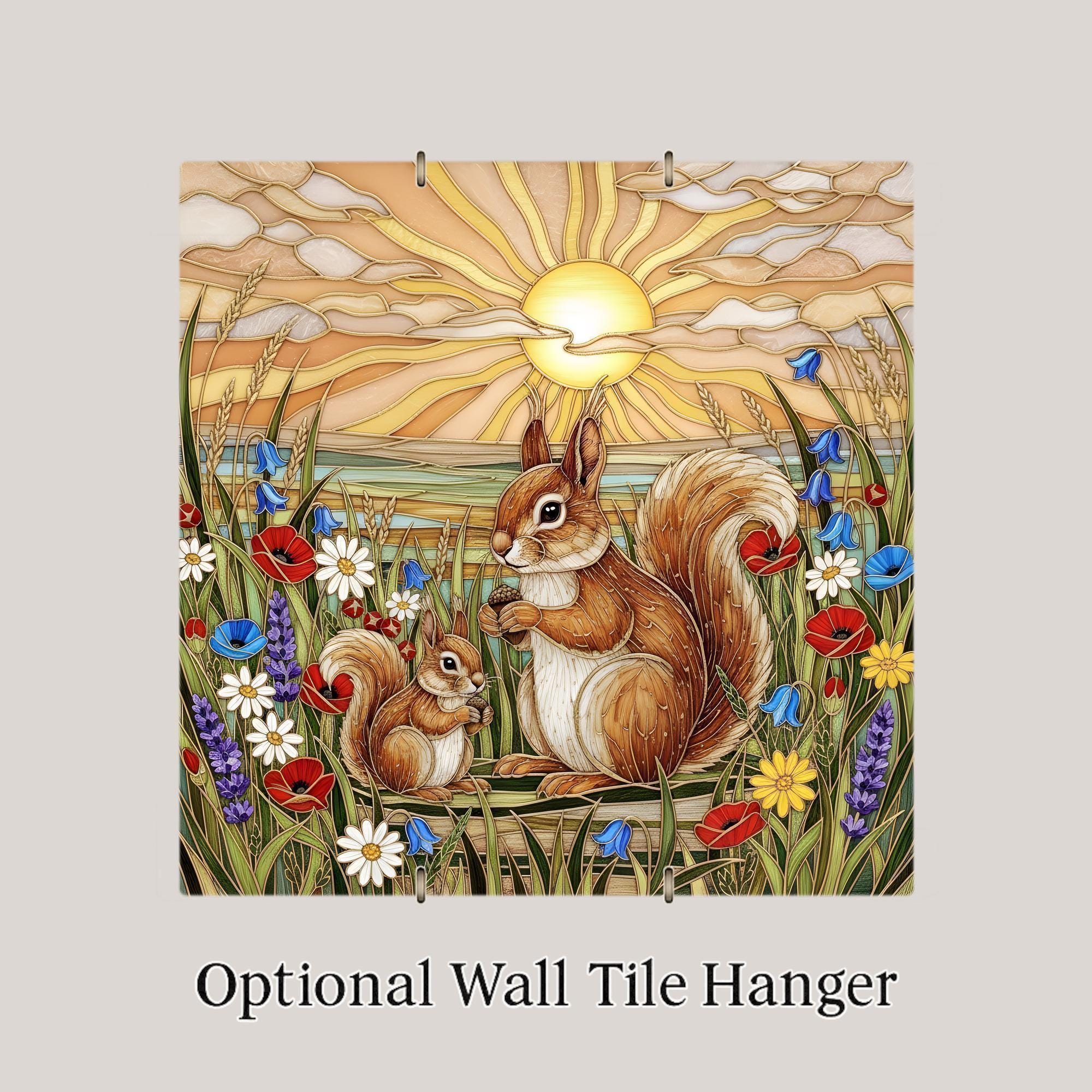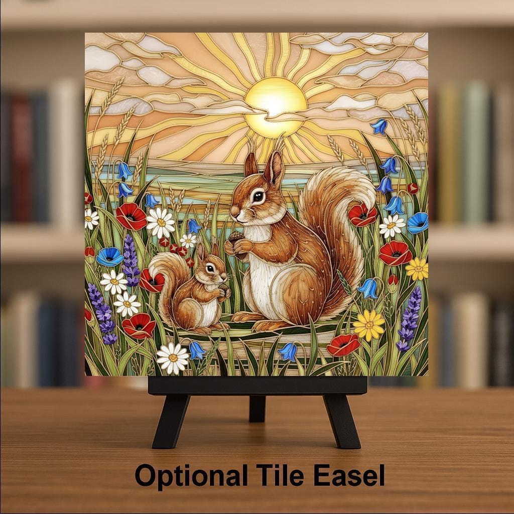 This squirrel wall art ceramic tile captures that gentle connection in a luminous stained glass inspired design. The radiant sunset sky glows behind the pair while colorful wildflowers frame the scene in vibrant detail. The acorns add a subtle symbol of preparation, abundance, and home.