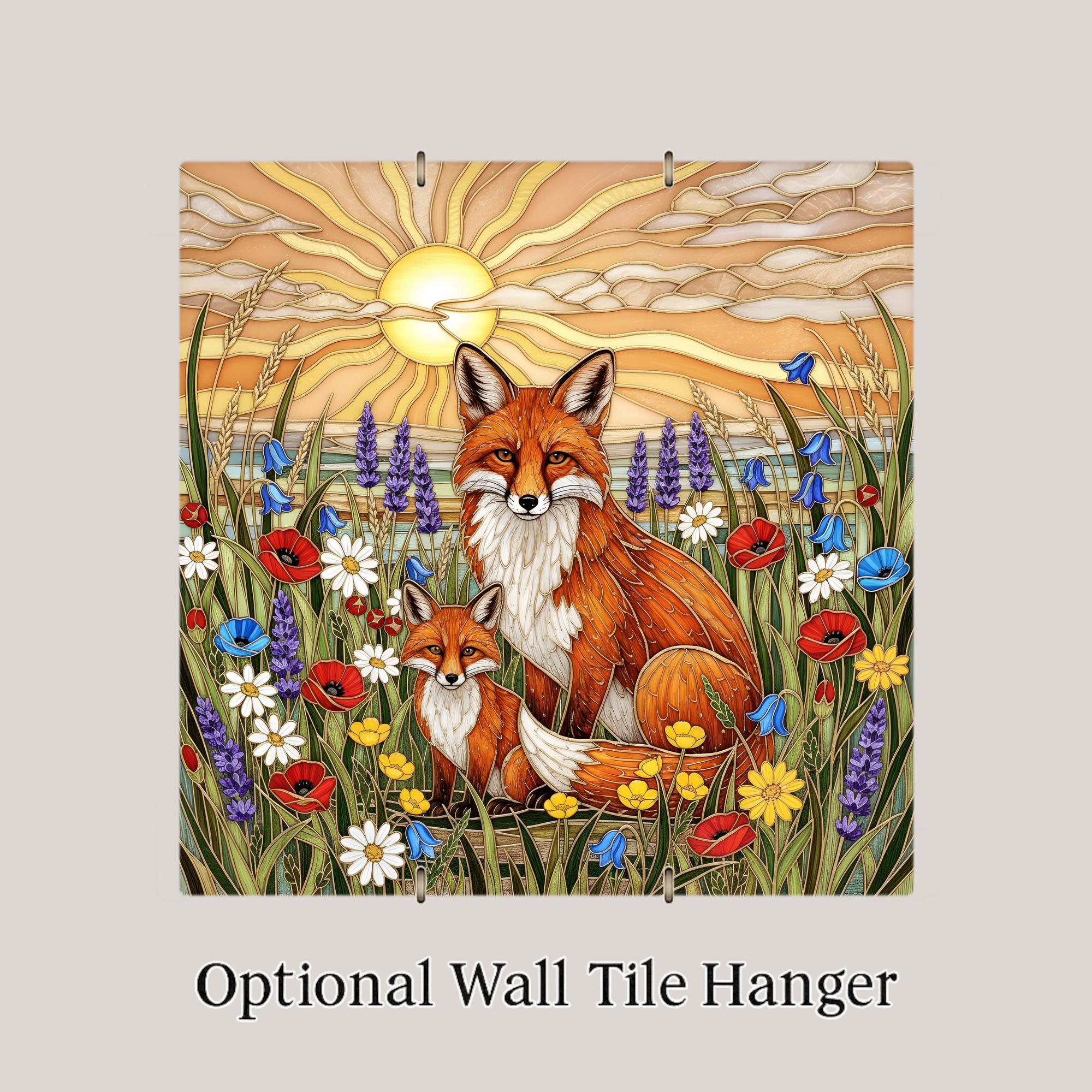 This fox wall art ceramic tile captures that spirit in a luminous stained glass inspired design. The radiant sunset sky creates a glowing backdrop while wild meadow flowers bring color and softness to the composition. The balance between strength and tenderness gives this piece emotional warmth.