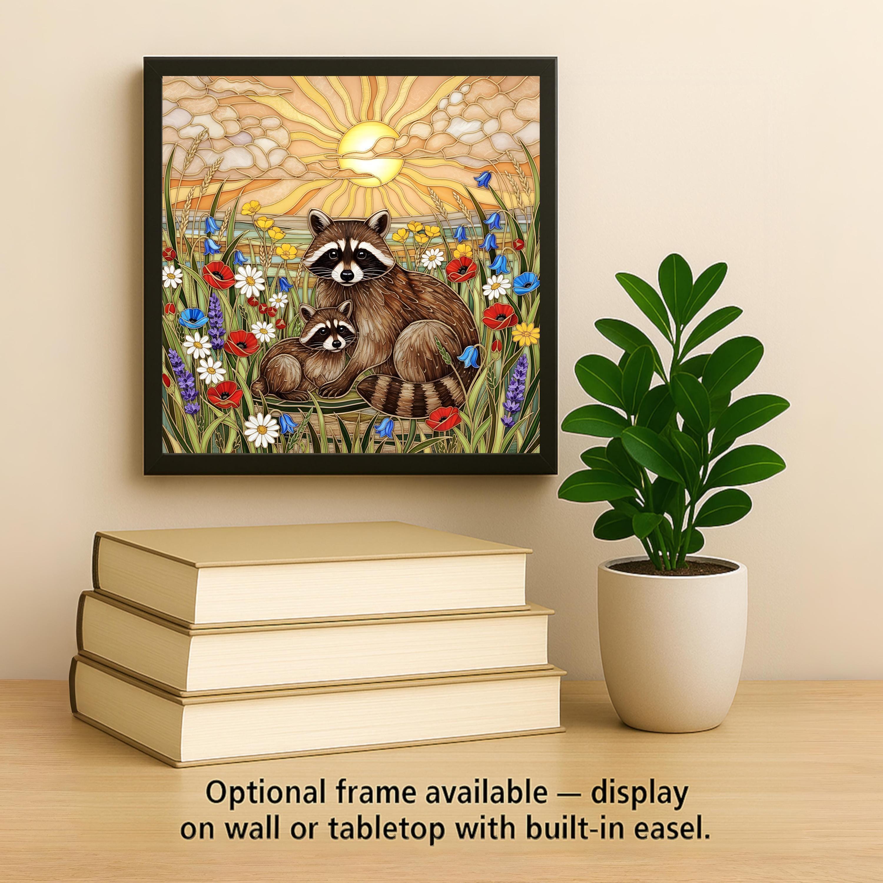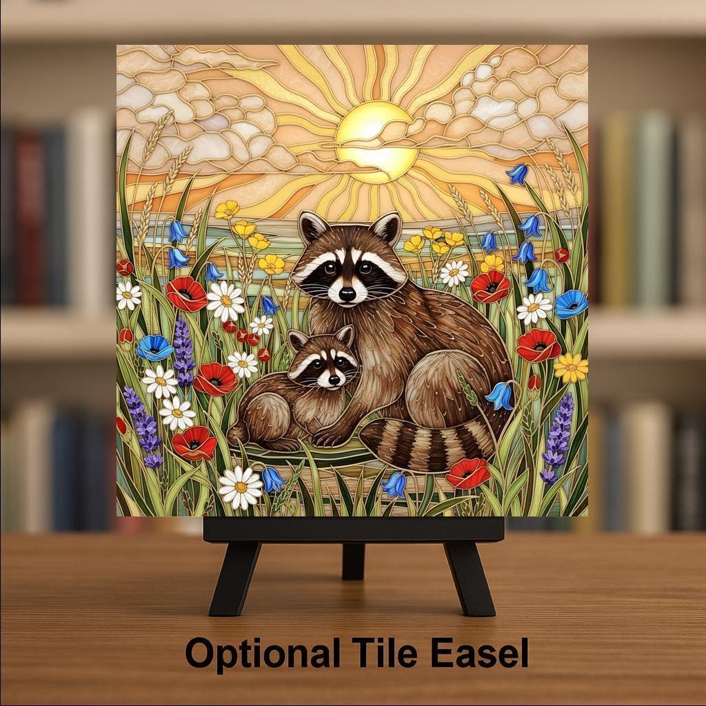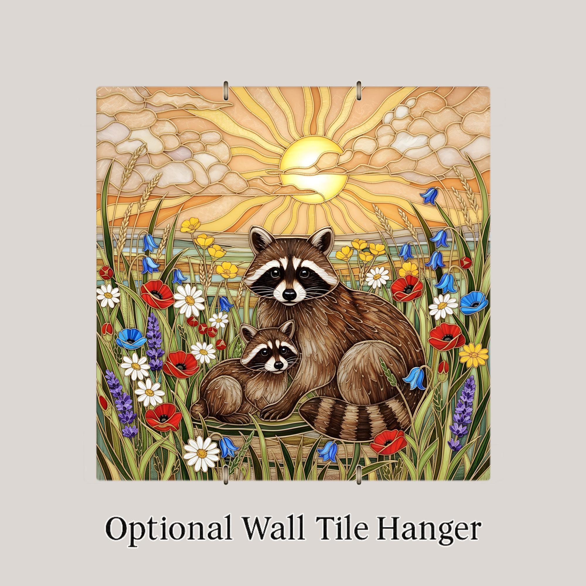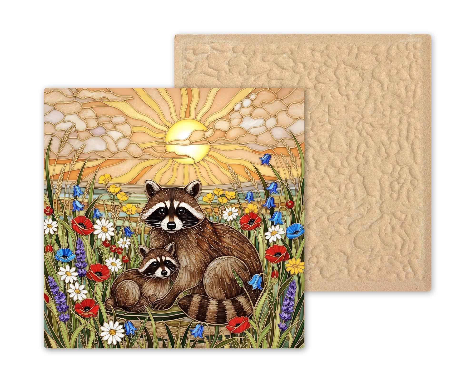 This raccoon wall art ceramic tile captures the quiet beauty of woodland life at golden hour. The layered sunset sky radiates soft light while wildflowers frame the mother and baby raccoon in a peaceful meadow scene.