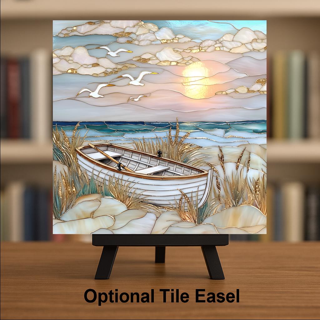 This coastal wall art ceramic tile captures the peaceful stillness of golden hour by the sea. A solitary rowboat rests in the dunes while seagulls drift across a radiant sky. The layered ocean waves shimmer beneath the setting sun.