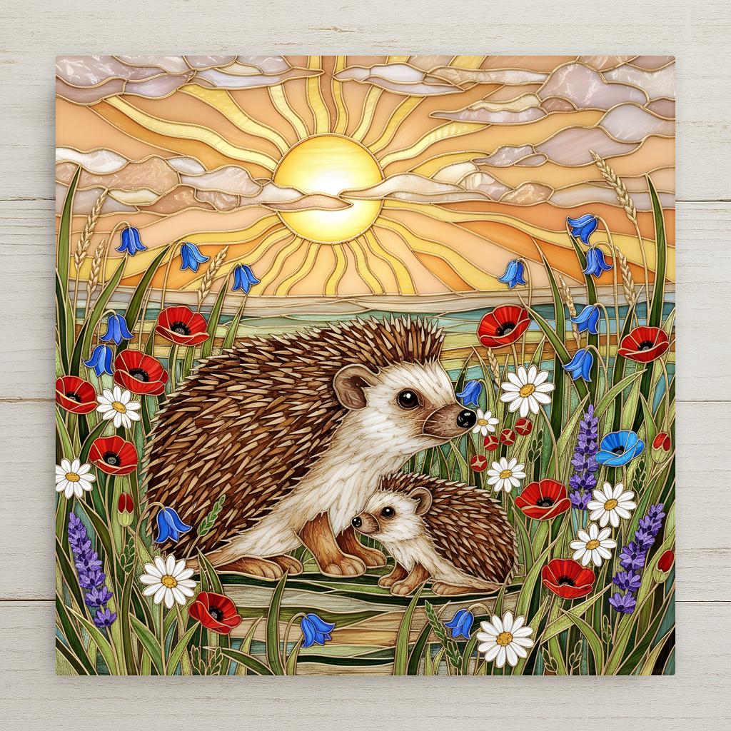 This hedgehog wall art ceramic tile captures a quiet golden hour in a blooming meadow. A mother and baby hedgehog stand surrounded by wildflowers as sunlight radiates across the sky and reflects gently over distant water. The scene feels calm, nurturing, and full of woodland warmth.