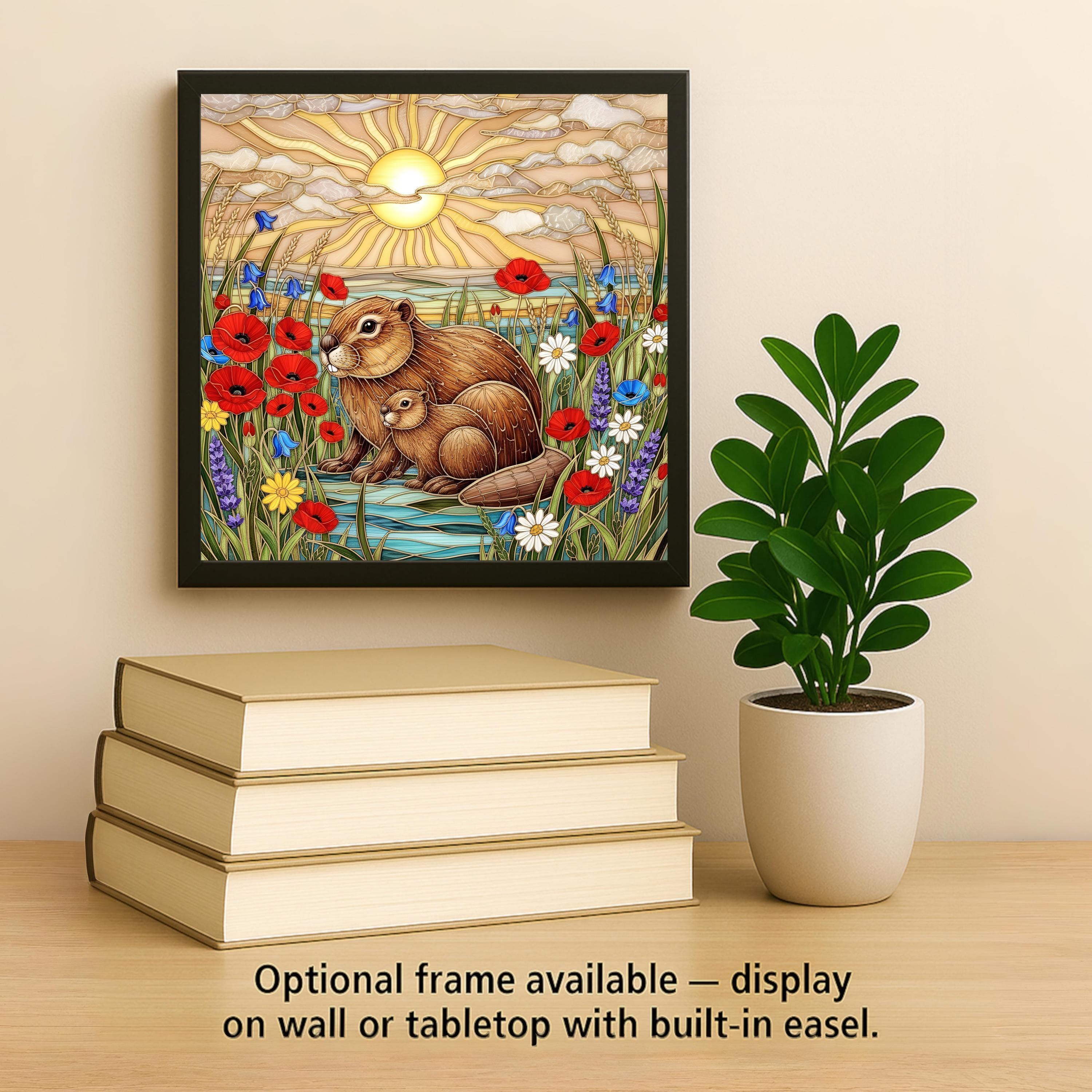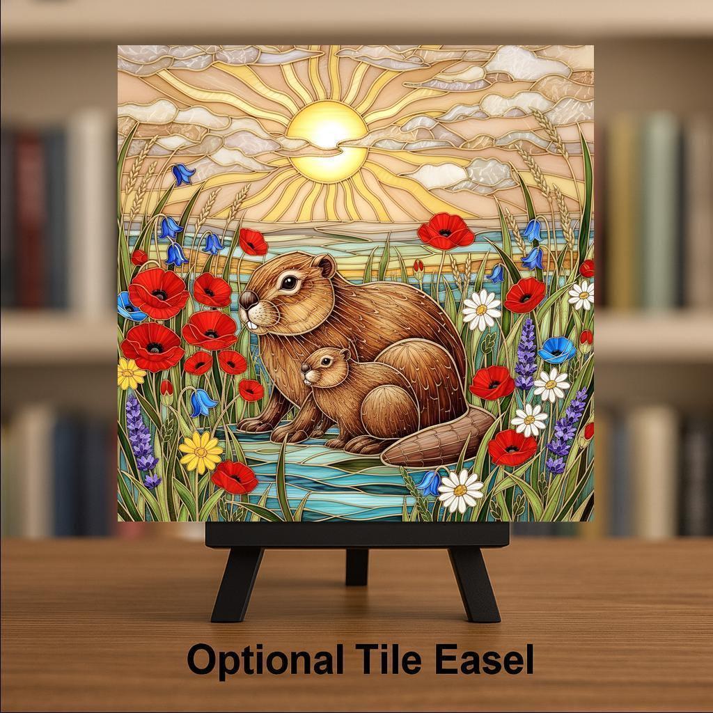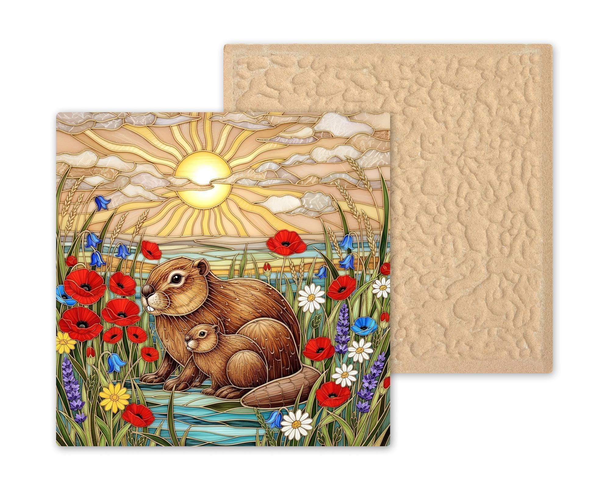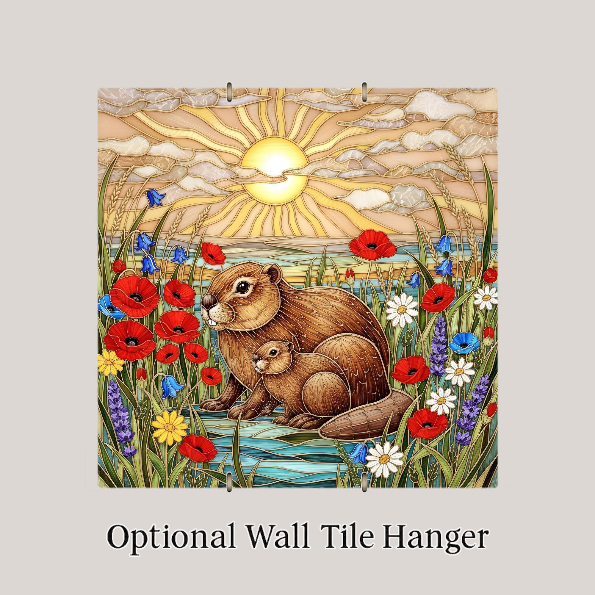This beaver wall art ceramic tile celebrates quiet mornings by the water and the gentle bond of woodland family life. A mother and baby beaver rest together in a field of wildflowers as the sun rises behind them, casting warm light across the sky and water. The composition is designed to feel calming and inviting, with rich earthy browns, bright floral accents, and soft golden tones that pair beautifully with rustic cabin decor and lake house home decor.