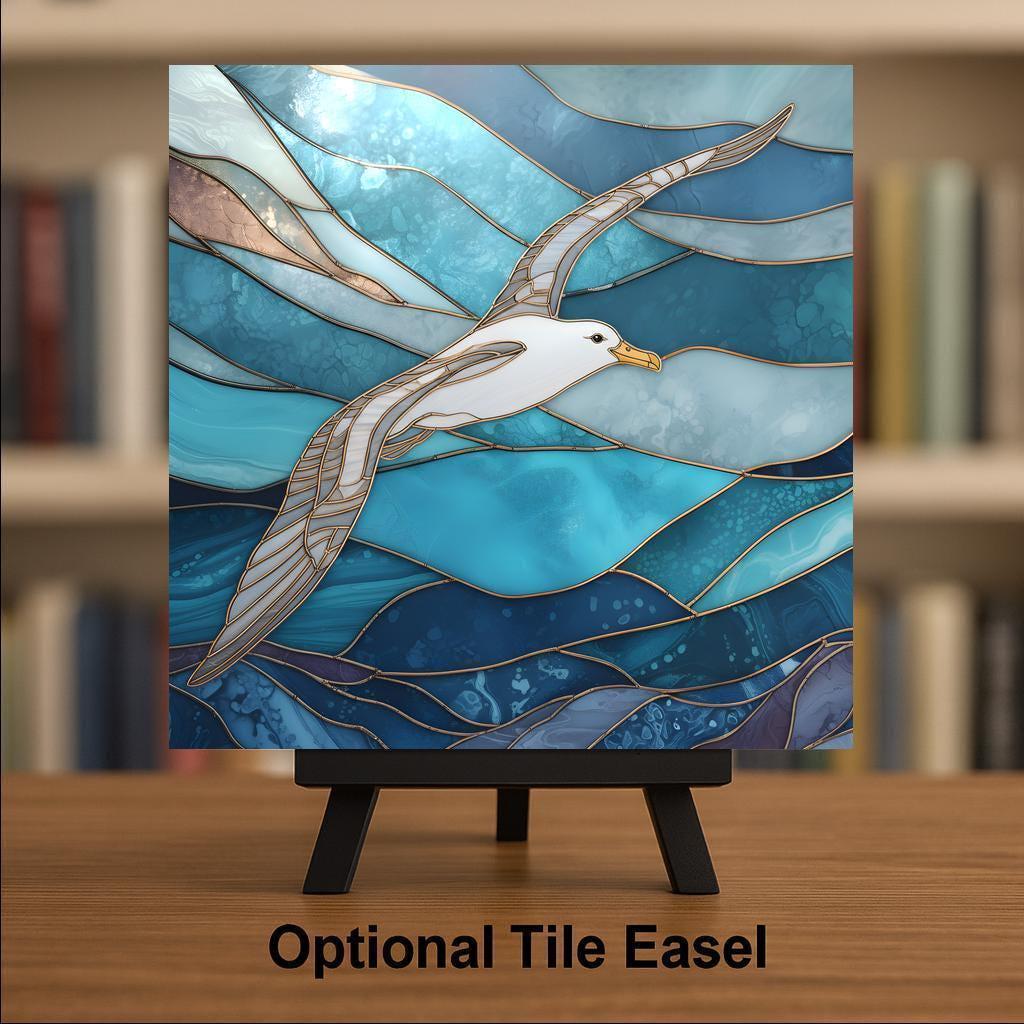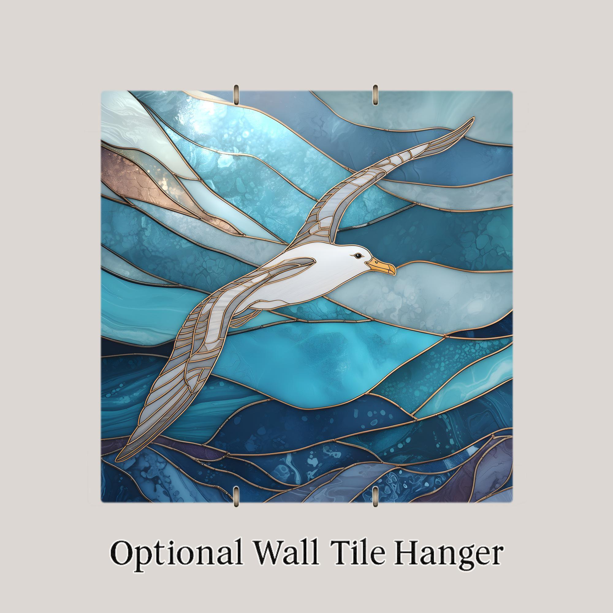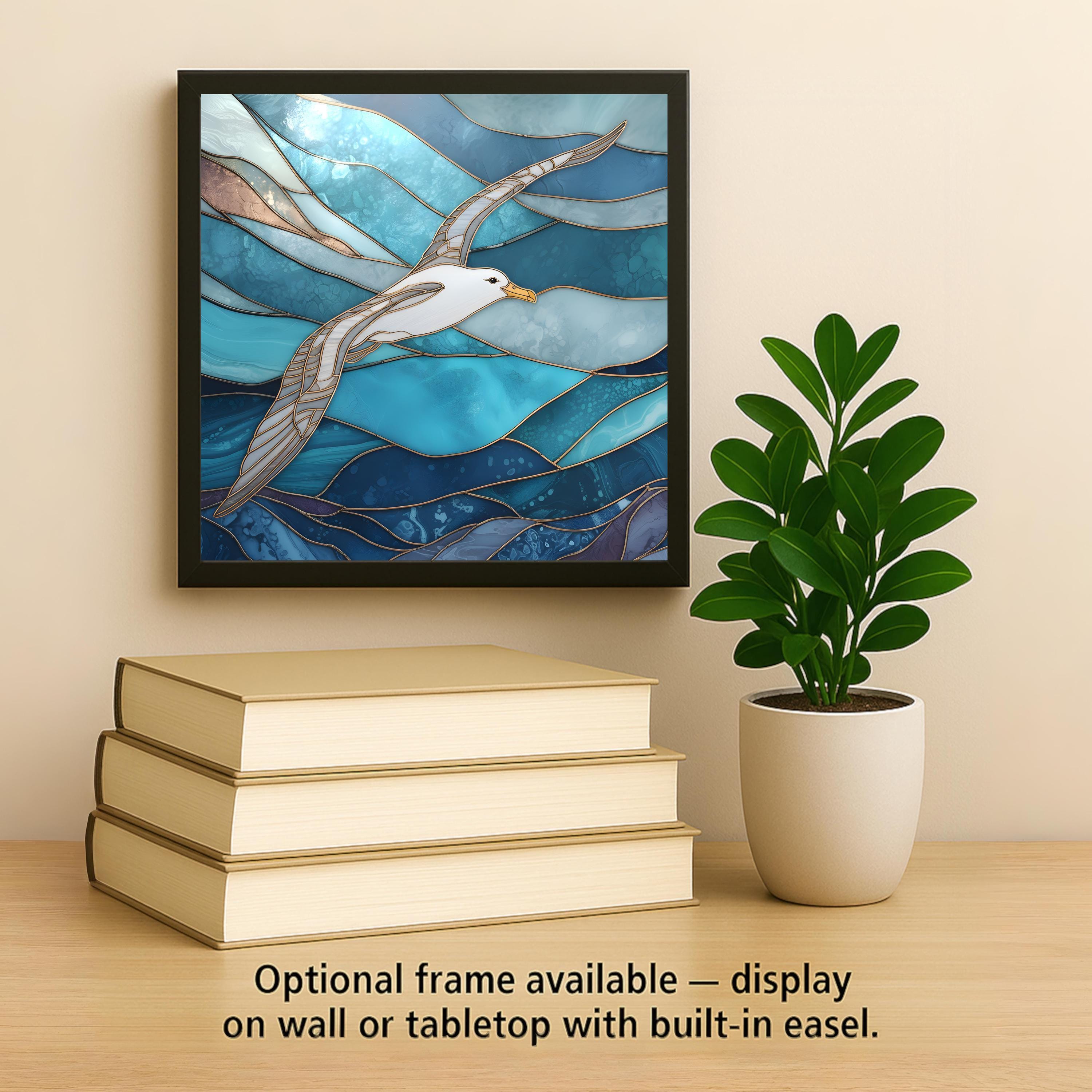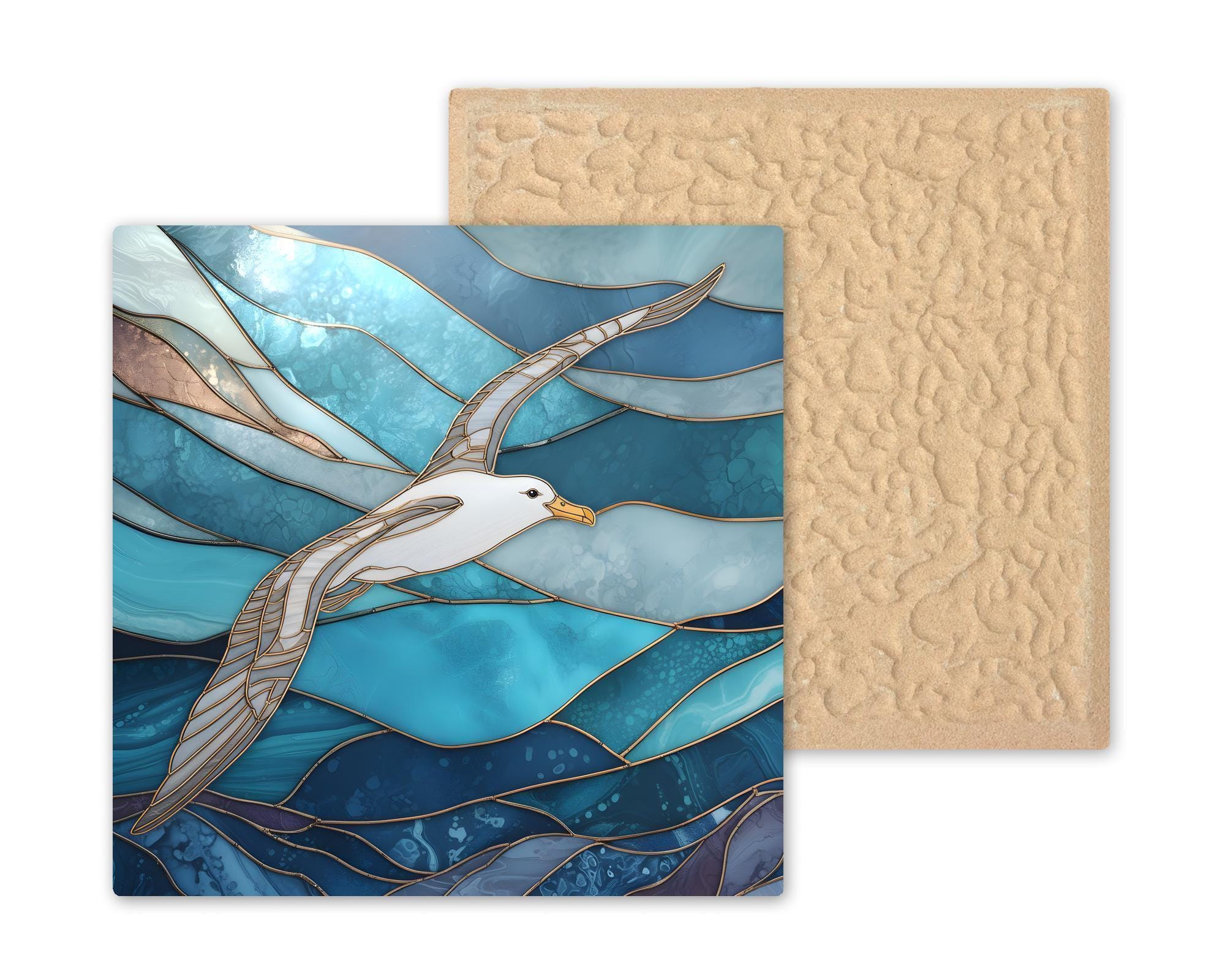 This seagull design captures the quiet power and openness of the shoreline. The sweeping wing lines echo the movement of the waves beneath, creating a unified, flowing composition inspired by stained glass techniques and Art Nouveau linework.