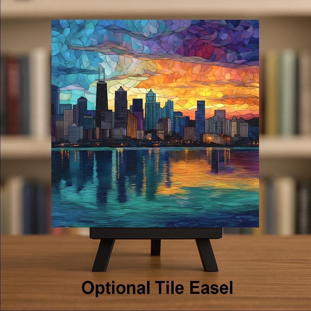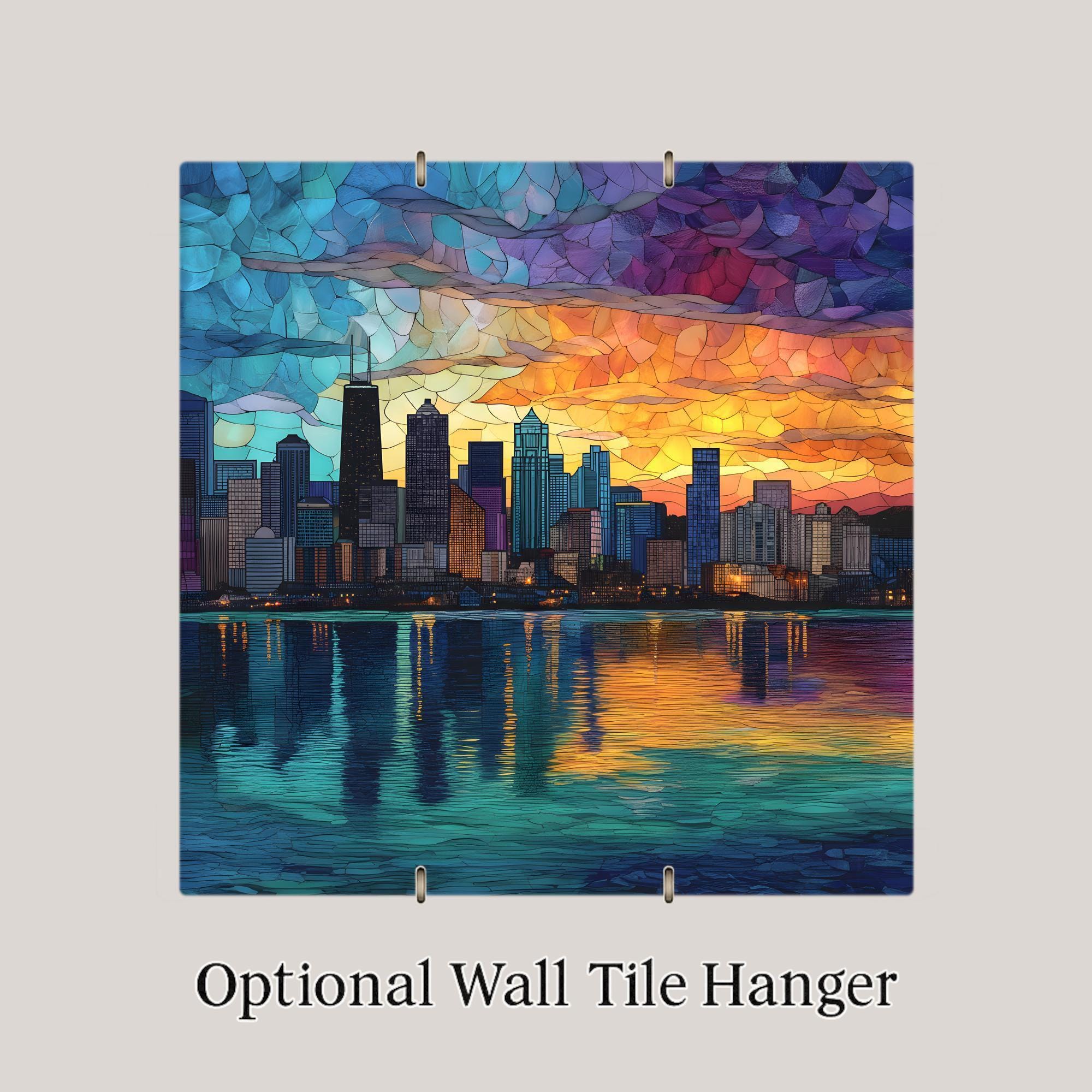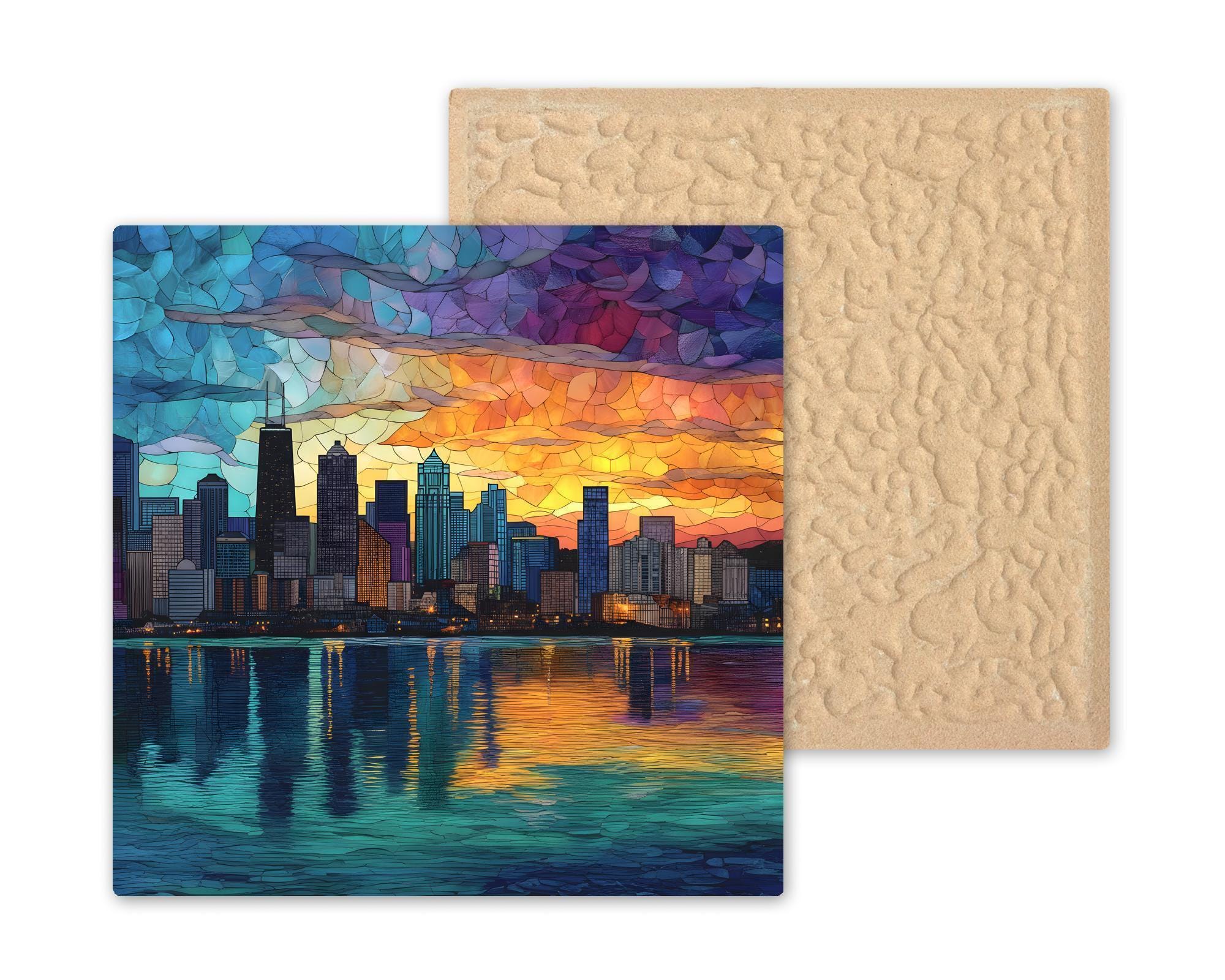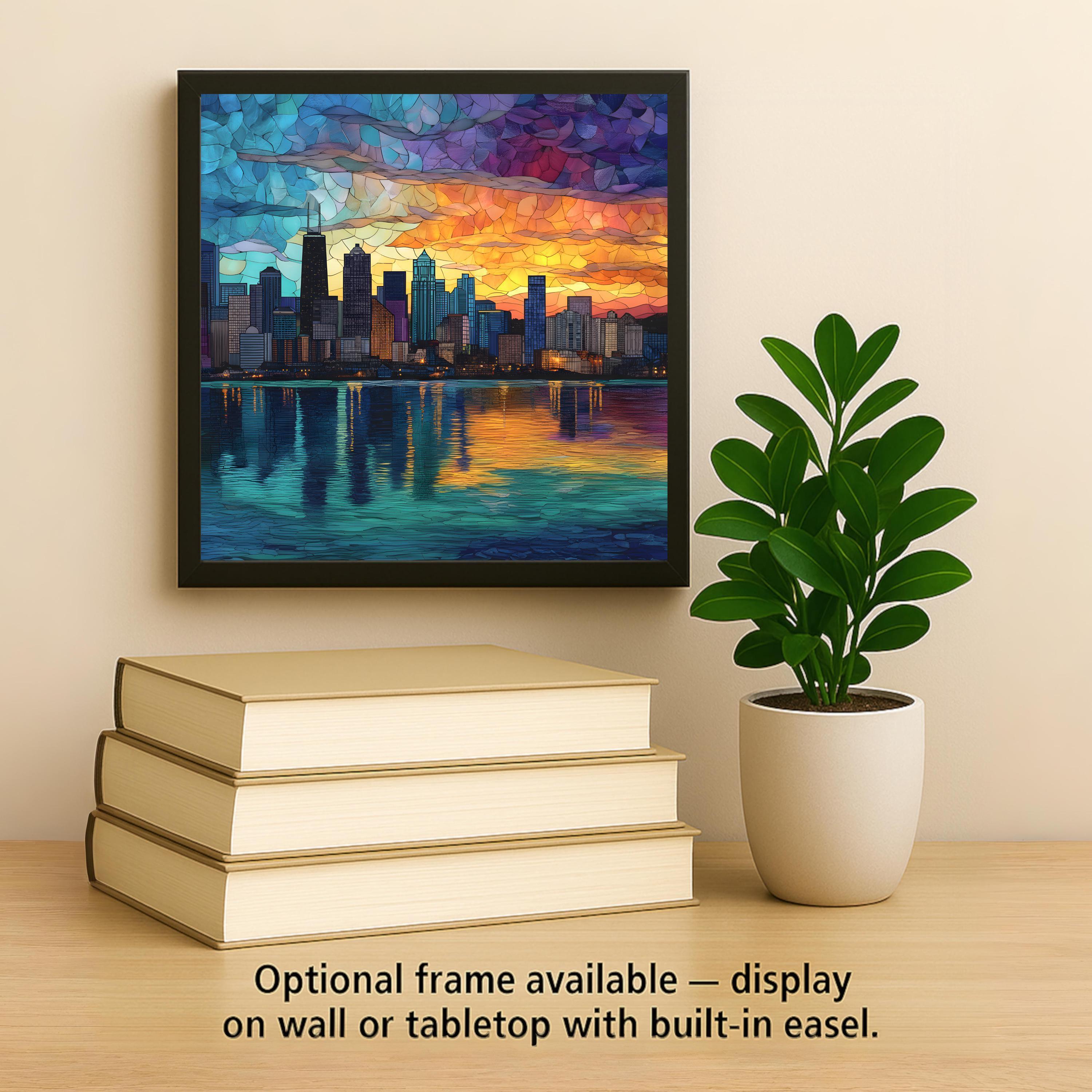 Chicago’s skyline is a symbol of innovation, resilience, and architectural beauty. This design transforms the city into a glowing mosaic of color and light, balancing strong geometric forms with fluid sunset reflections.