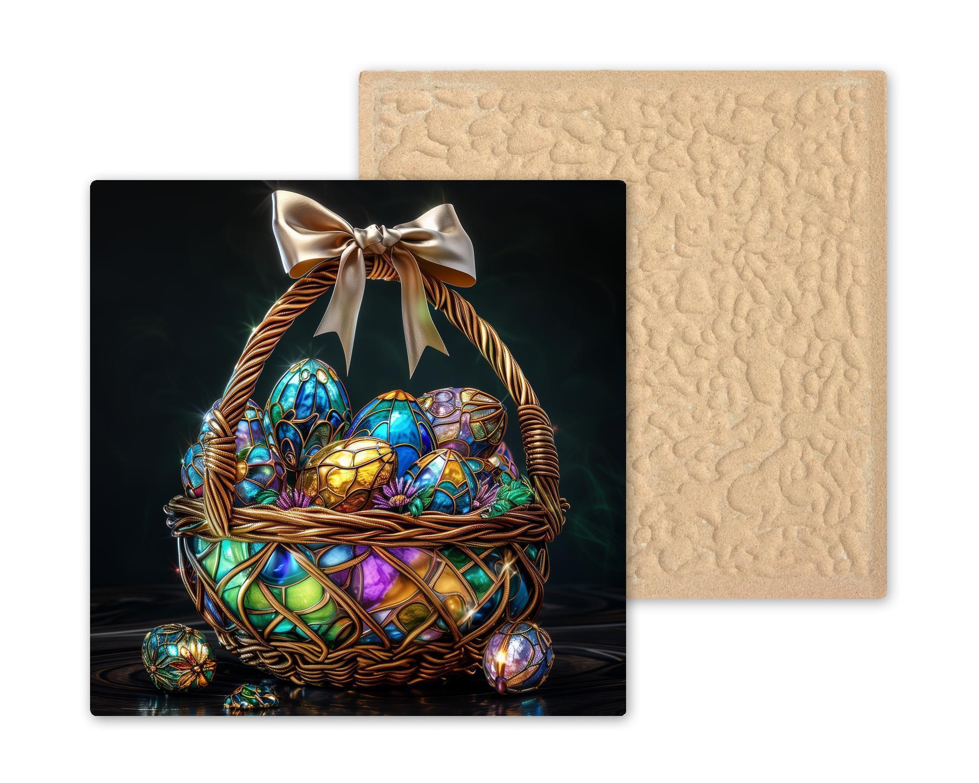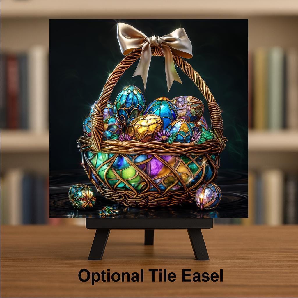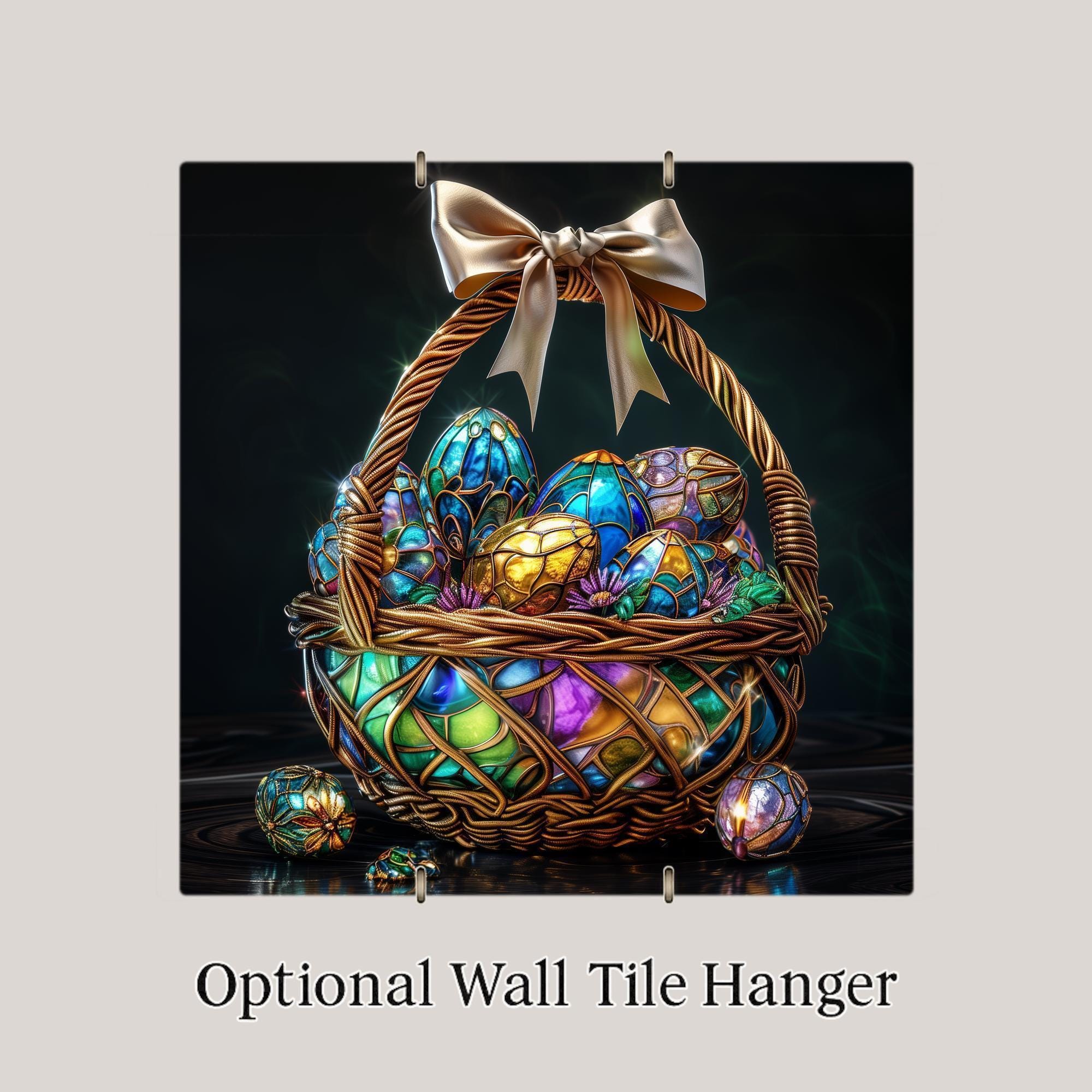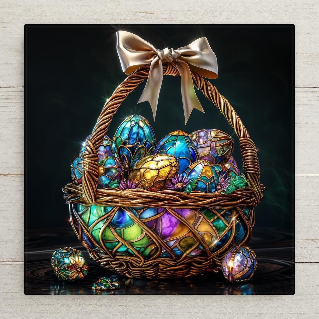 This design reimagines the traditional Easter basket through a refined stained glass lens. The dark backdrop allows the luminous eggs to shine, creating a dramatic focal point that works beautifully in modern, classic, or faith-inspired interiors.