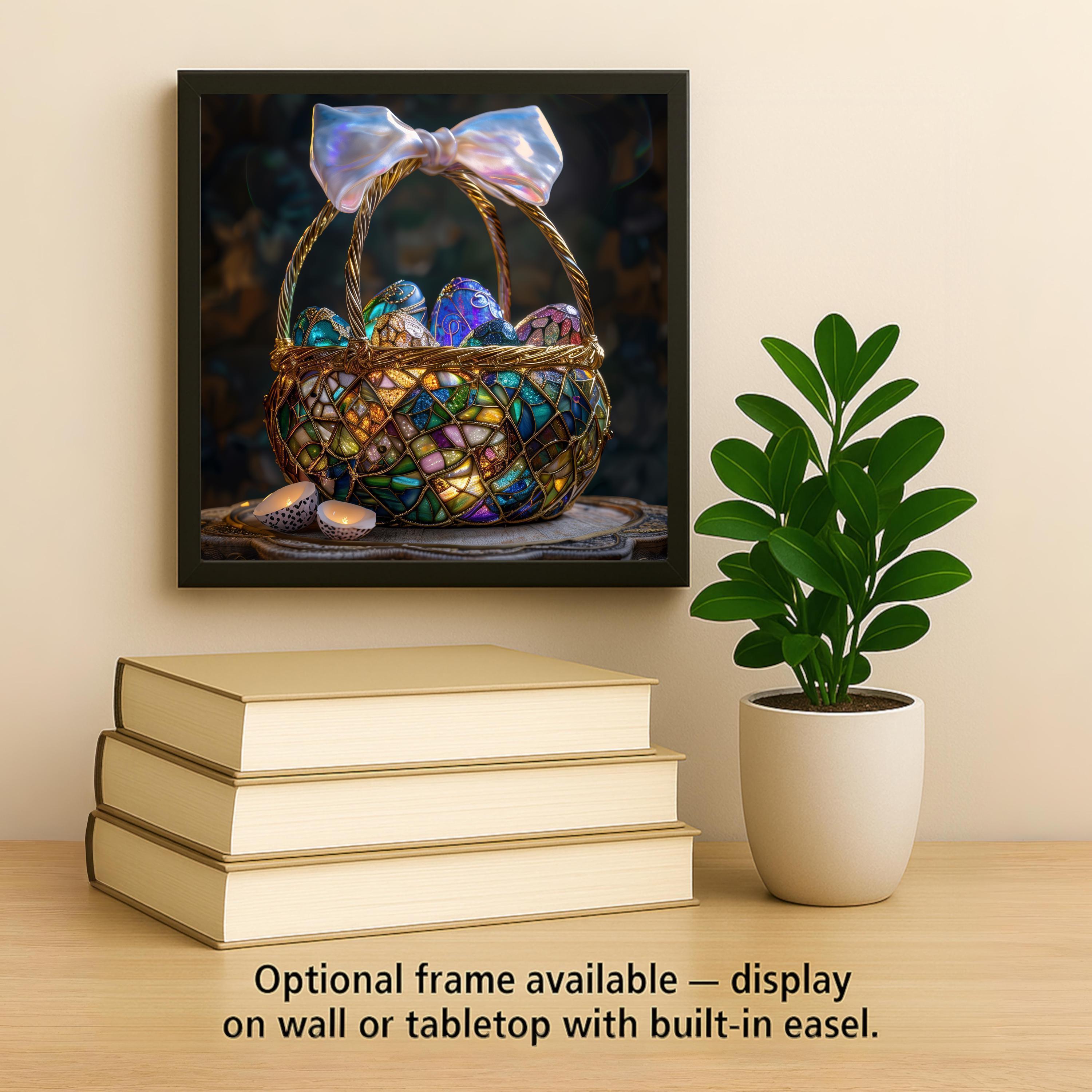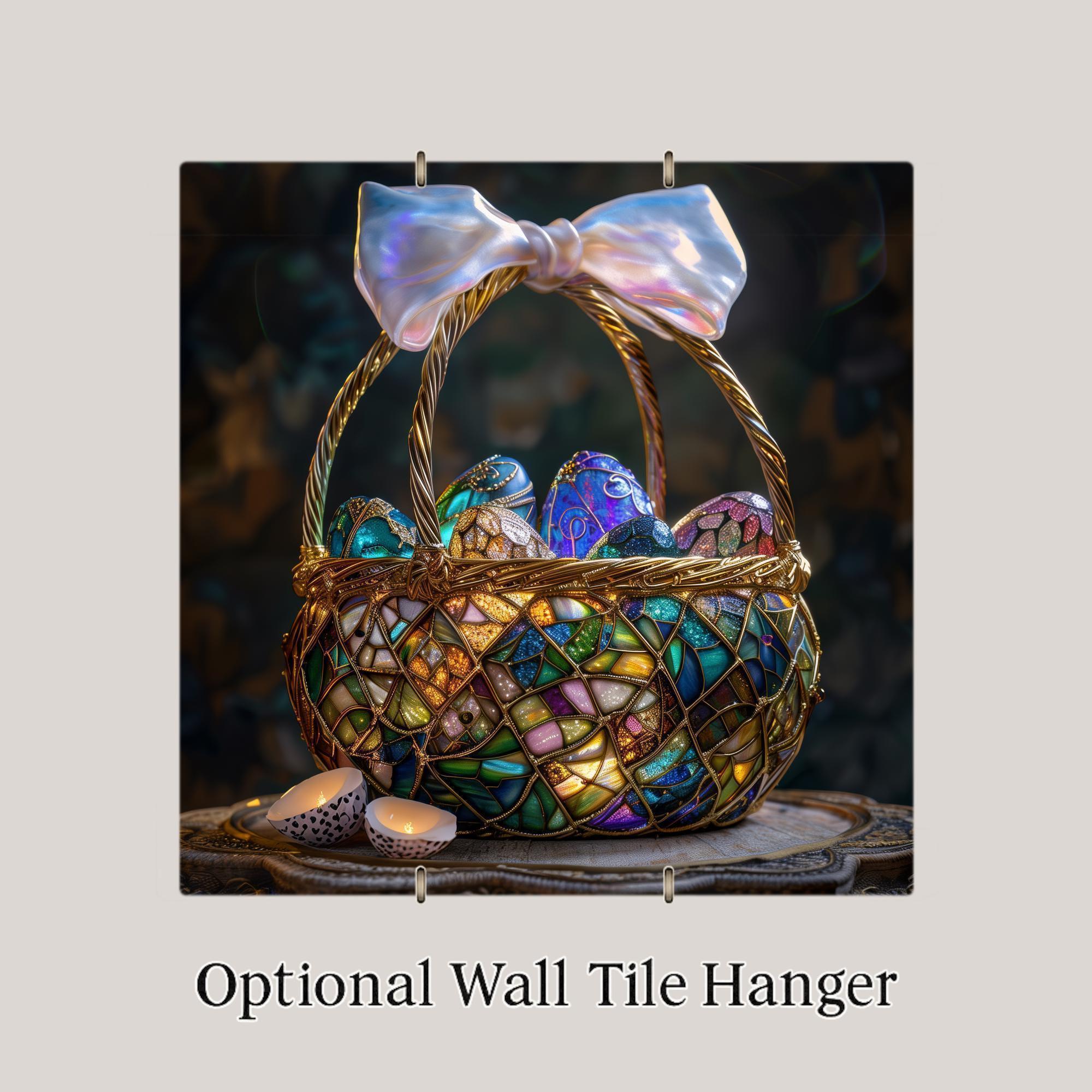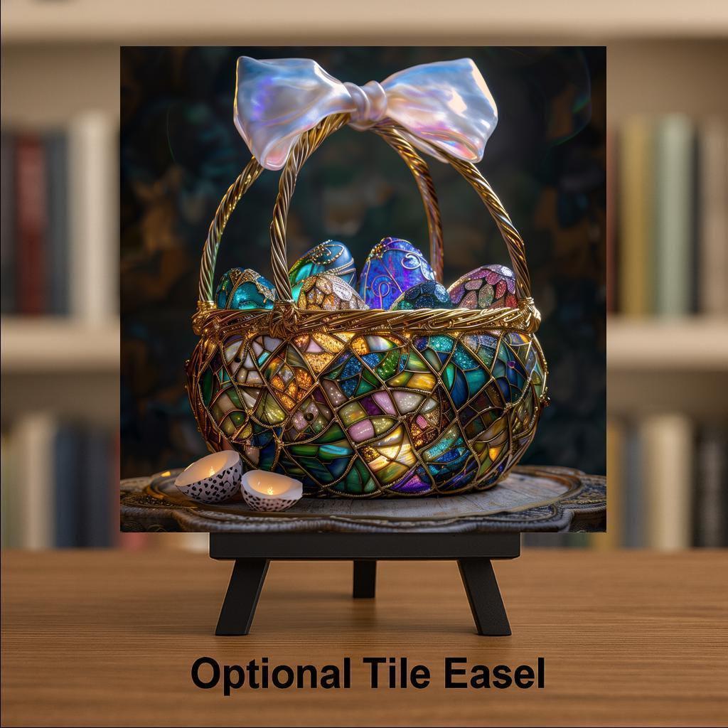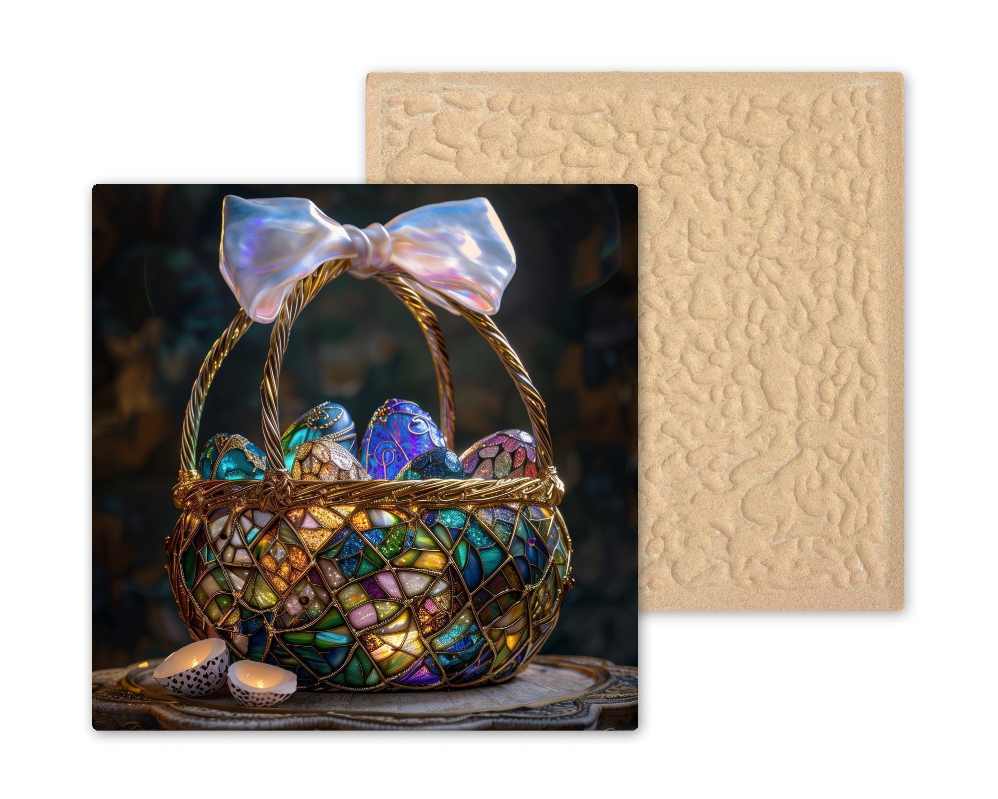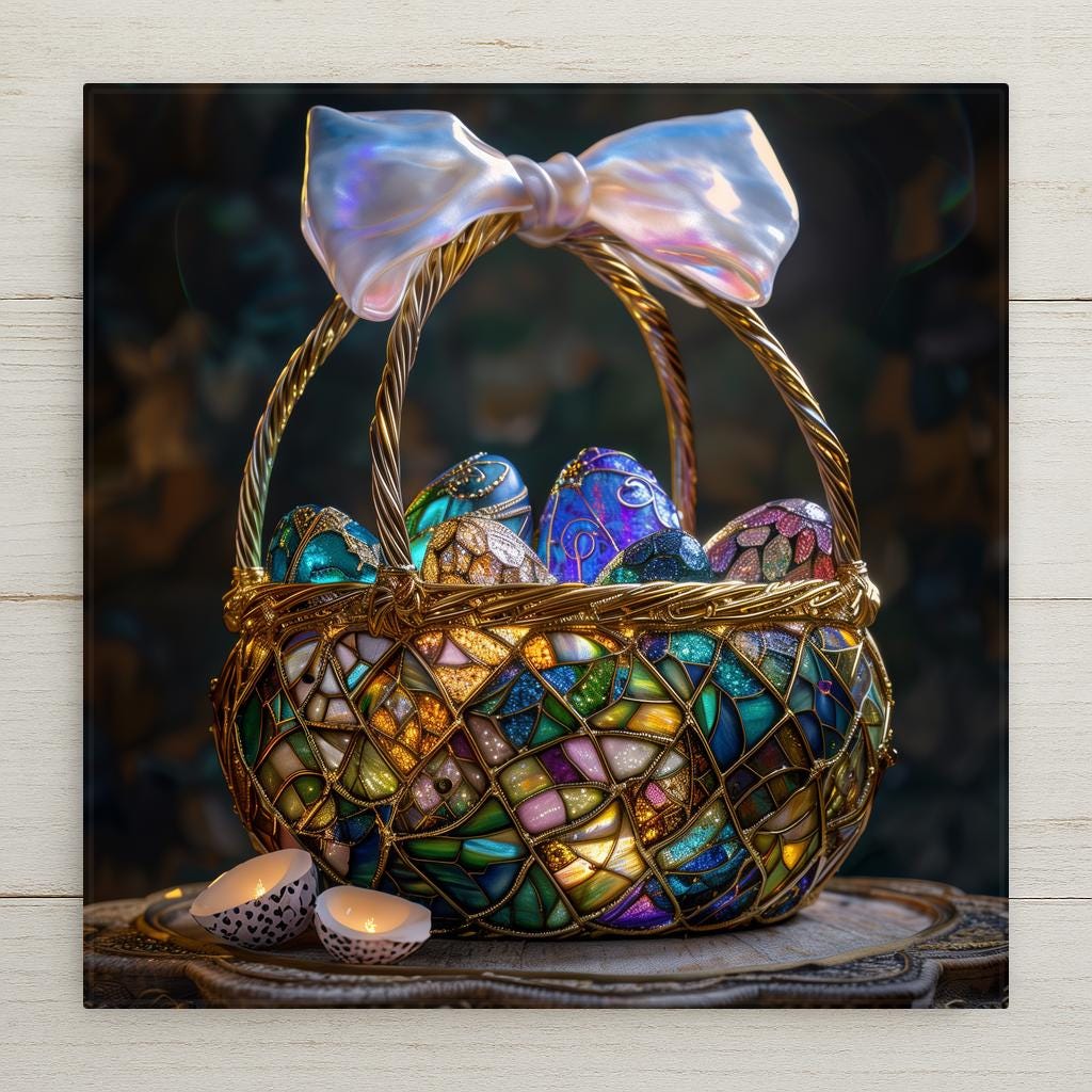 This design transforms a traditional Easter basket into a timeless statement of craftsmanship and light. The glowing candle accents and pearl-finish bow introduce warmth and softness, balancing the bold jewel tones of the stained glass pattern.