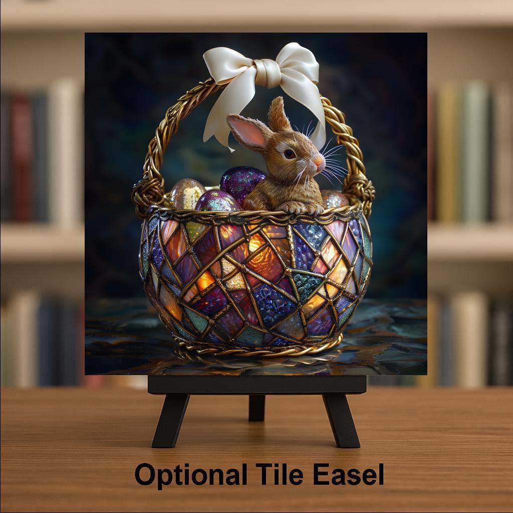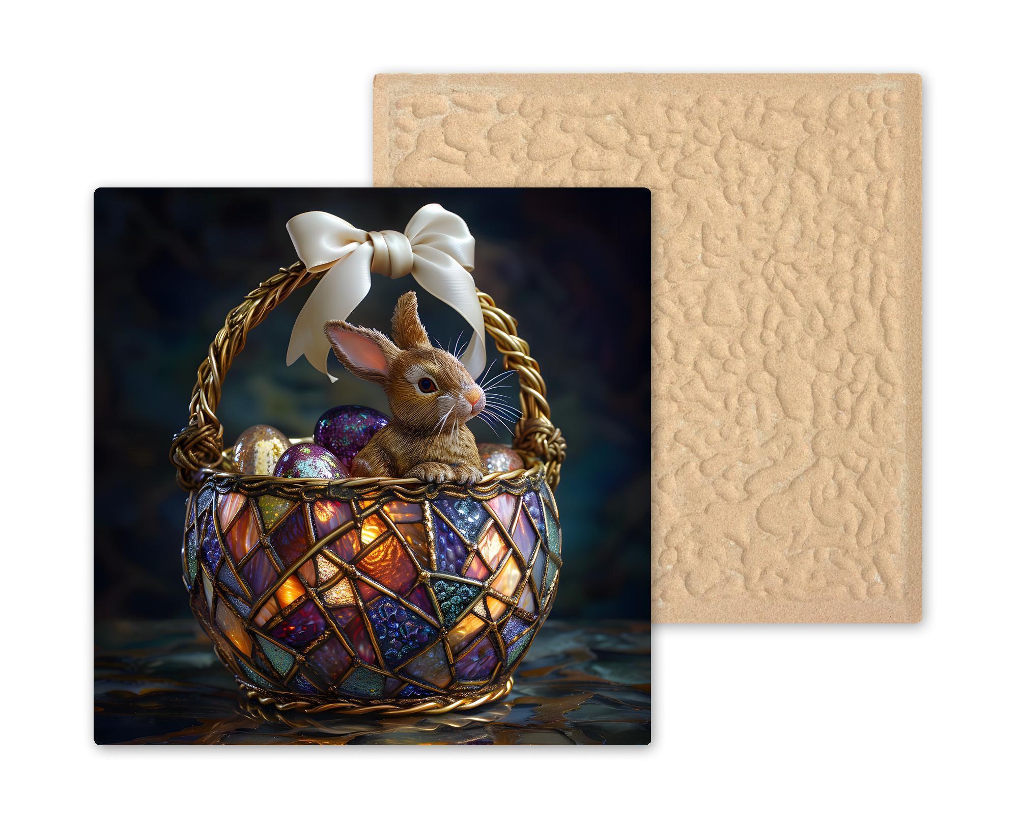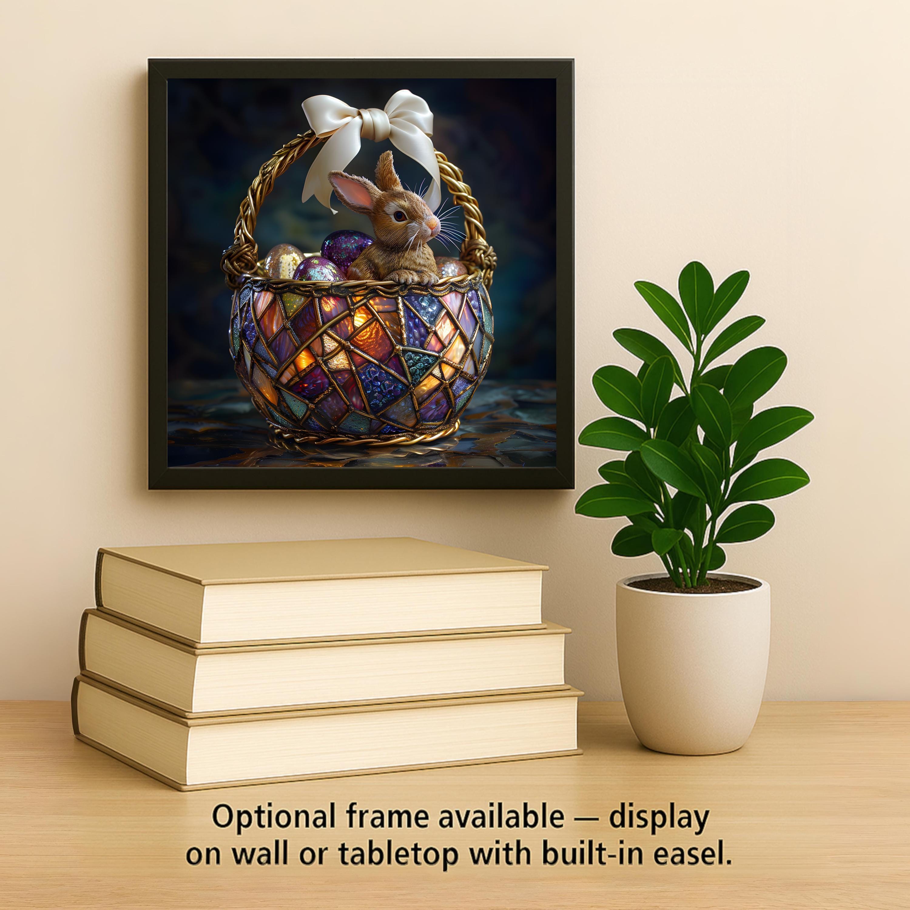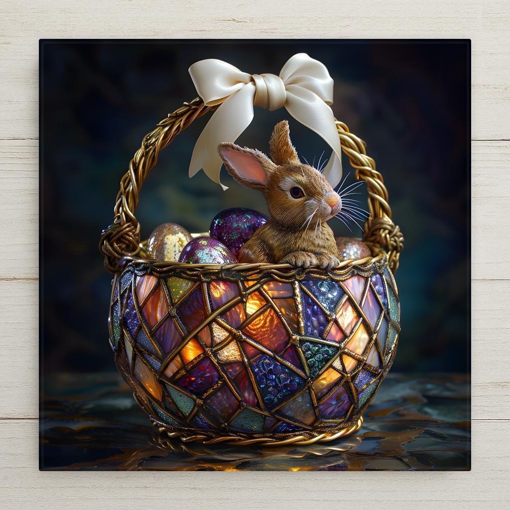 This design blends softness and sophistication. The gentle posture of the bunny contrasts beautifully with the radiant jewel glass basket, creating a composition that feels warm, intimate, and elevated.