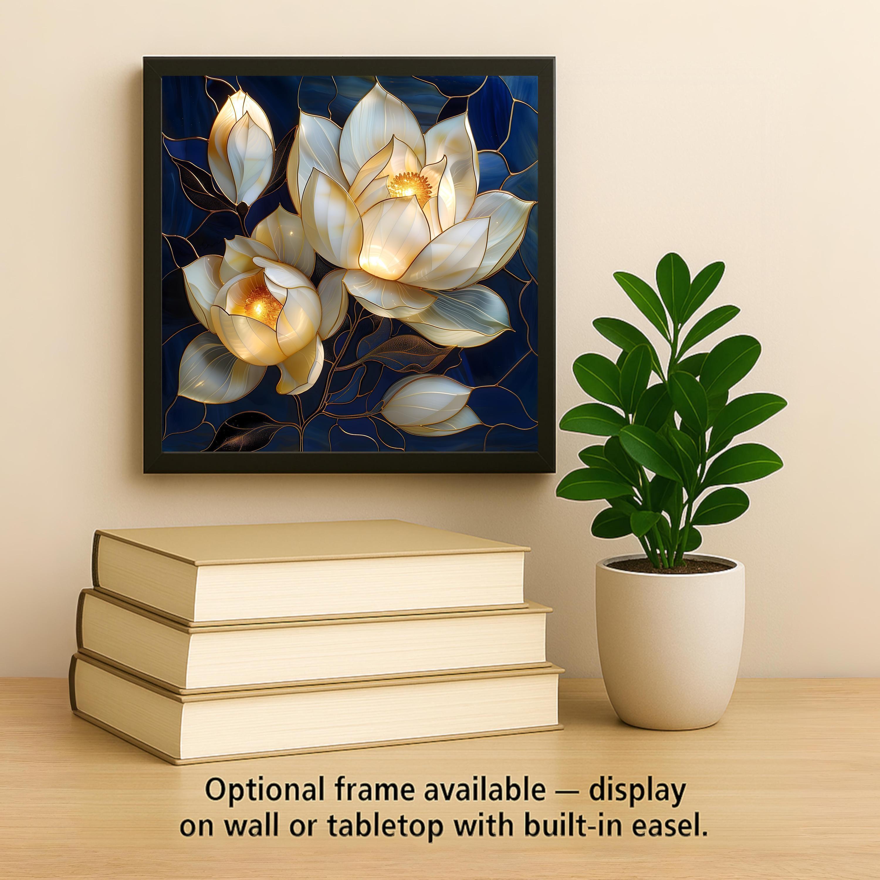 The jewel-tone blue background anchors neutral walls while the illuminated petals create subtle drama. It pairs beautifully with bird, garden, and nature-inspired pieces in your collection.