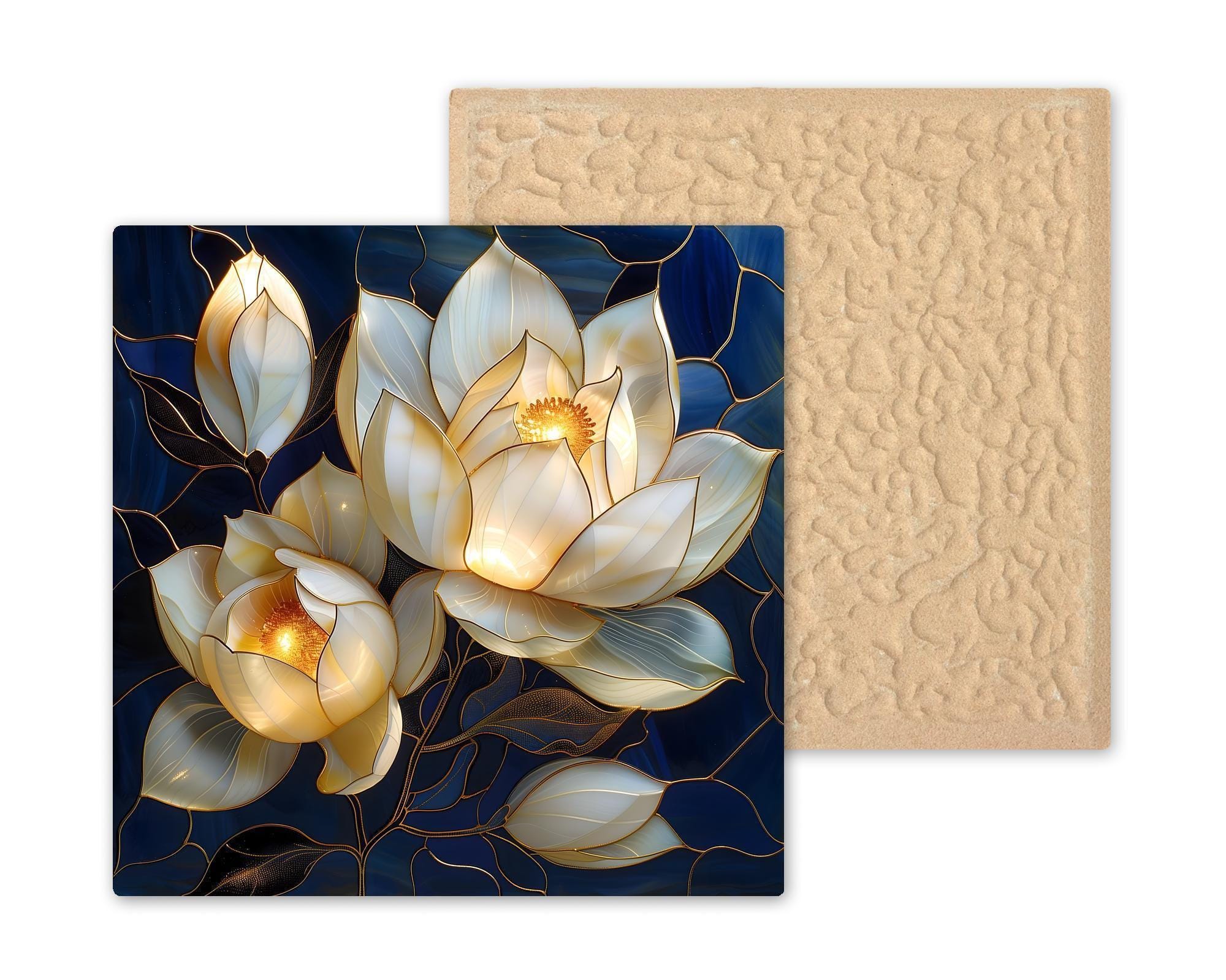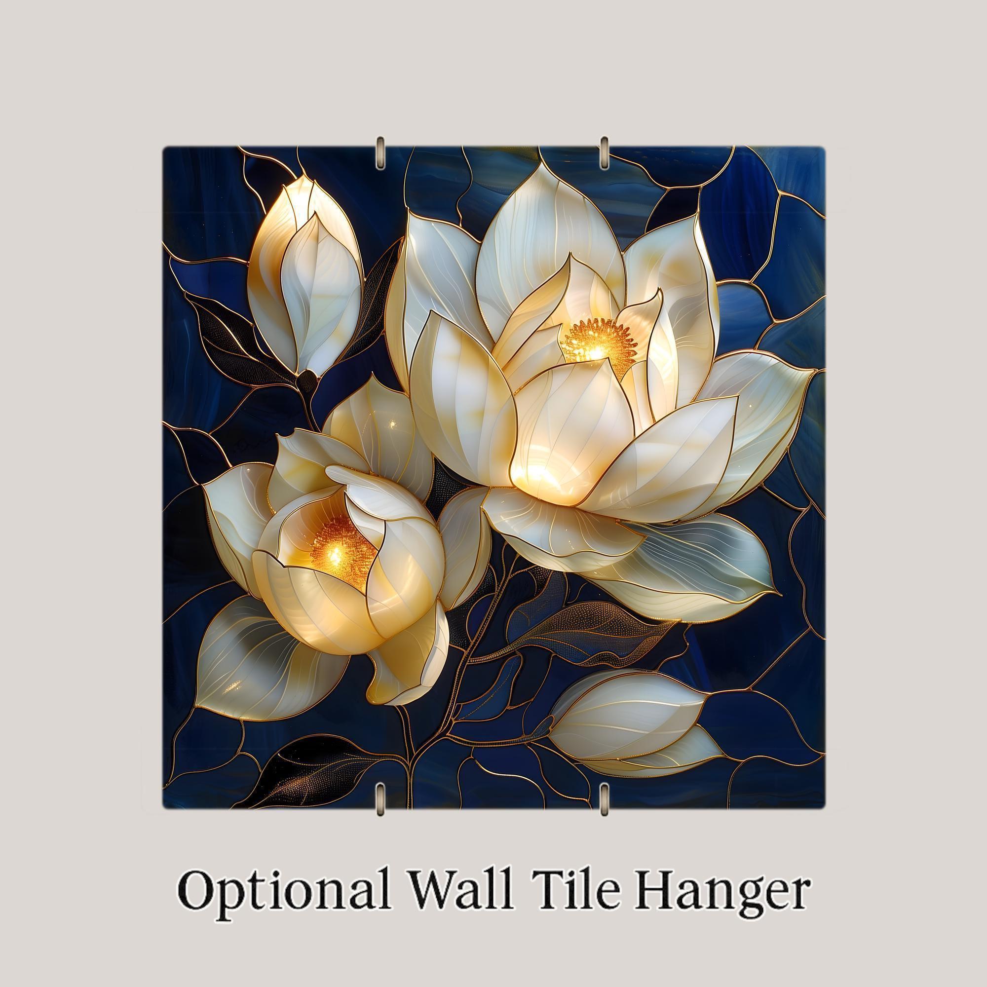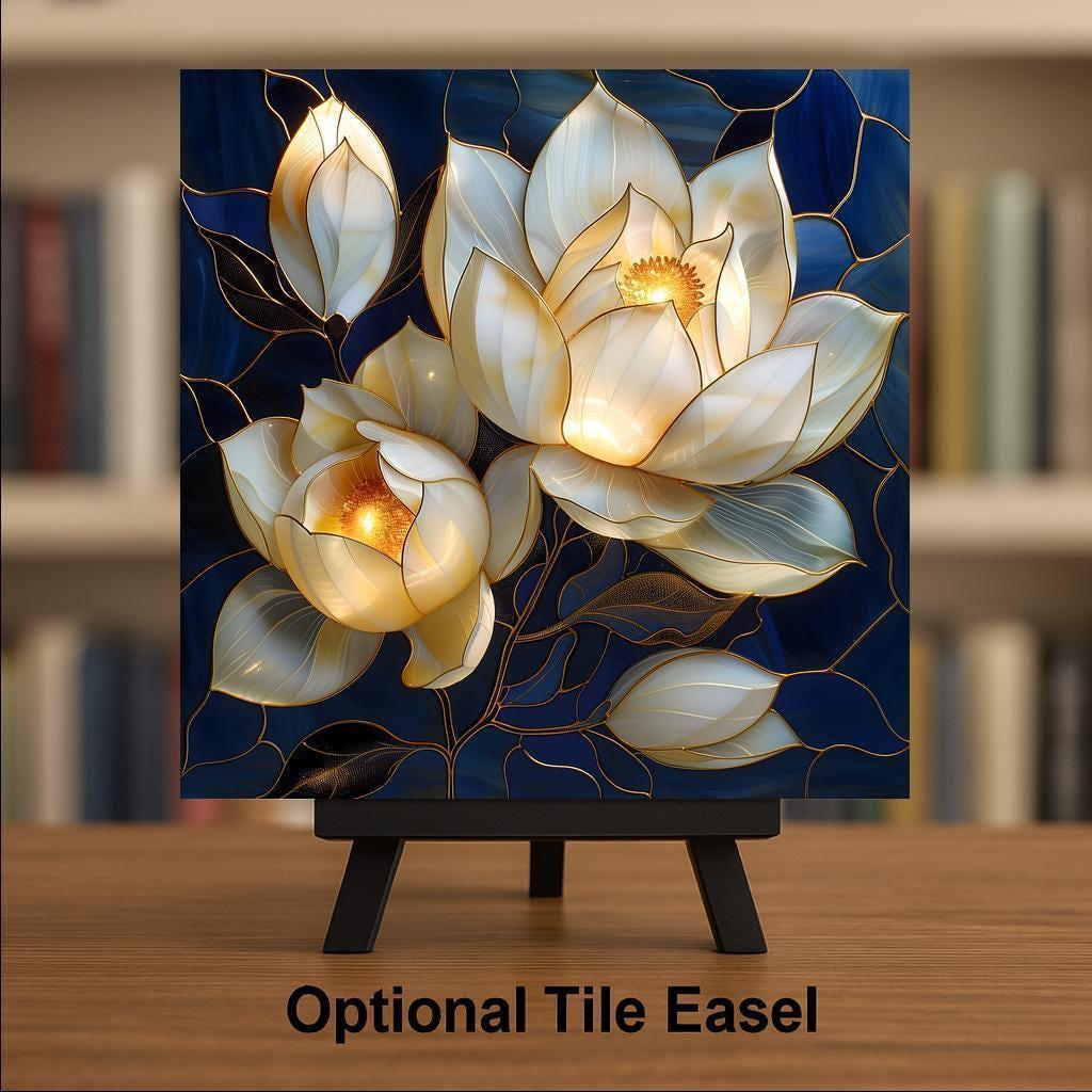 Magnolias symbolize strength, grace, and enduring beauty. This design transforms that symbolism into a glowing mosaic of layered ivory petals and deep sapphire tones.