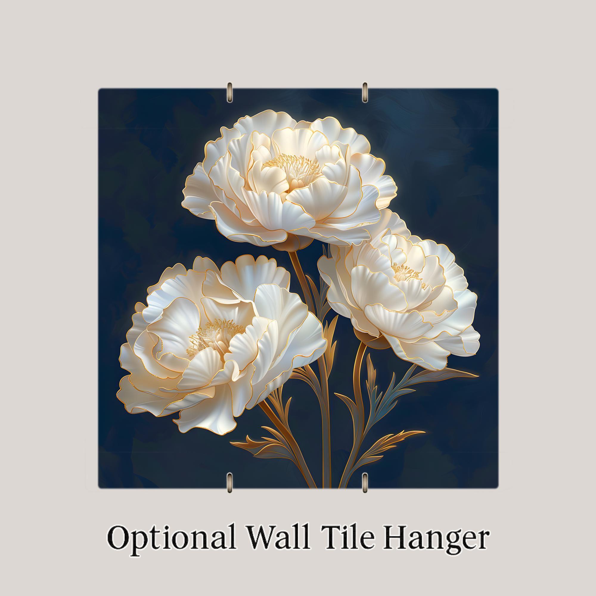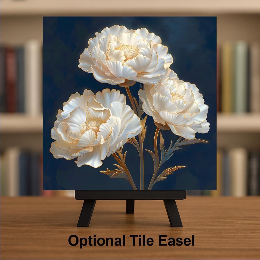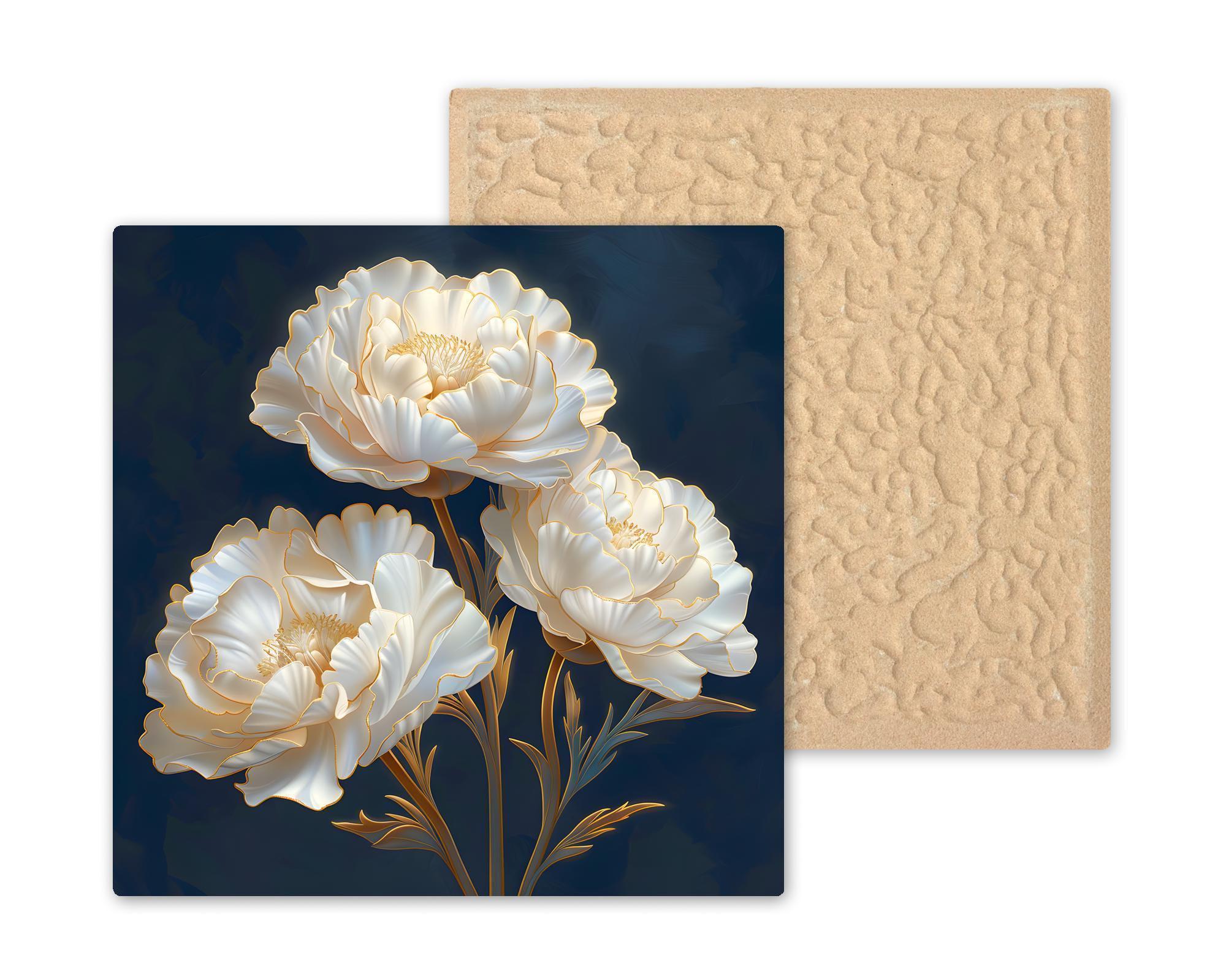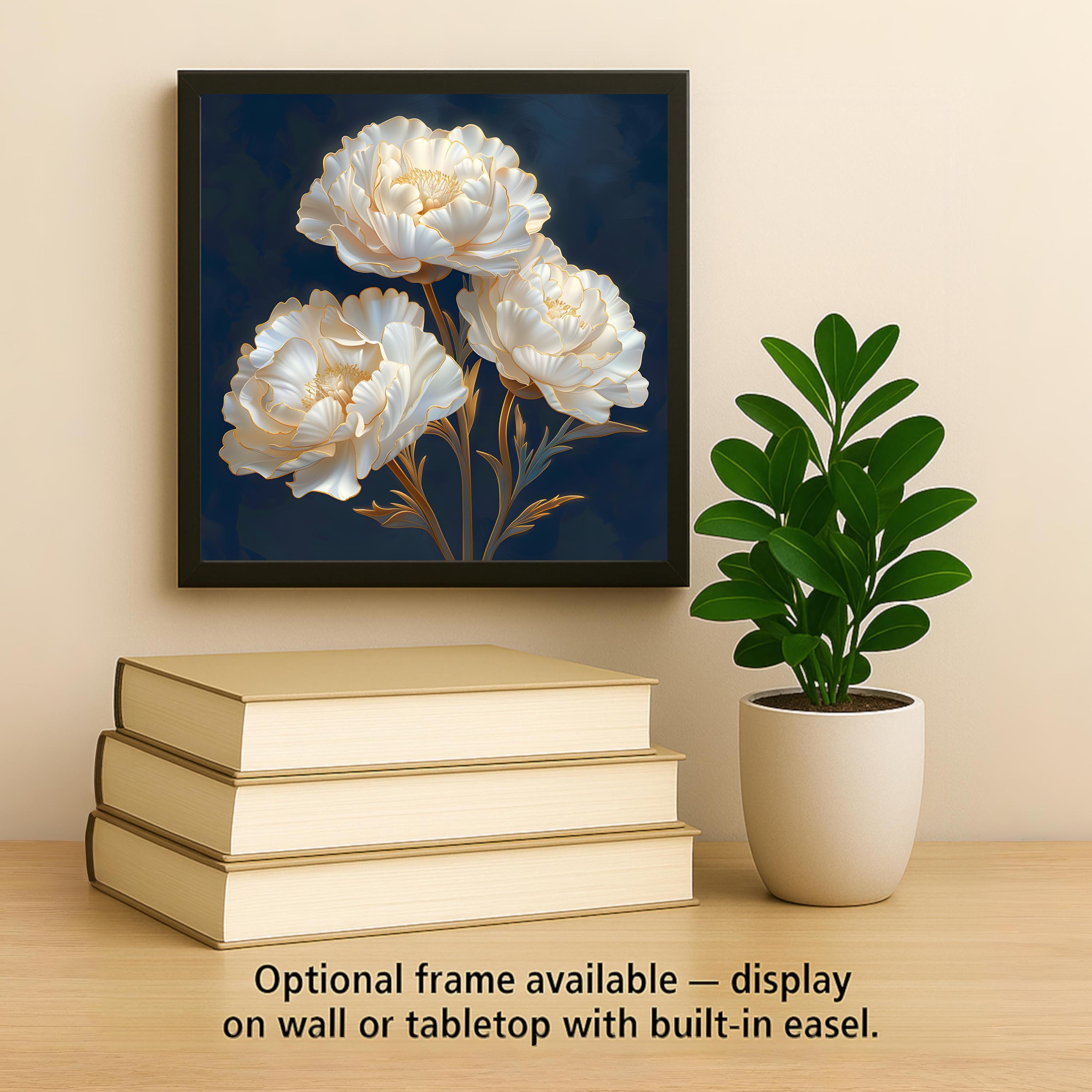 The deep blue background anchors neutral walls while the luminous petals create gentle contrast. Pair with crimson or blush carnation designs for a cohesive, heirloom-inspired floral set.