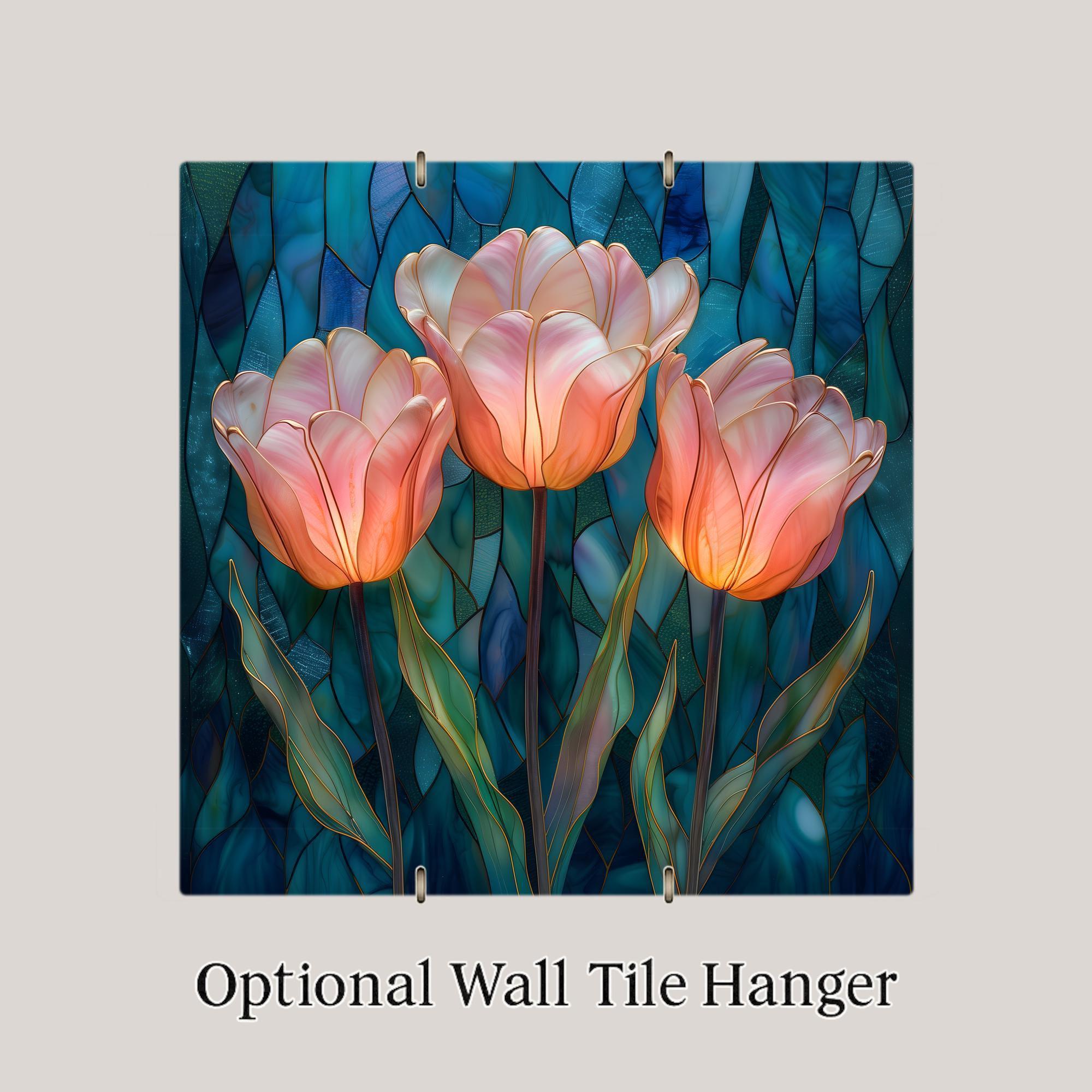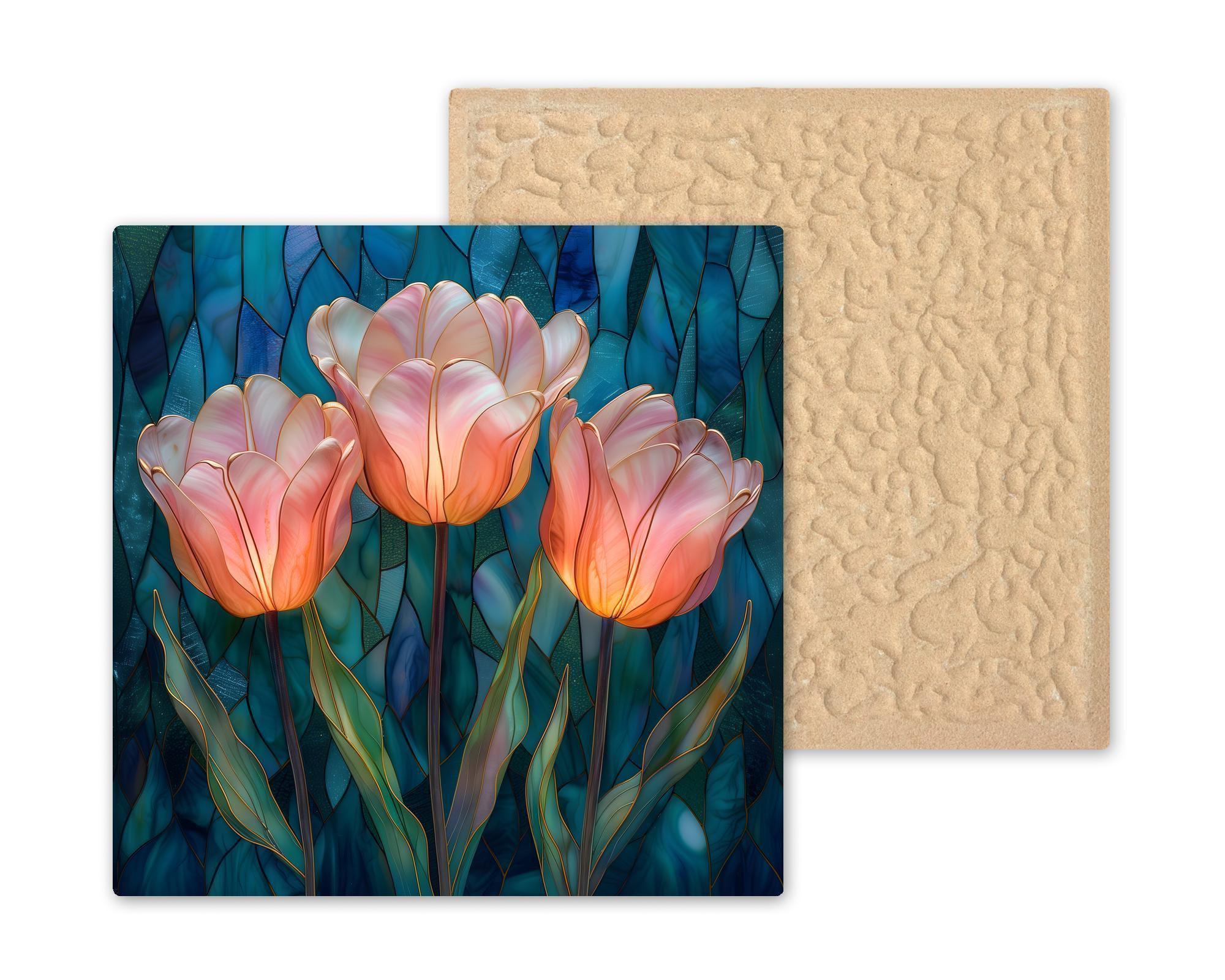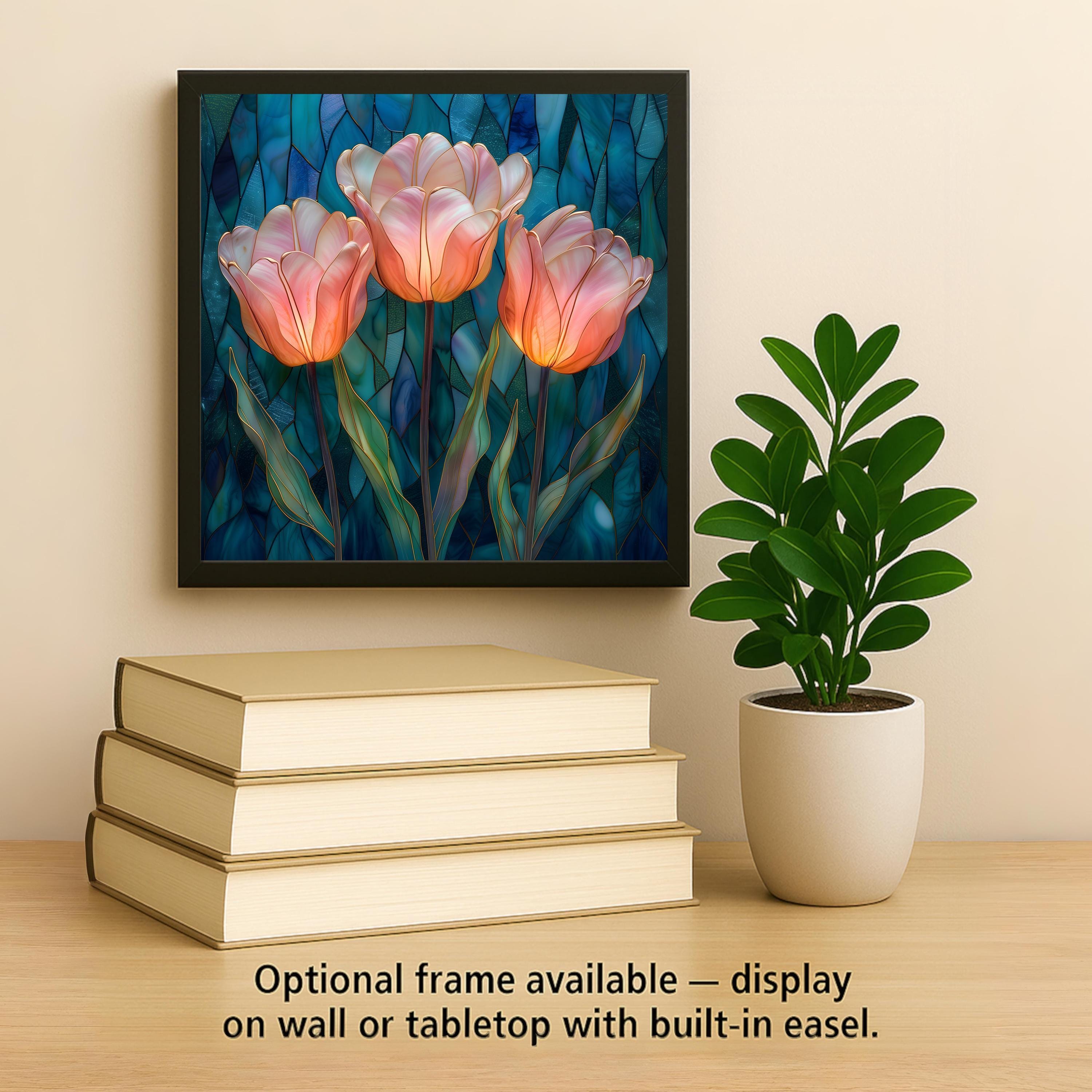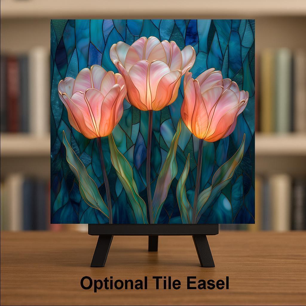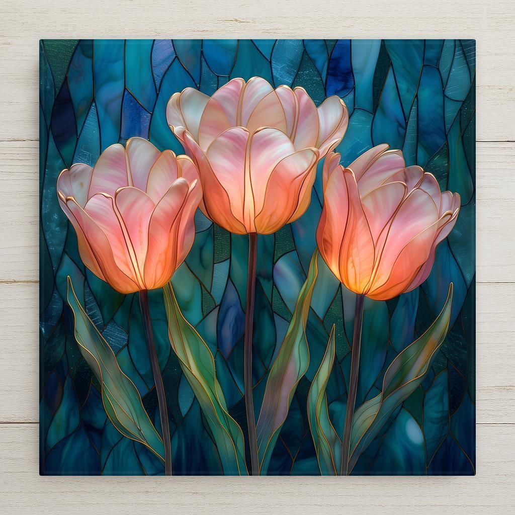Tulips symbolize renewal, grace, and fresh beginnings. This design captures that feeling in a luminous stained-glass-inspired interpretation, balancing structured gold outlines with soft, flowing petals.