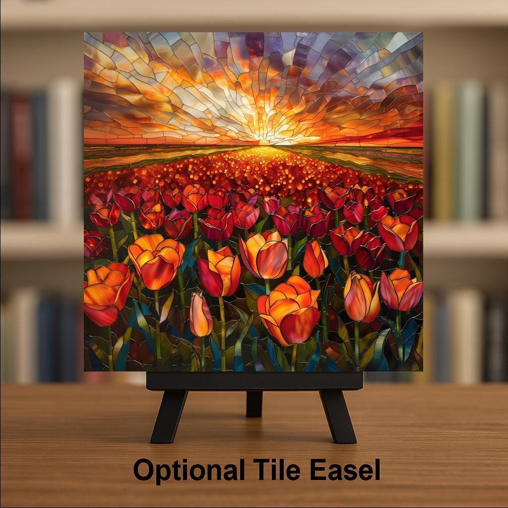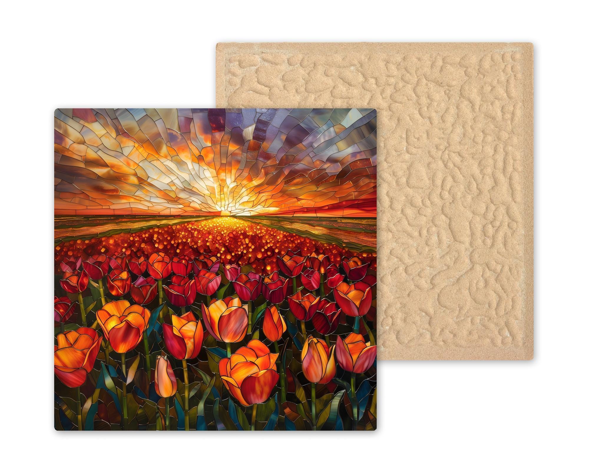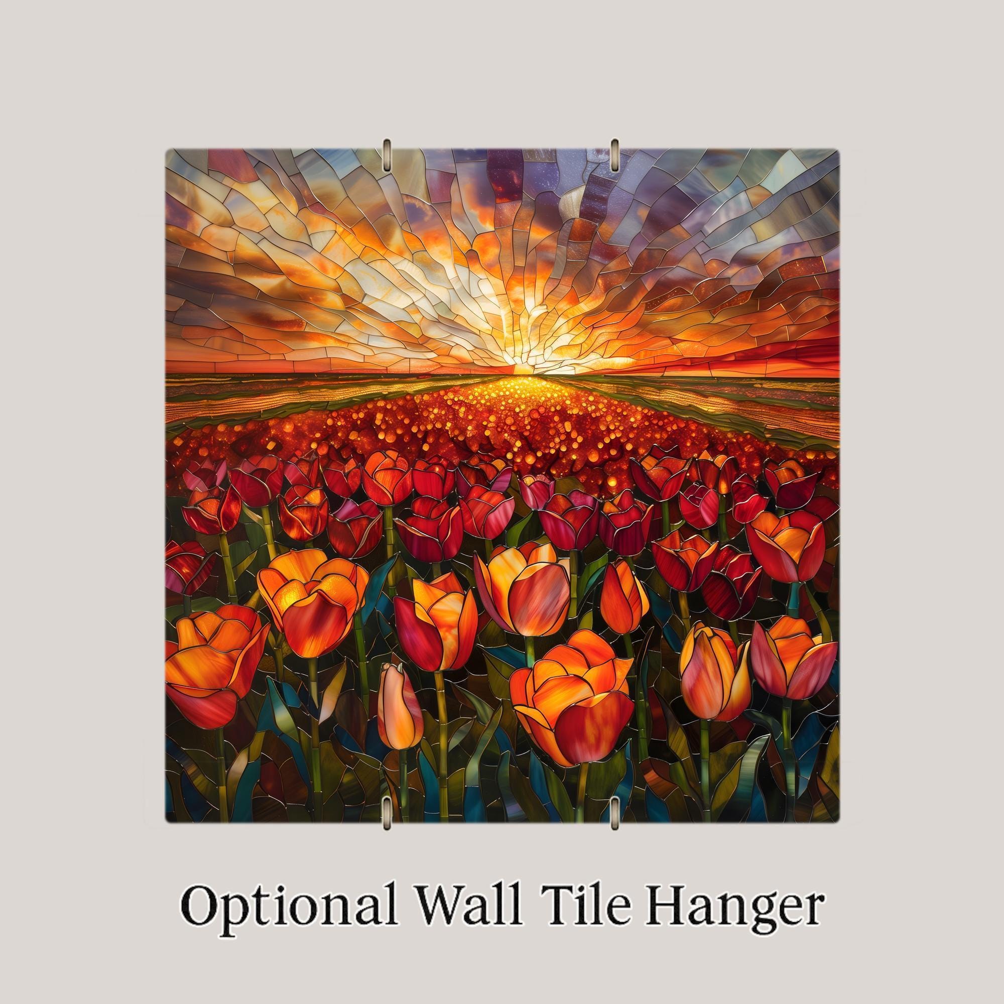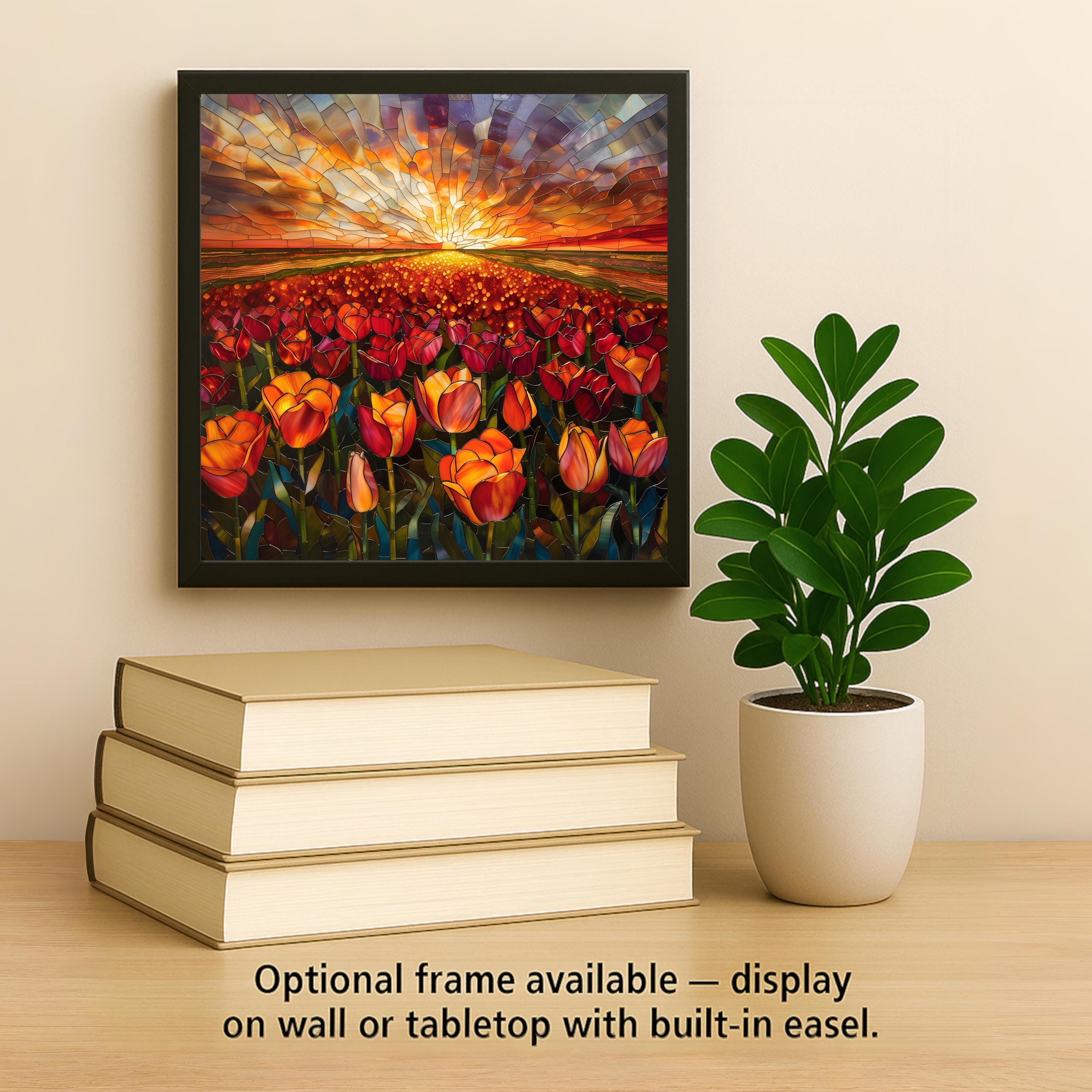 This design captures the feeling of standing in a glowing tulip field at golden hour. The sweeping sky segmentation draws the eye toward the radiant horizon, while the layered tulips in the foreground create depth and richness.