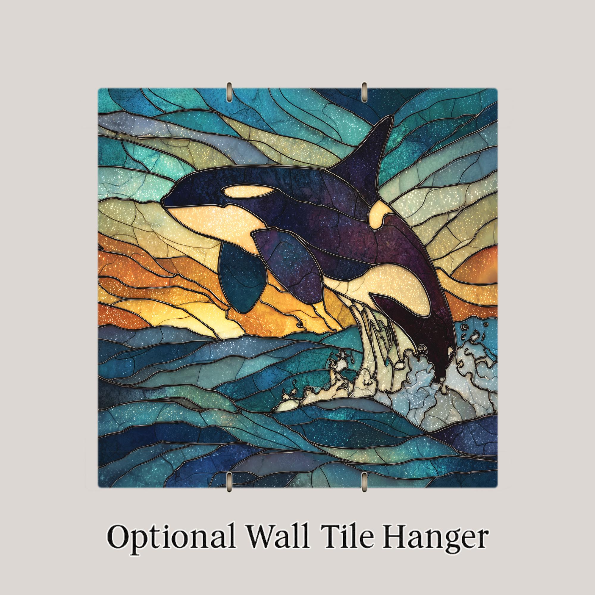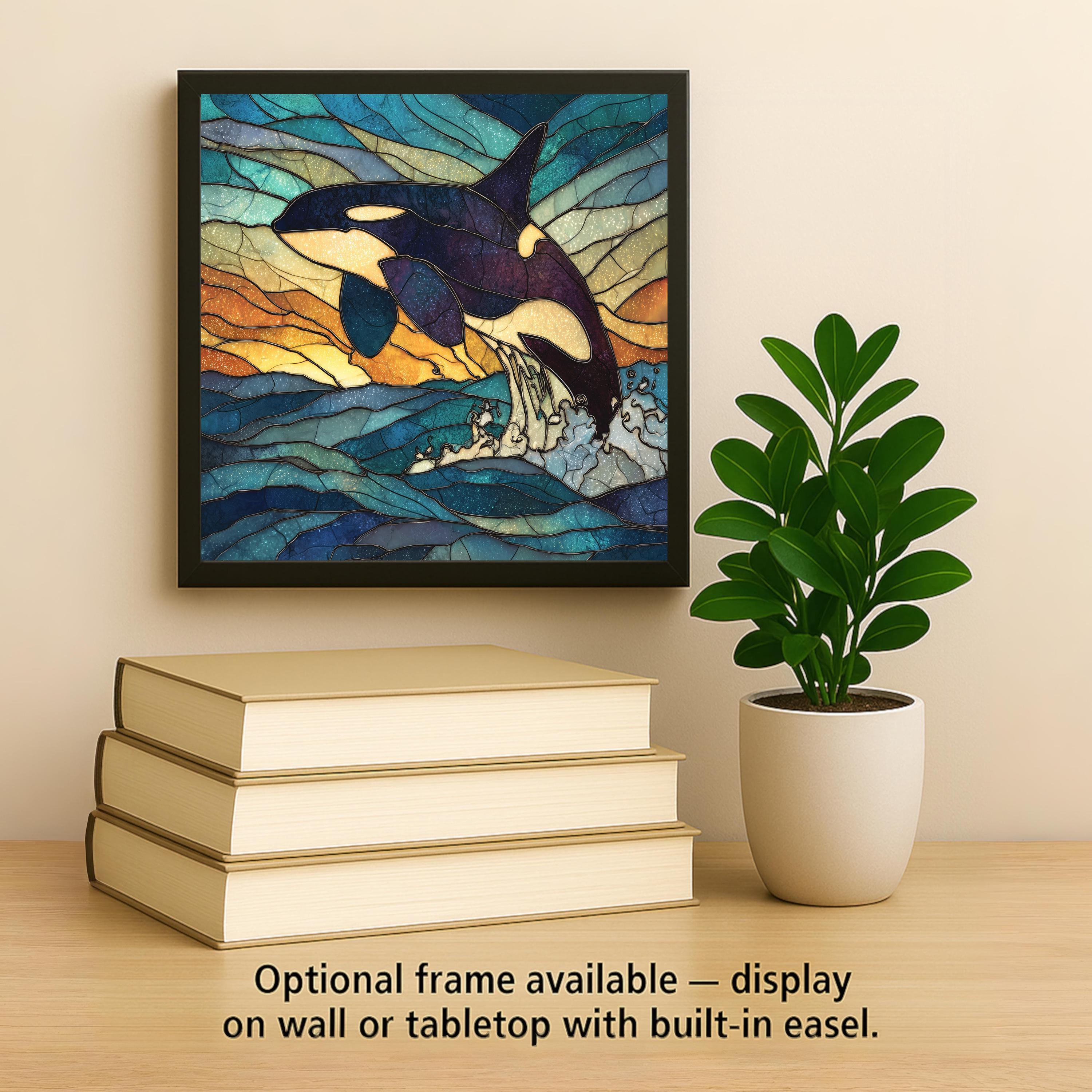 The upward arc of the whale creates natural energy, while the layered waves anchor the composition. The glowing sunset backdrop makes this piece feel alive, dynamic, and expansive.