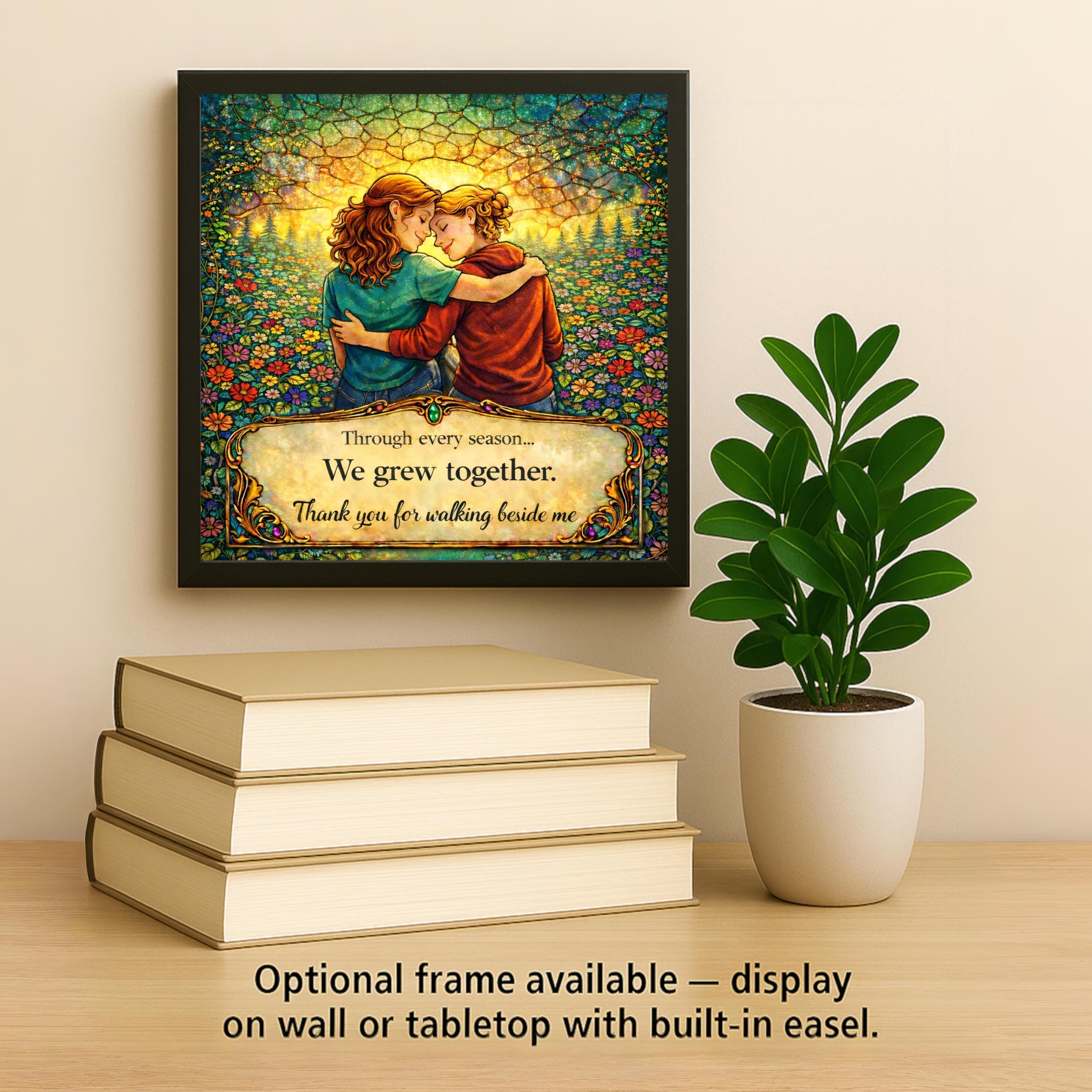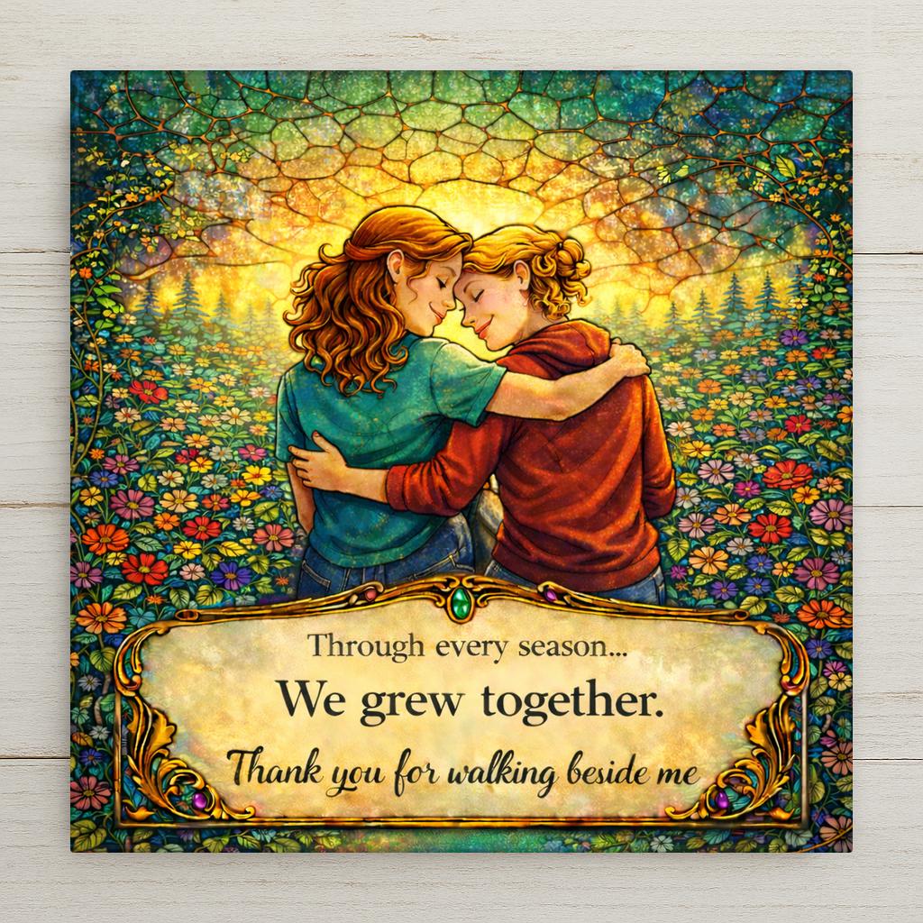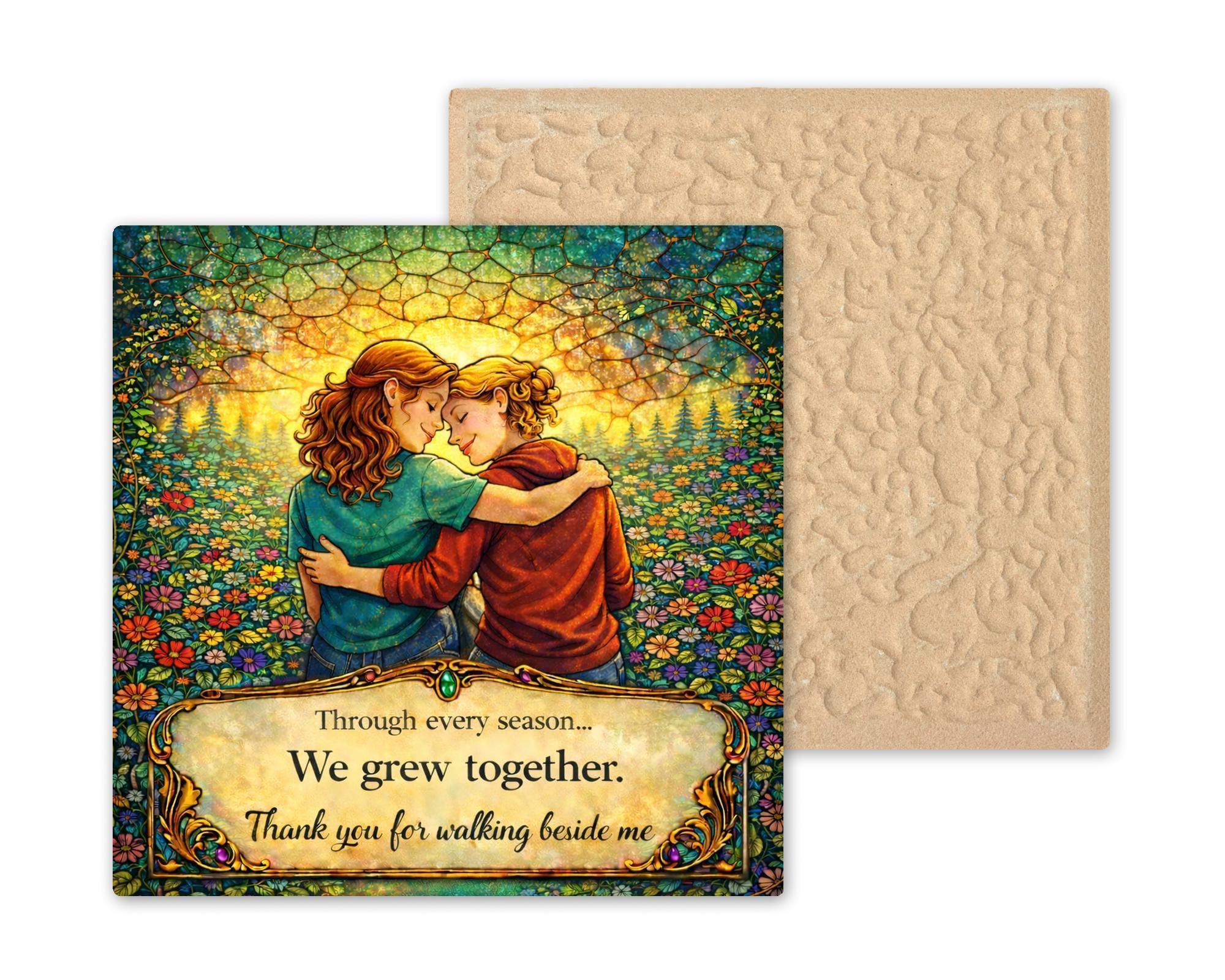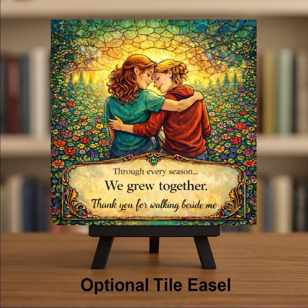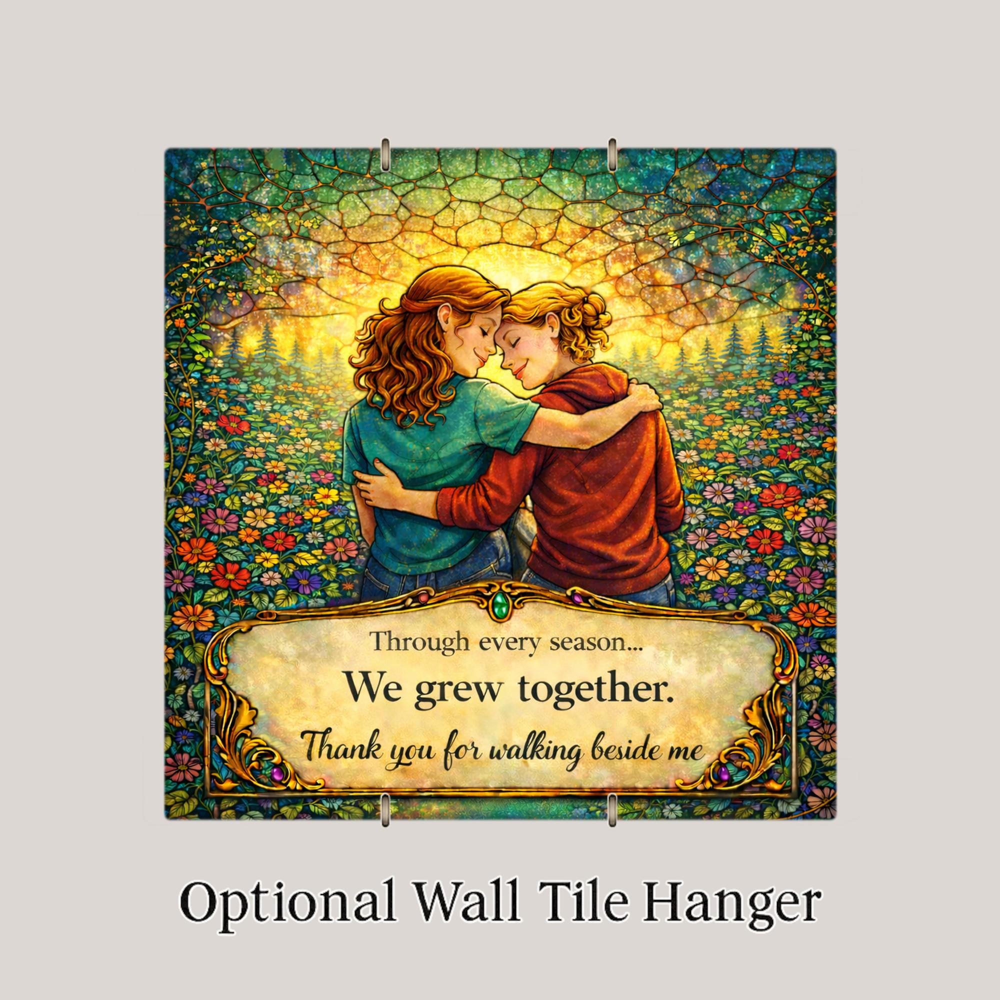 This friendship quote wall art ceramic tile blends emotional storytelling with a rich stained glass aesthetic. Jewel-tone florals, antique gold leading details, and a luminous mosaic sky create depth and warmth, making it a standout piece of inspirational home decor.