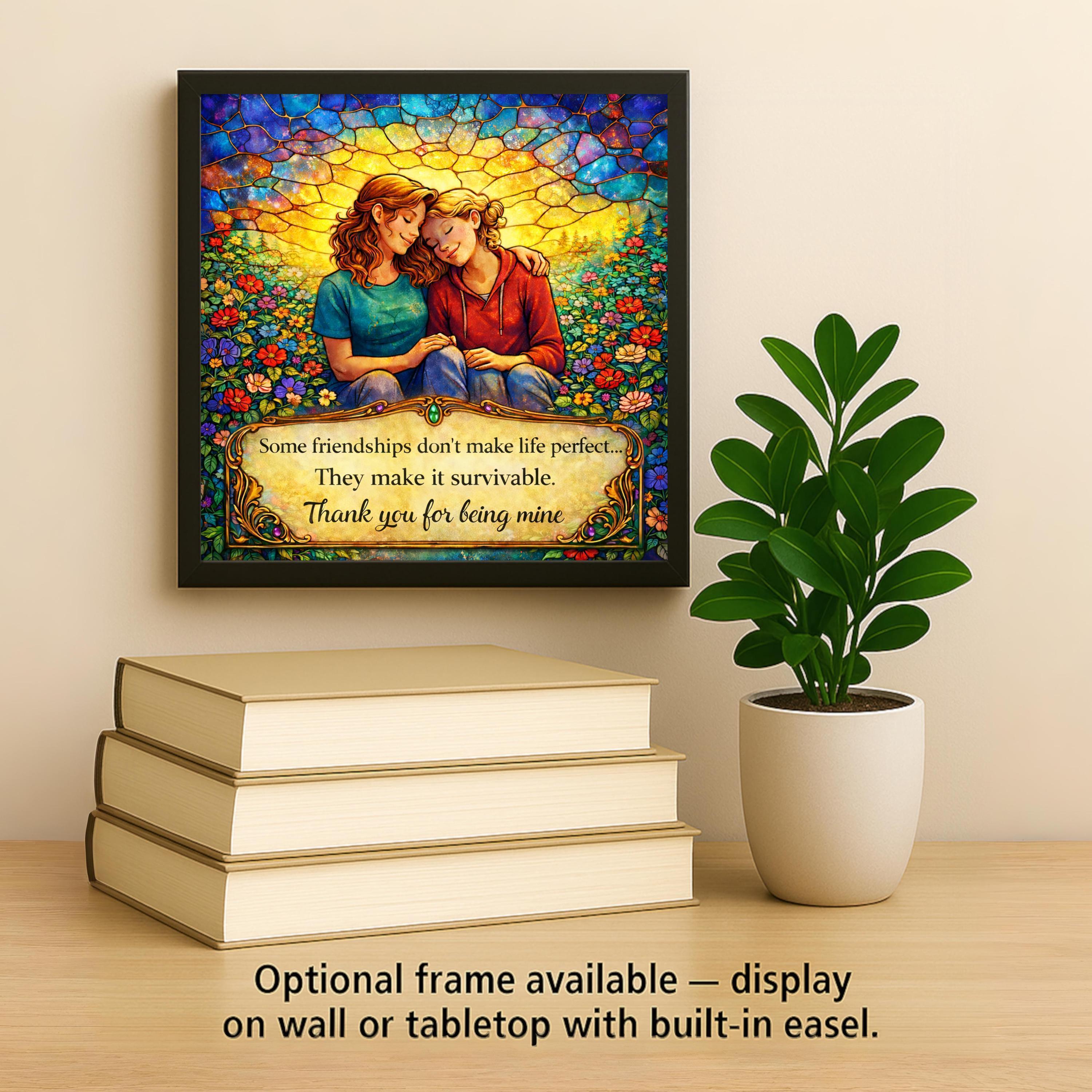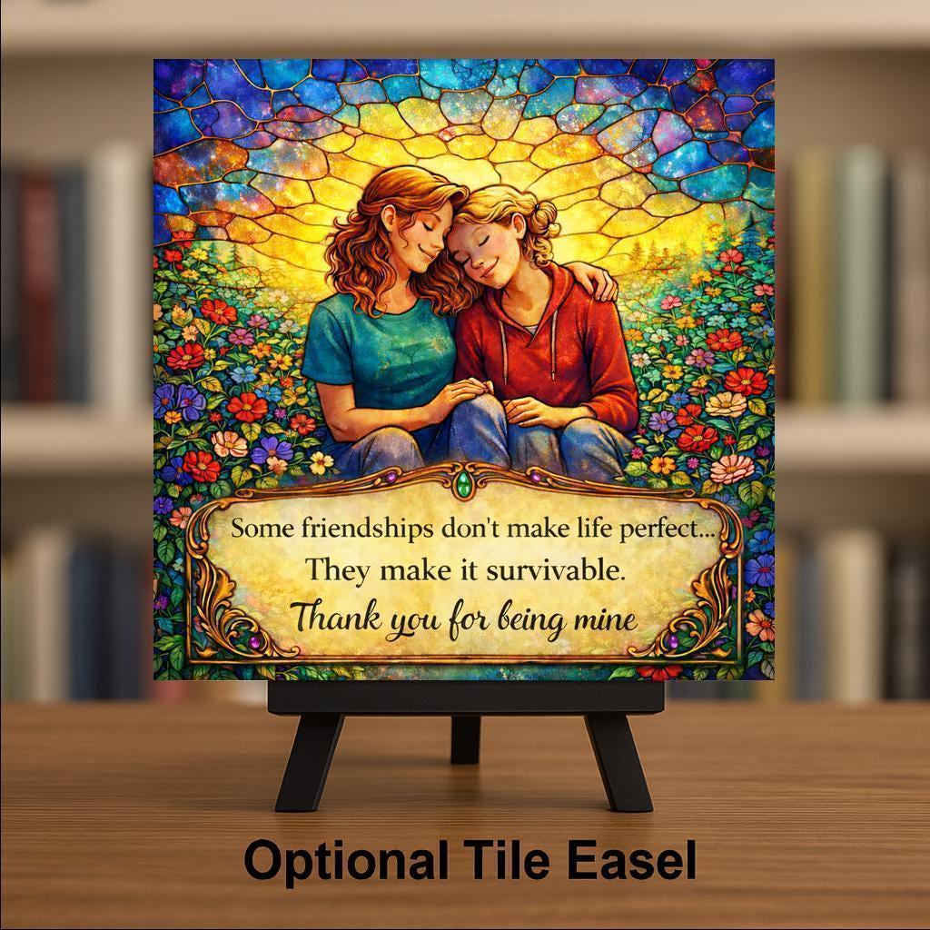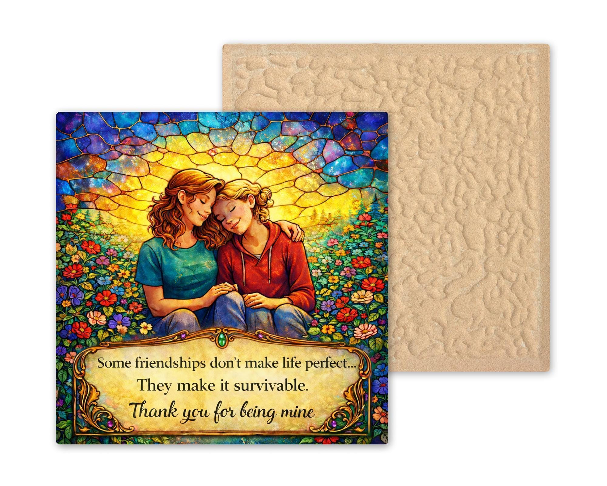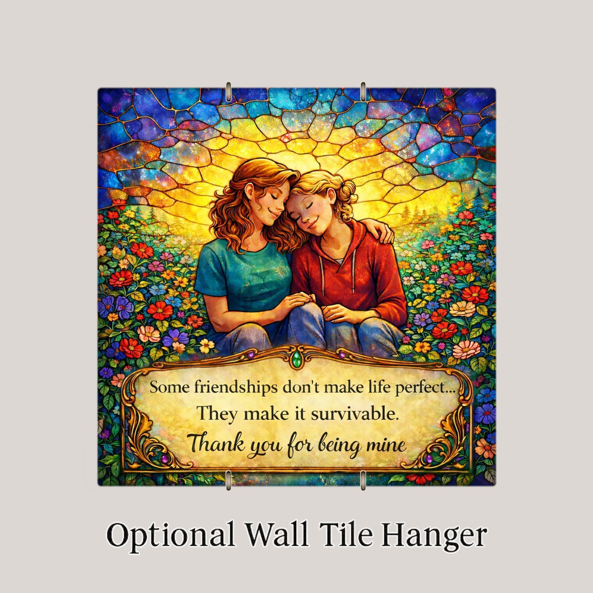 This friendship quote wall art ceramic tile blends inspirational wording with vibrant stained glass styling and rich jewel-tone color depth. The glowing mosaic sky, floral meadow details, and controlled antique gold plaque design create a premium heirloom aesthetic while remaining gift-ready and versatile for home decor.