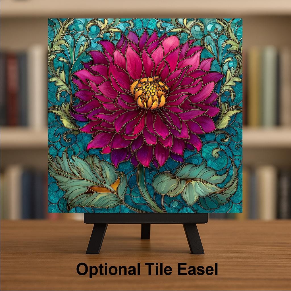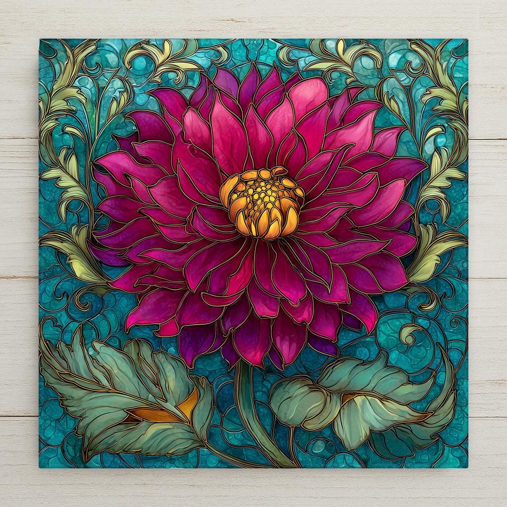 The vivid magenta bloom feels expressive and confident, while the ornate teal background evokes classic stained glass craftsmanship. Whether styled in a living room, bedroom, office, or gallery wall, this piece brings warmth and refined botanical beauty to the space.