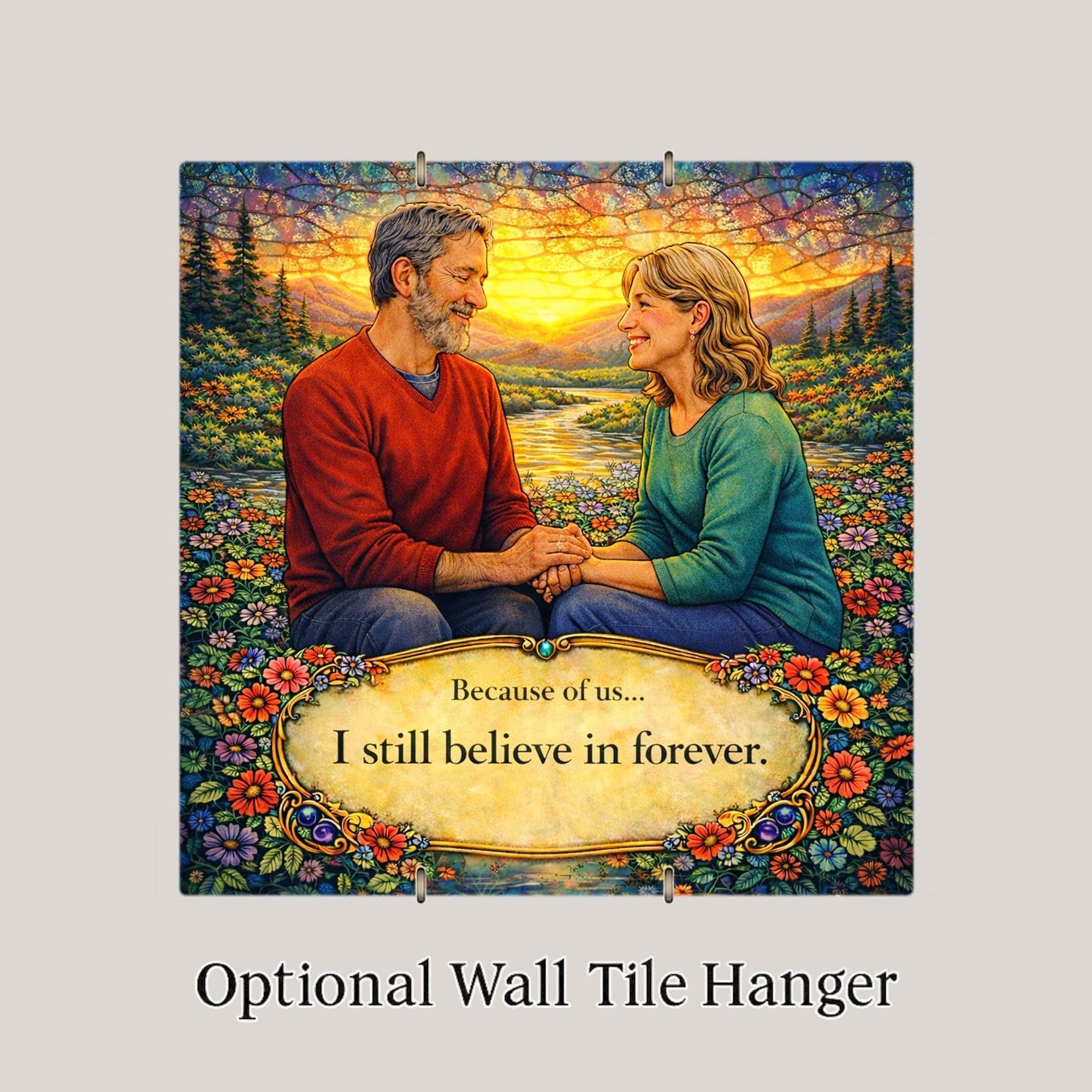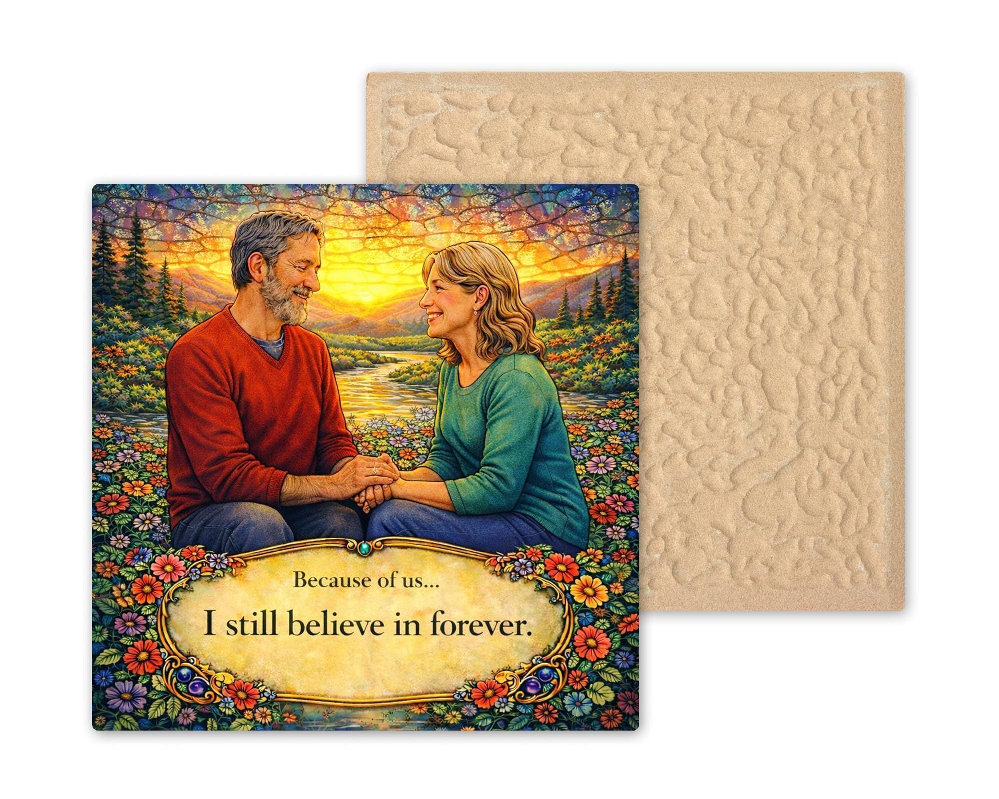 This design captures that sentiment through glowing sunset light, mountain landscapes, and two people choosing each other again and again. The vibrant flowers surrounding the couple represent growth and renewal, while the warm sky reflects hope and lasting devotion.