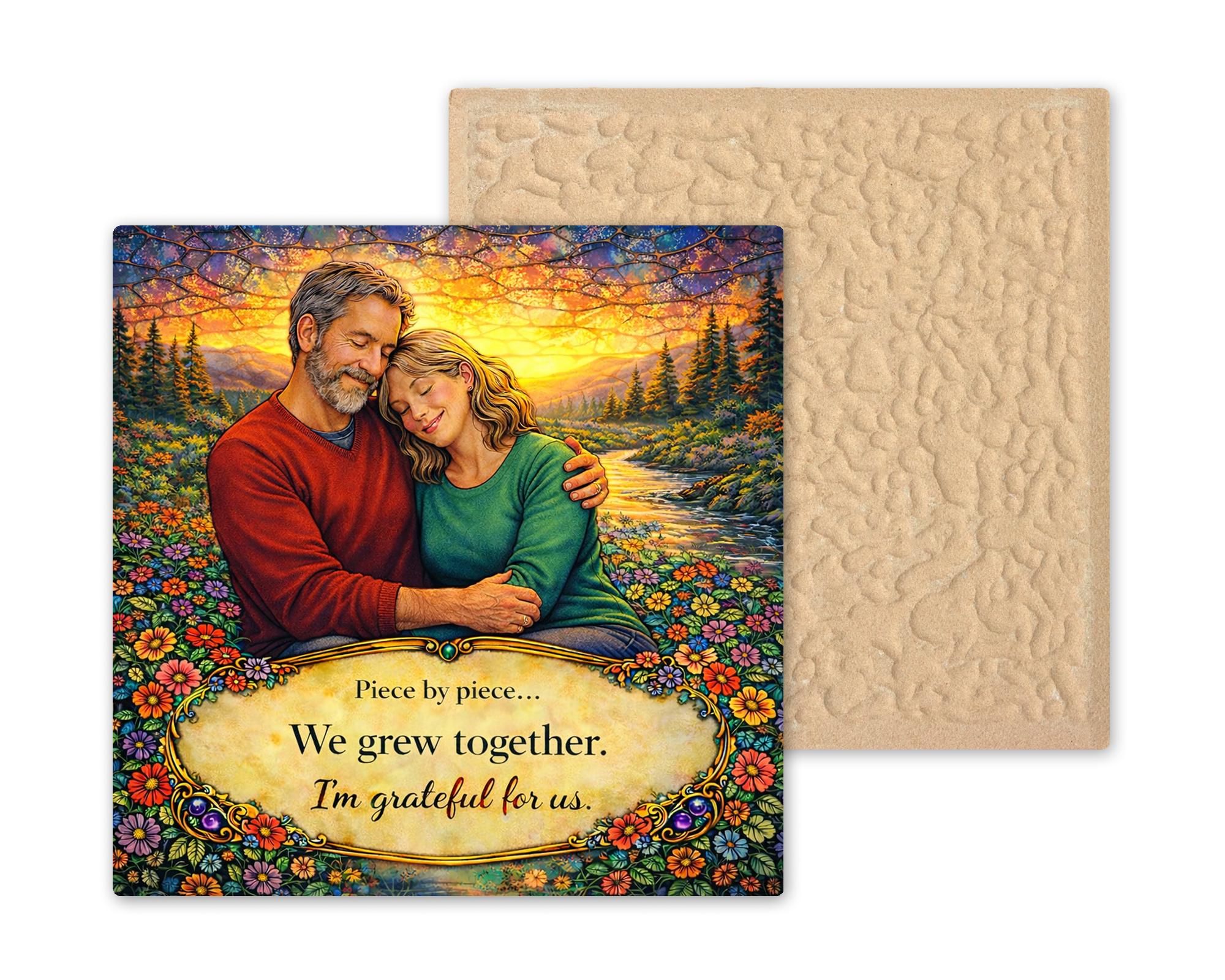 This design reflects that journey. The embracing couple, the glowing horizon, and the blooming landscape all symbolize a relationship strengthened by time.