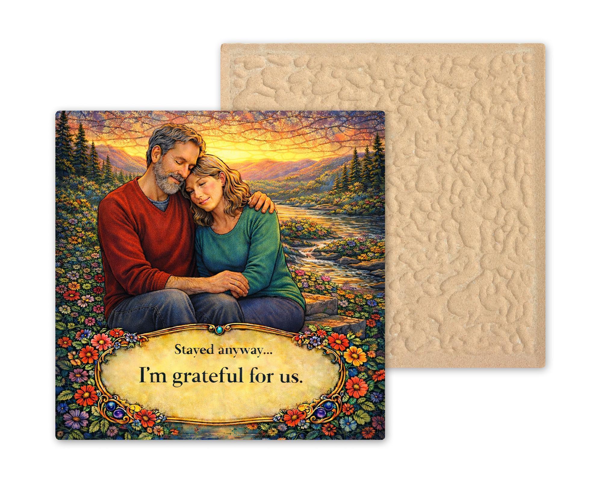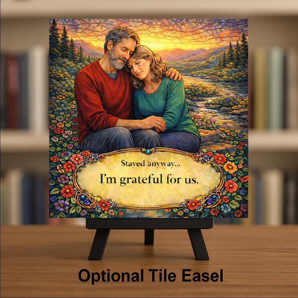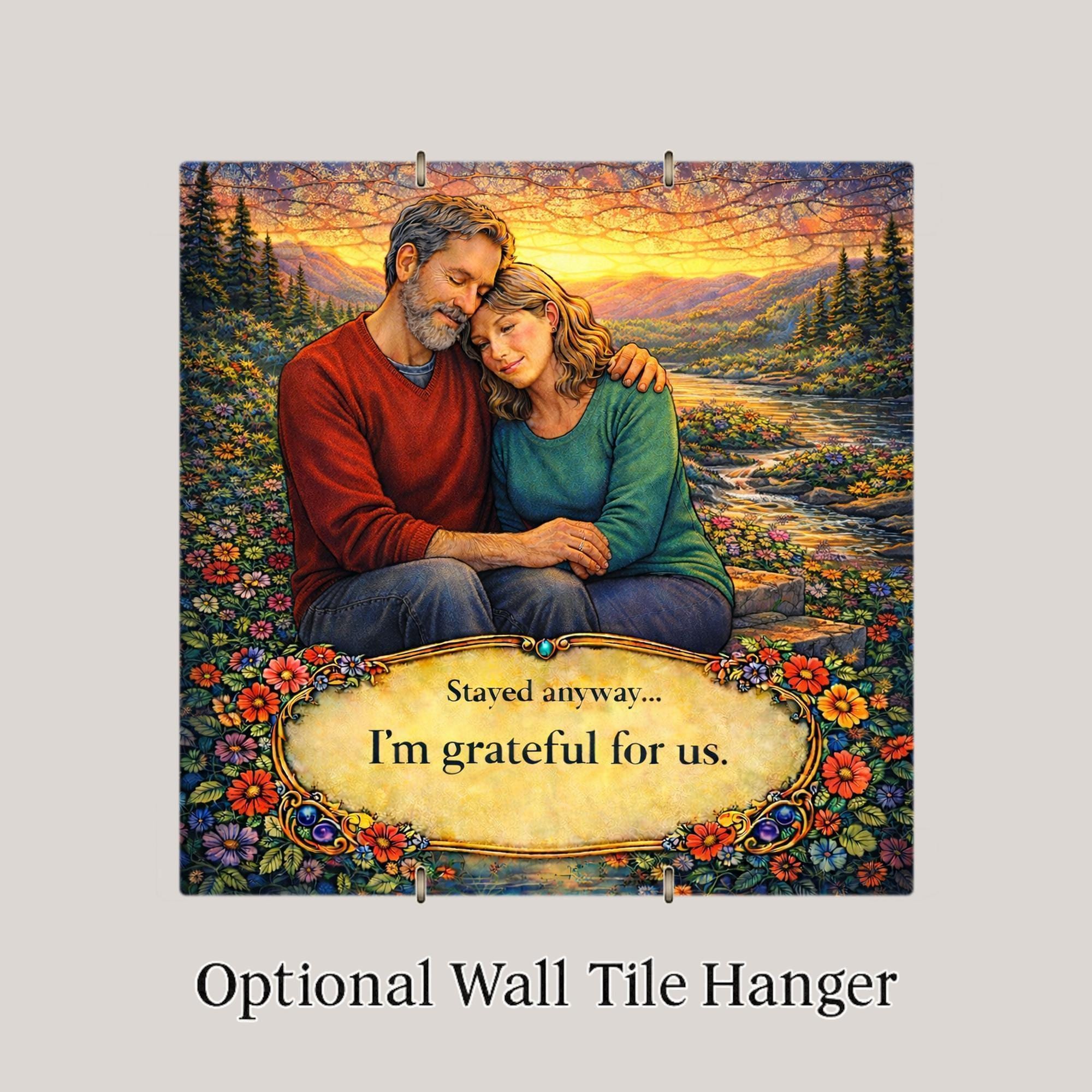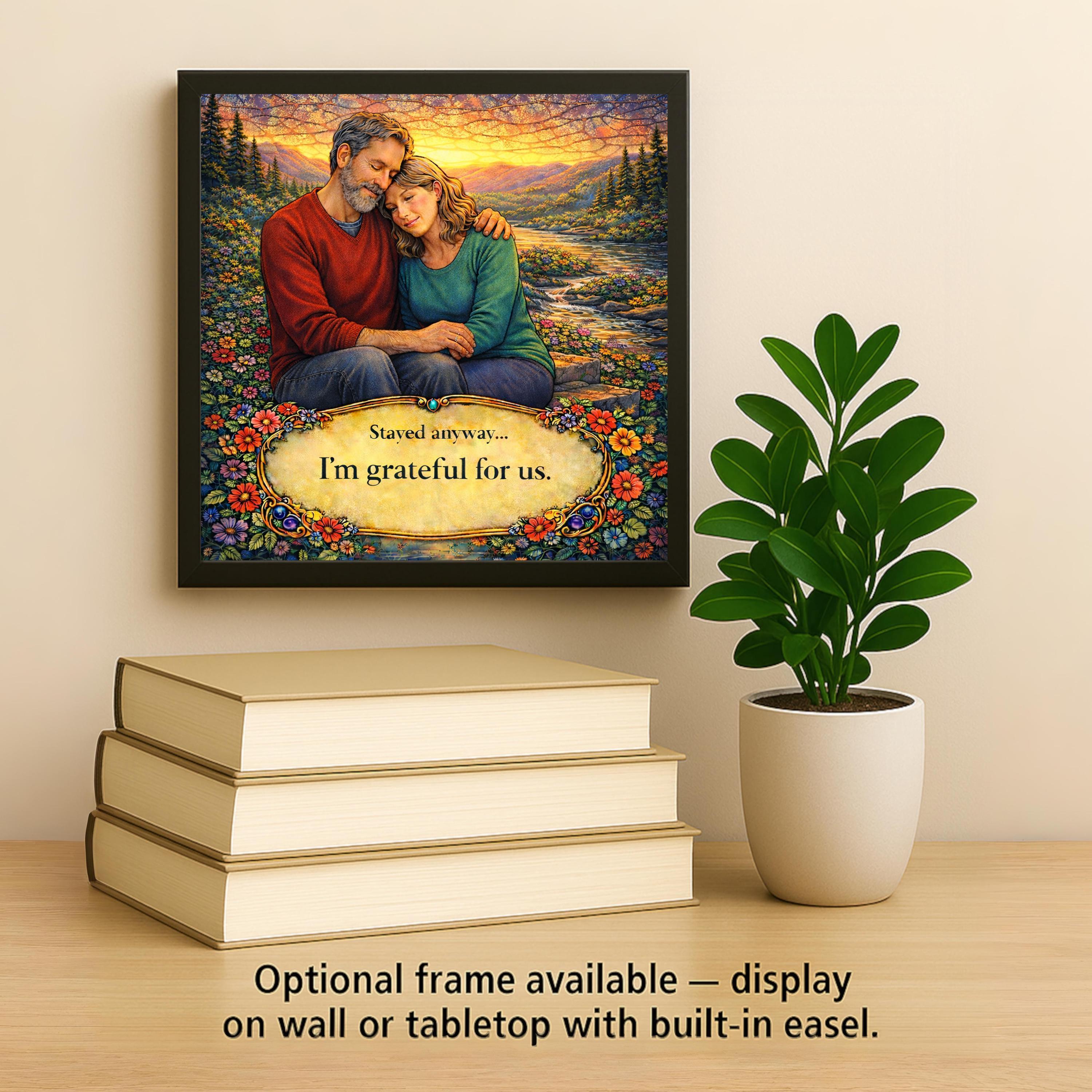 “Stayed anyway” speaks to couples who understand that commitment is built through patience, forgiveness, and growth. The sunset backdrop reflects renewal and hope, while the embracing figures symbolize comfort and connection.