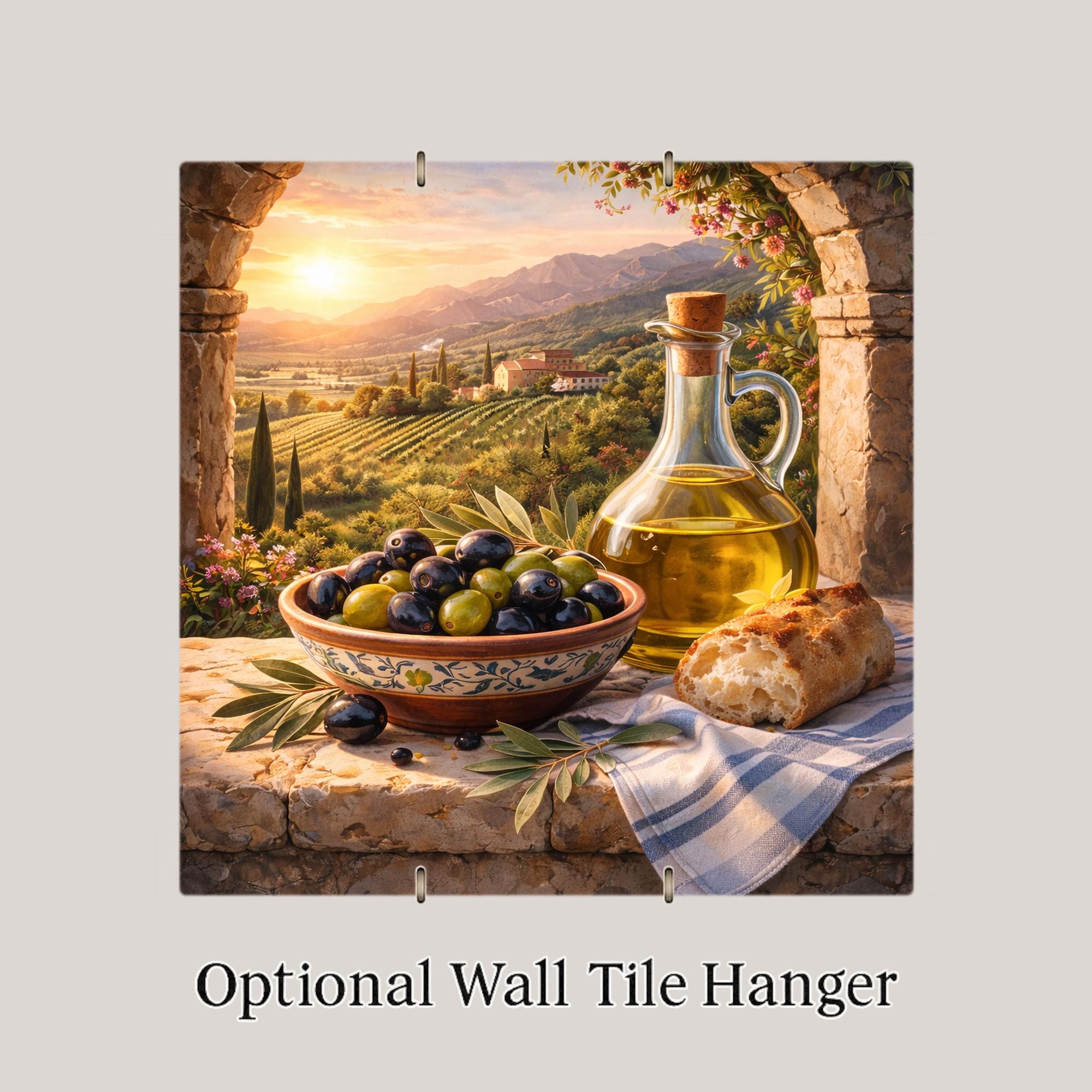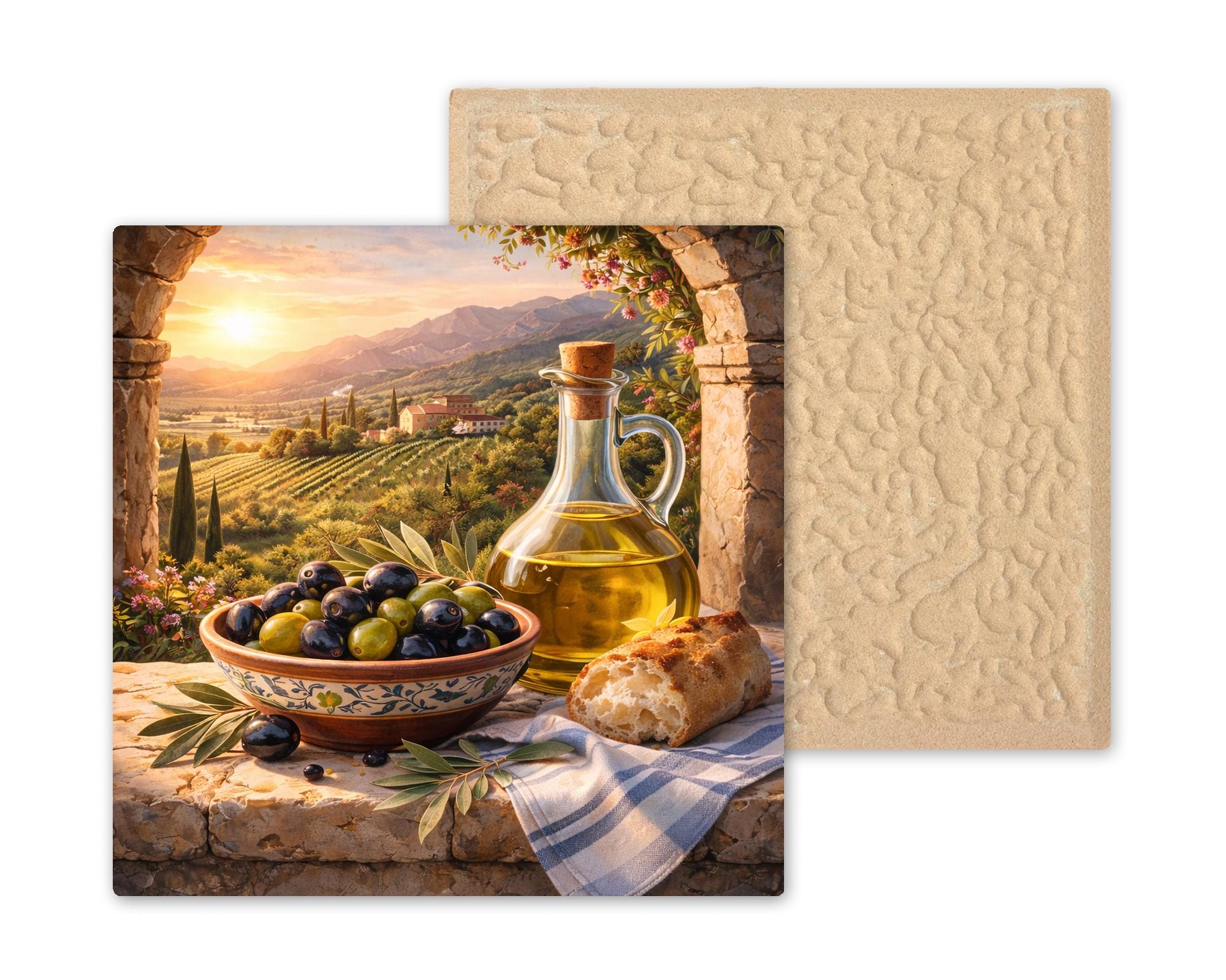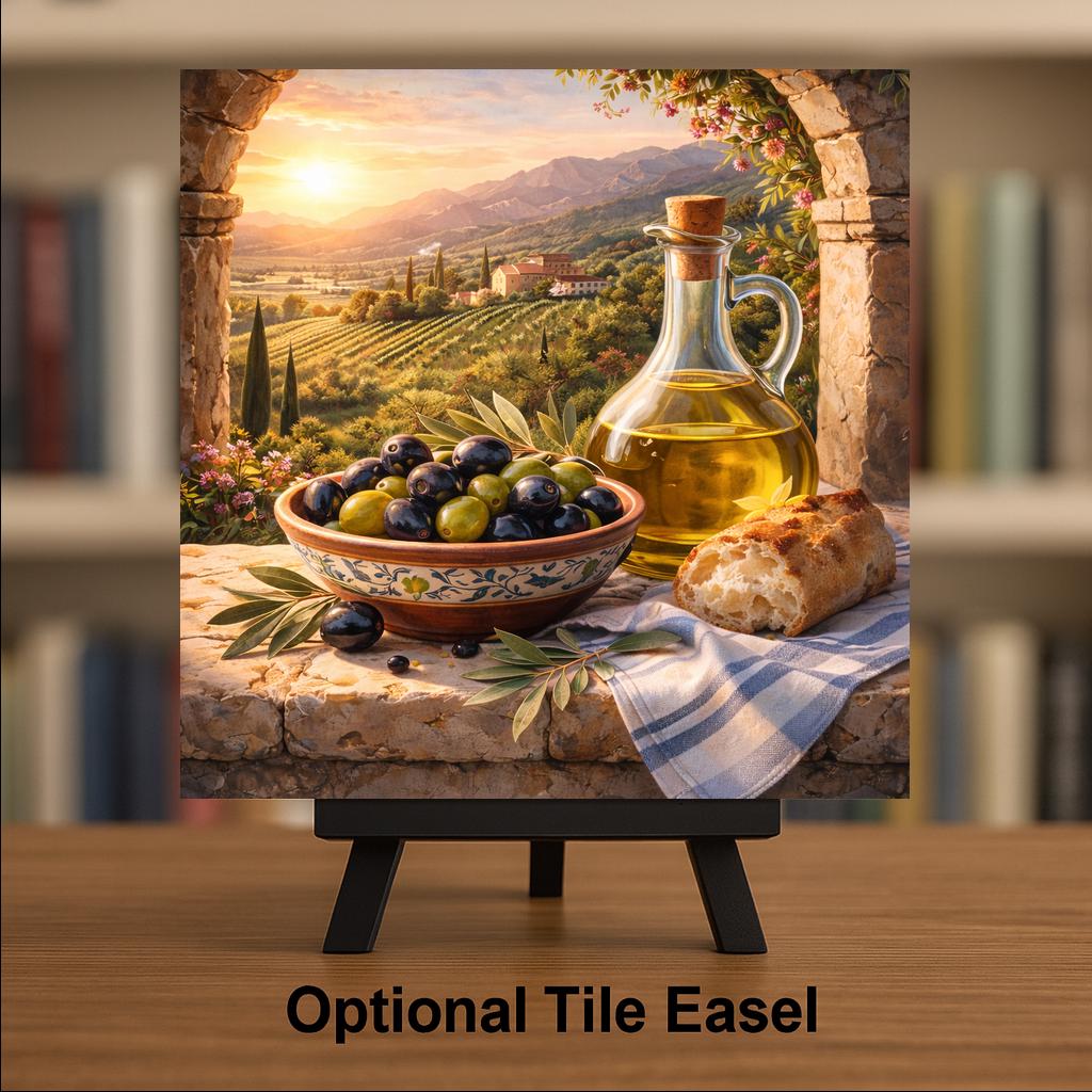 Inspired by golden hour in the Tuscan countryside, this olive harvest ceramic tile captures the ritual and simplicity of Mediterranean living. The soft glow of sunset illuminates vineyard rows and distant hills while fresh olives and olive oil create a timeless kitchen scene rooted in tradition.