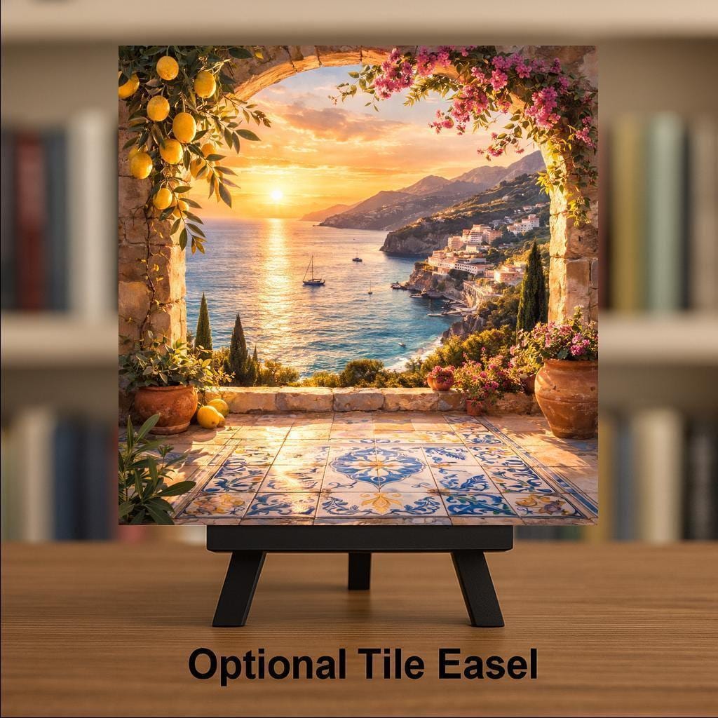 As part of a Mediterranean collection, this piece pairs beautifully with olive grove still lifes and coastal landscape tiles for a curated, travel-inspired wall decor story. Display as a standalone statement or as part of a three-tile bundle for a complete European coastal scene.